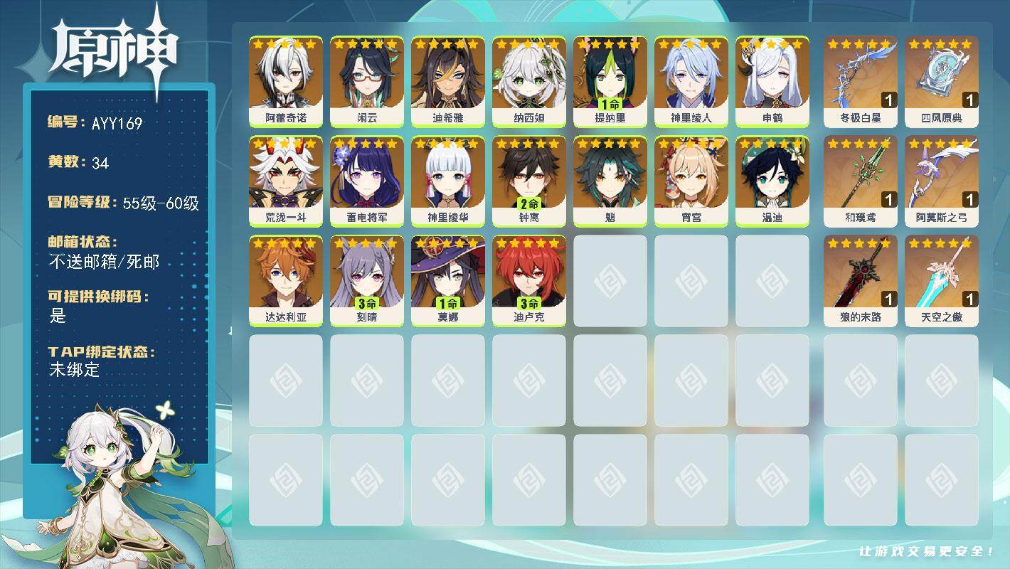 [15079592]59级/34黄/男主/18个五星角色/6个五星武器 0命阿蕾奇诺,0命闲云,0命迪希雅,0命纳西妲,1命提纳里,0命神里绫人,0命申鹤,0命荒泷一斗,0命雷电将军,0命神里绫华,2命钟离,0命魈,0命宵宫,0命温迪,0命达达利亚,3命刻晴,1命莫娜,3命迪卢克,精1冬极白星,精1四风原典,精1和璞鸢,精1阿莫斯之弓,精1狼的末路,精1天空之傲
