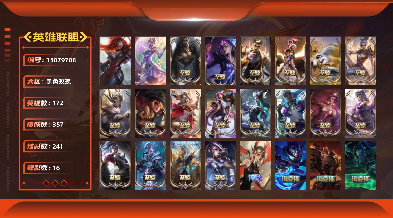 黄金段位-172英雄-357皮肤-241炫彩-2终极-26神话-54限定-42传说-48史诗