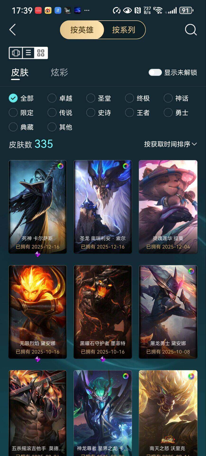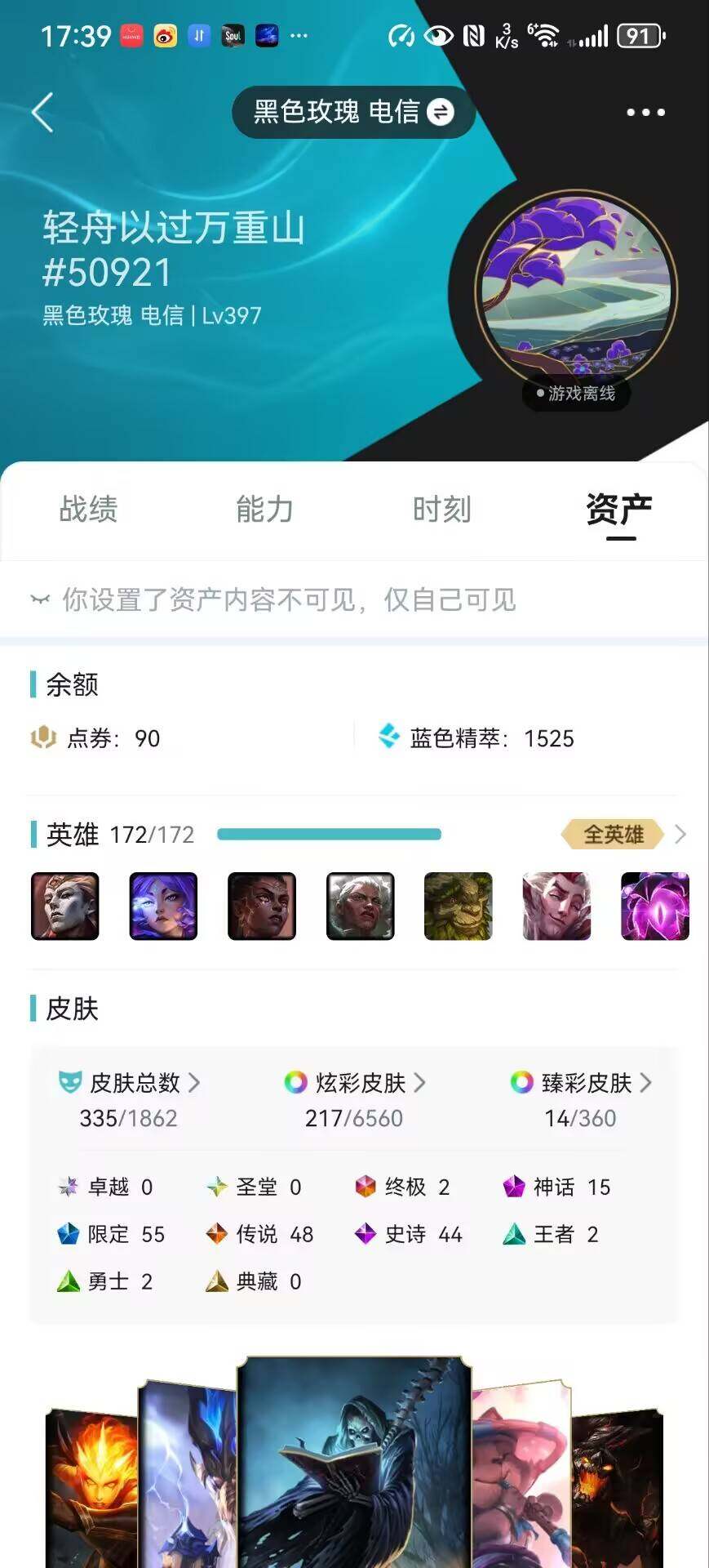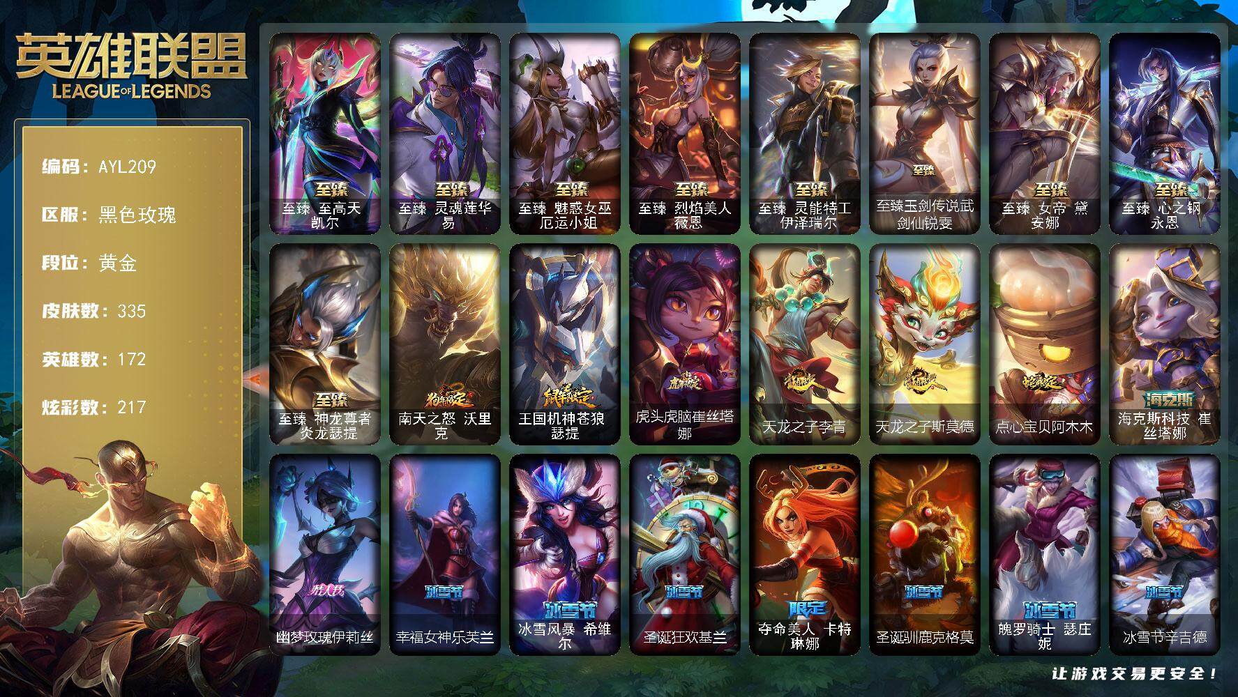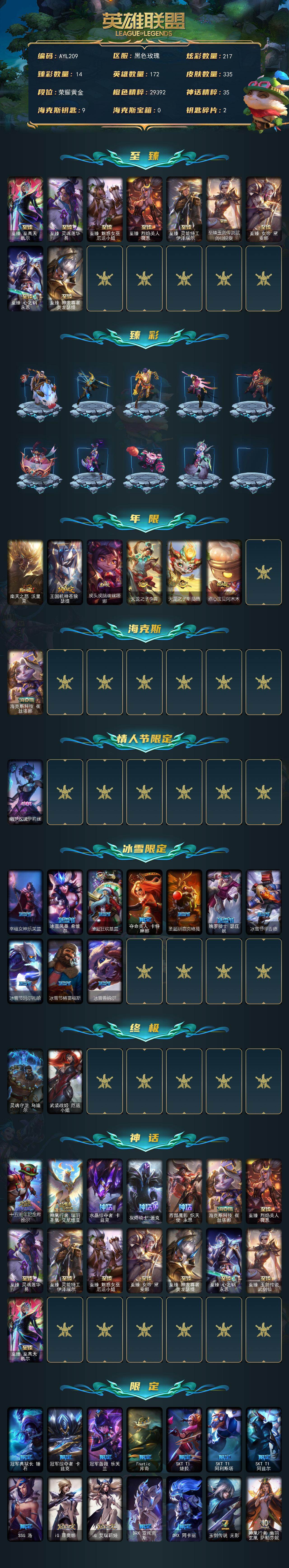 [15079740]【特价出售/店主推荐】黄金段位-172英雄-335皮肤-217炫彩-2终极-15神话-55限定-48传说-44史诗