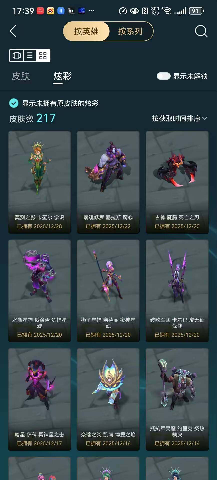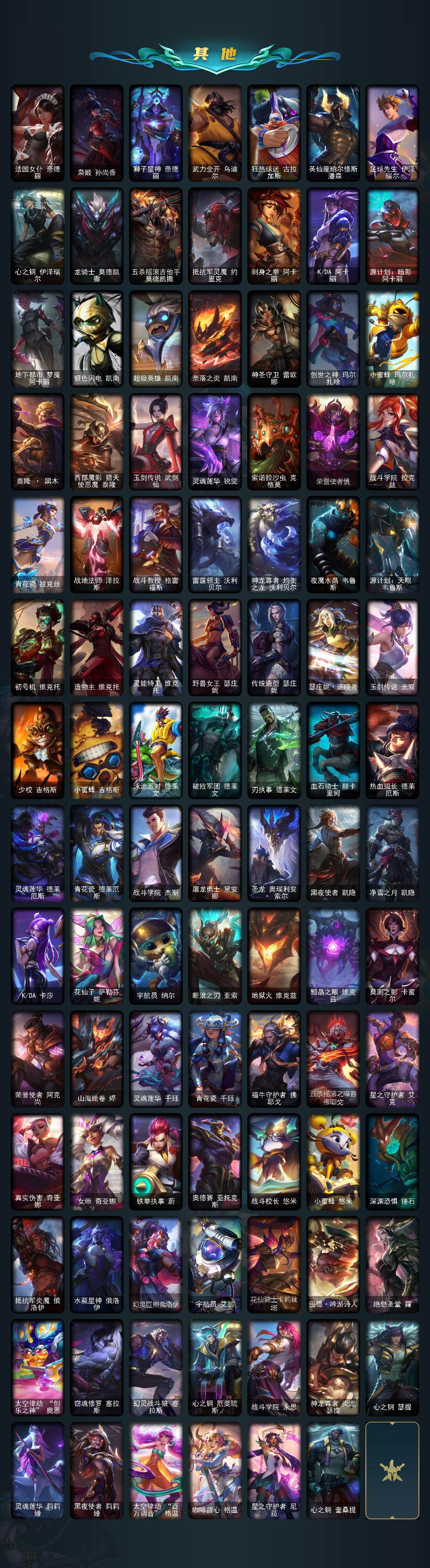 【臻彩皮肤】:天龙之子卡莎飞龙乘云,无畏骑士瑟庄妮赤子初心,冠军之矛卡莉丝塔凯旋圣装,神龙尊者圣龙李青龙腾云起,玉剑传说无影竞星,黎明使者锐雯黑夜使者,玉剑传说琴仙子丁香,星之守护者金克丝黑洞,可爱可爱粉红红布里茨,星之守护者阿卡丽热情之光,魔女阿卡丽虚荣,净雪之月莫甘娜冬虹,灌篮高手德莱厄斯金色神话