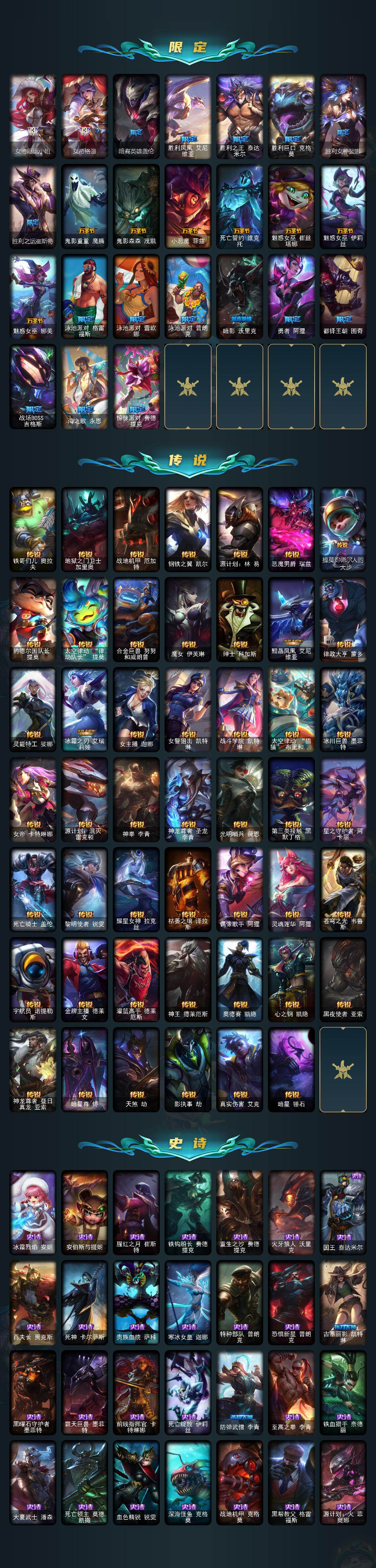 【冰雪限定】:幸福女神乐芙兰,冰雪风暴希维尔,圣诞狂欢基兰,夺命美人卡特琳娜,圣诞驯鹿克格莫,魄罗骑士瑟庄妮,冰雪节辛吉德,冰雪节玛尔扎哈,冰雪节格雷福斯,冰雪兽纳尔