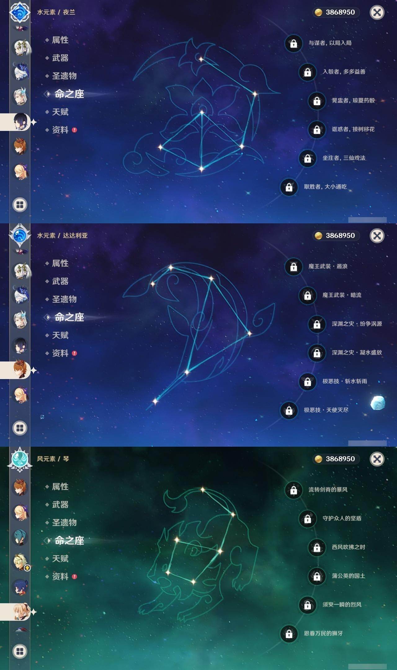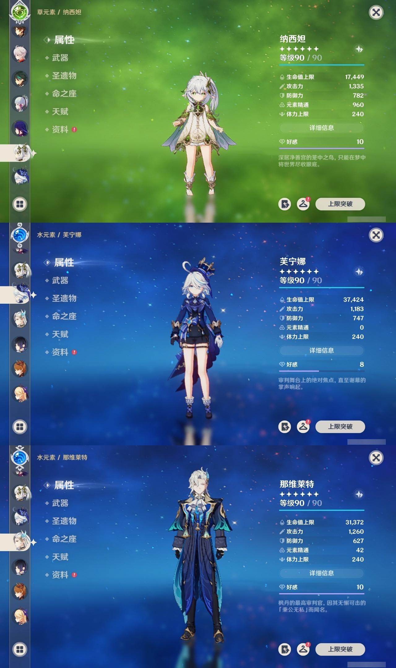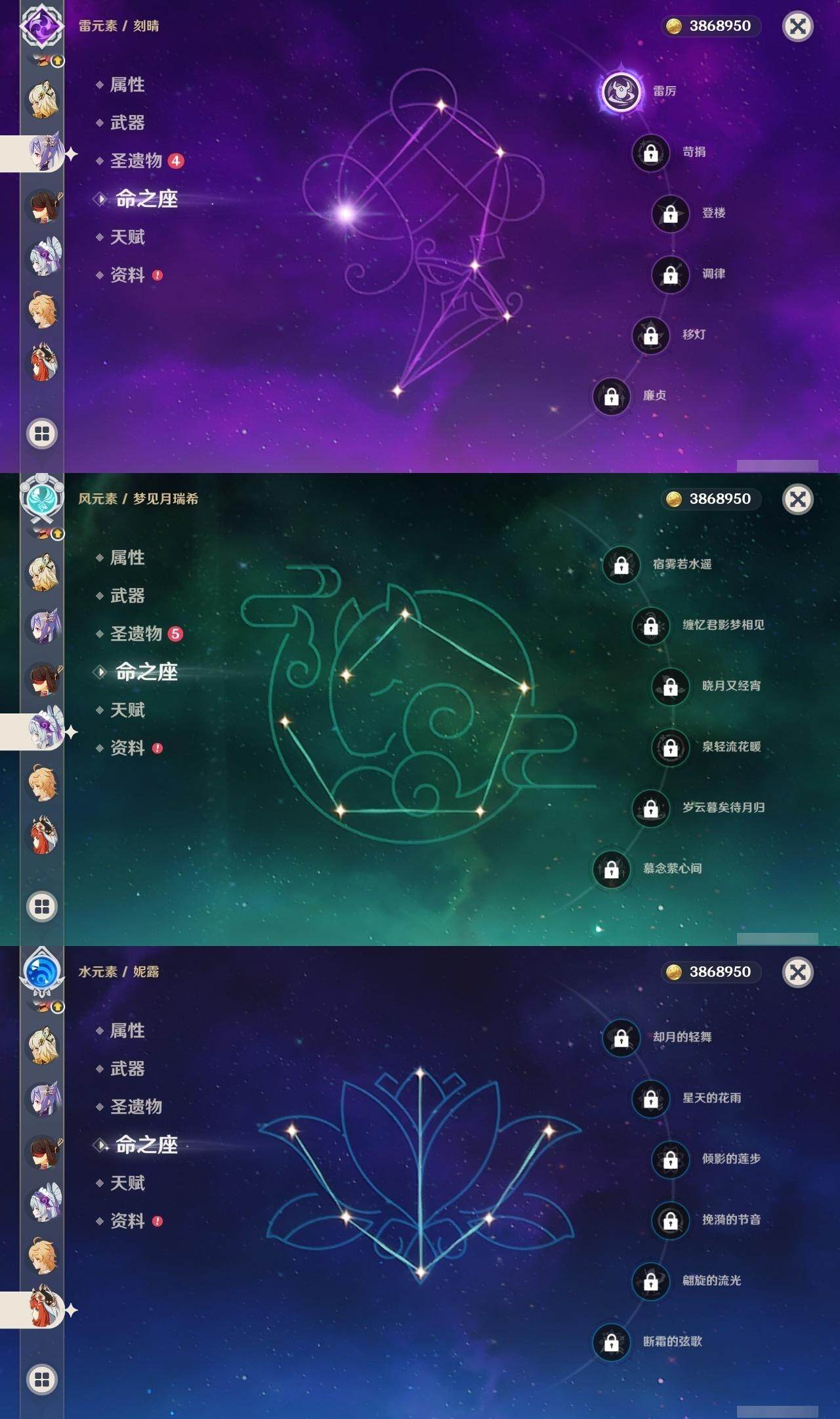 0命芙宁娜,1命那维莱特,0命迪希雅,0命纳西妲,0命妮露,0命提纳里,0命夜兰,1命雷电将军,0命枫原万叶,0命神里绫华,0命钟离,0命甘雨,0命魈,0命达达利亚,1命刻晴,0命琴,4命莫娜,0命希诺宁,0命梦见月瑞希,0命菲林斯,精1静水流涌之辉,精2若水,精1飞雷之弦振,精1雾切之回光,精2四风原典,精1和璞鸢,精1贯虹之槊,精1阿莫斯之弓