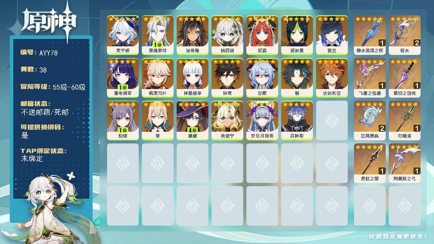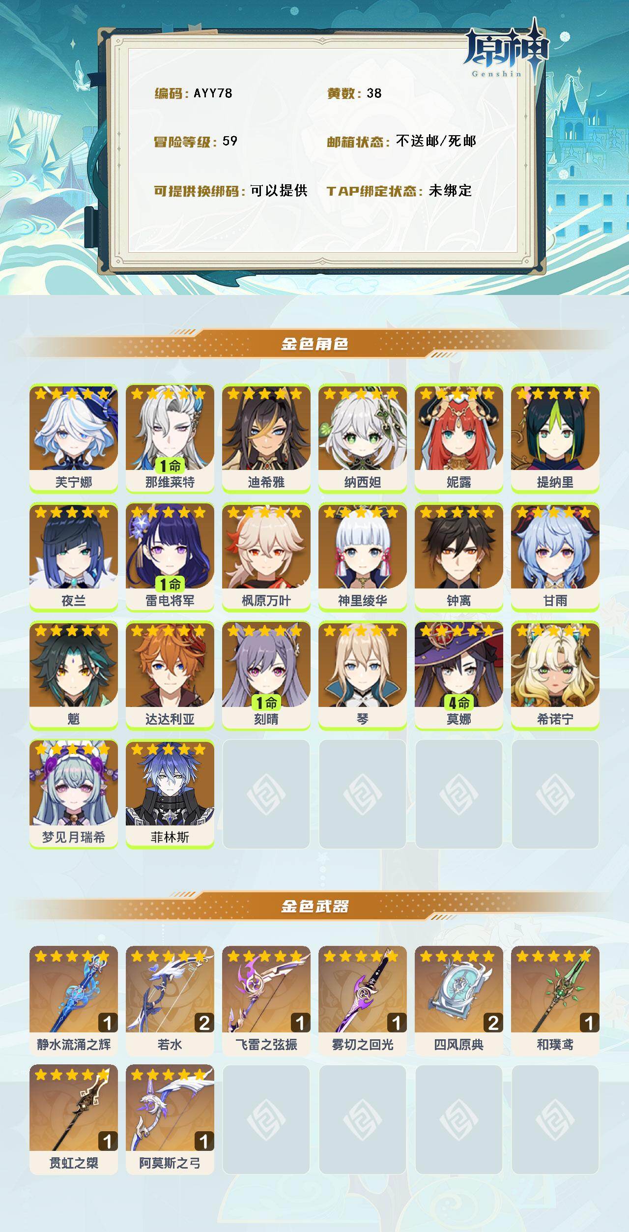 [15079774]59级/38黄/男主/20个五星角色/9个五星武器 0命芙宁娜,1命那维莱特,0命迪希雅,0命纳西妲,0命妮露,0命提纳里,0命夜兰,1命雷电将军,0命枫原万叶,0命神里绫华,0命钟离,0命甘雨,0命魈,0命达达利亚,1命刻晴,0命琴,4命莫娜,0命希诺宁,0命梦见月瑞希,0命菲林斯,精1静水流涌之辉,精2若水,精1飞雷之弦振,精1雾切之回光,精2四风原典,精1和璞鸢,精1贯虹之槊,精1阿莫斯之弓