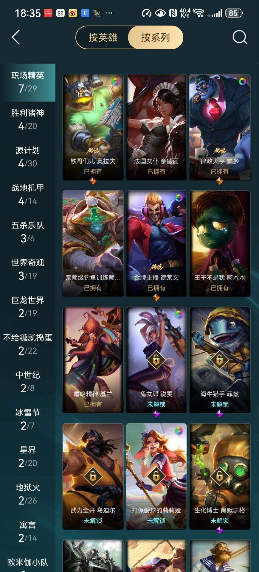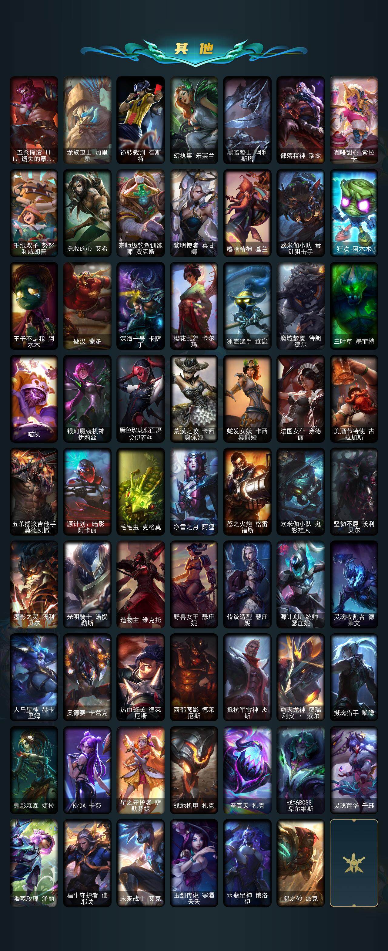 【其他皮肤1】:五杀摇滚III遗失的章节奥拉夫,龙族卫士加里奥,逆转裁判崔斯特,幻执事乐芙兰,黑暗骑士阿利斯塔,部落精神瑞兹,咖啡甜心索拉卡,千纸双子努努和威朗普,勇敢的心艾希,宗师级钓鱼训练师贾克斯,黎明使者莫甘娜,嘻哈精神基兰,欧米伽小队毒针狙击手,狂欢阿木木,王子不是我阿木木,硬汉蒙多,深海一号卡萨丁,樱花乱舞卡尔玛,冰壶选手维迦,魔域梦魇特朗德尔,三叶草墨菲特,喵凯,银河魔装机神伊莉丝,黑色玫瑰假面舞会伊莉丝,荒漠之咬卡西奥佩娅,蛇发女妖卡西奥佩娅,法国女仆奈德丽,美酒节特使古拉加斯,五杀摇滚吉他手莫德凯撒,源计划暗影阿卡丽,毛毛虫克格莫,净雪之月阿狸,怒之火炮格雷福斯,欧米伽小队鬼影蛙人,坚韧不屈沃利贝尔,