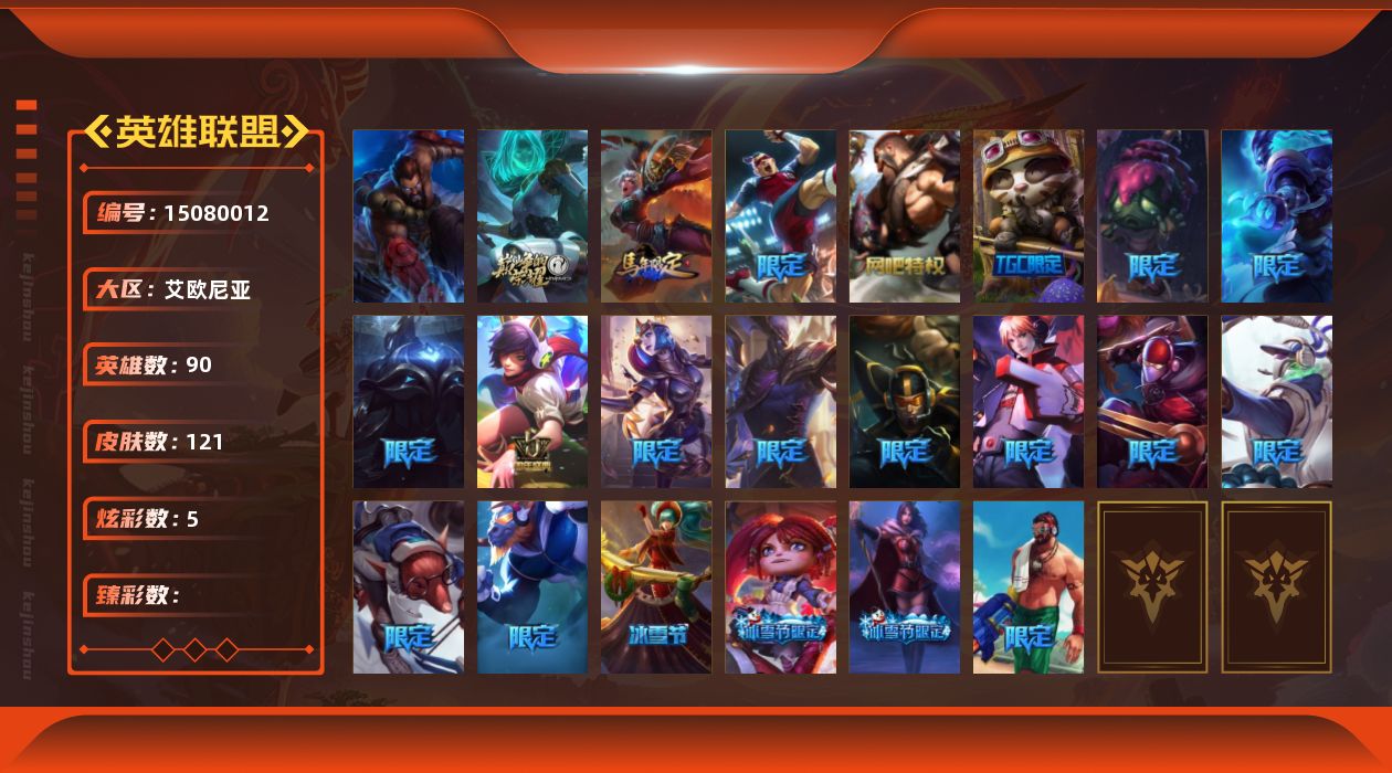 [15080012]【特价出售/店主推荐】未定级段位-90英雄-121皮肤-5炫彩-1终极-1神话-24限定-11传说-34史诗