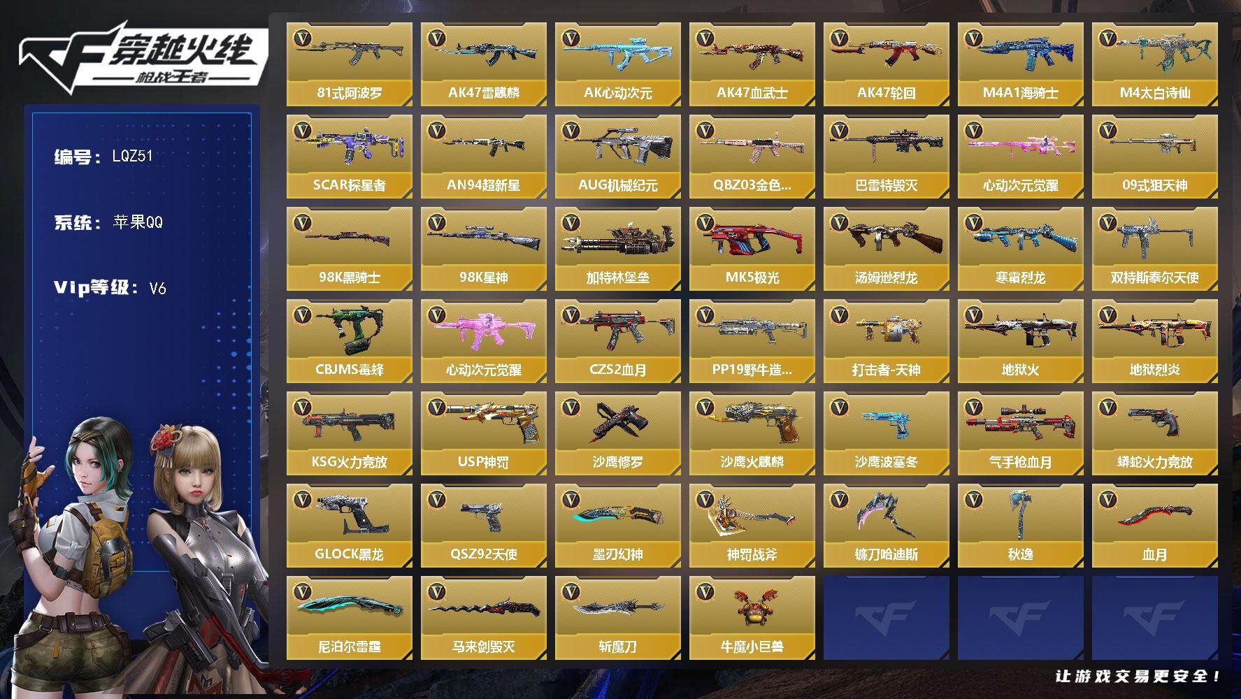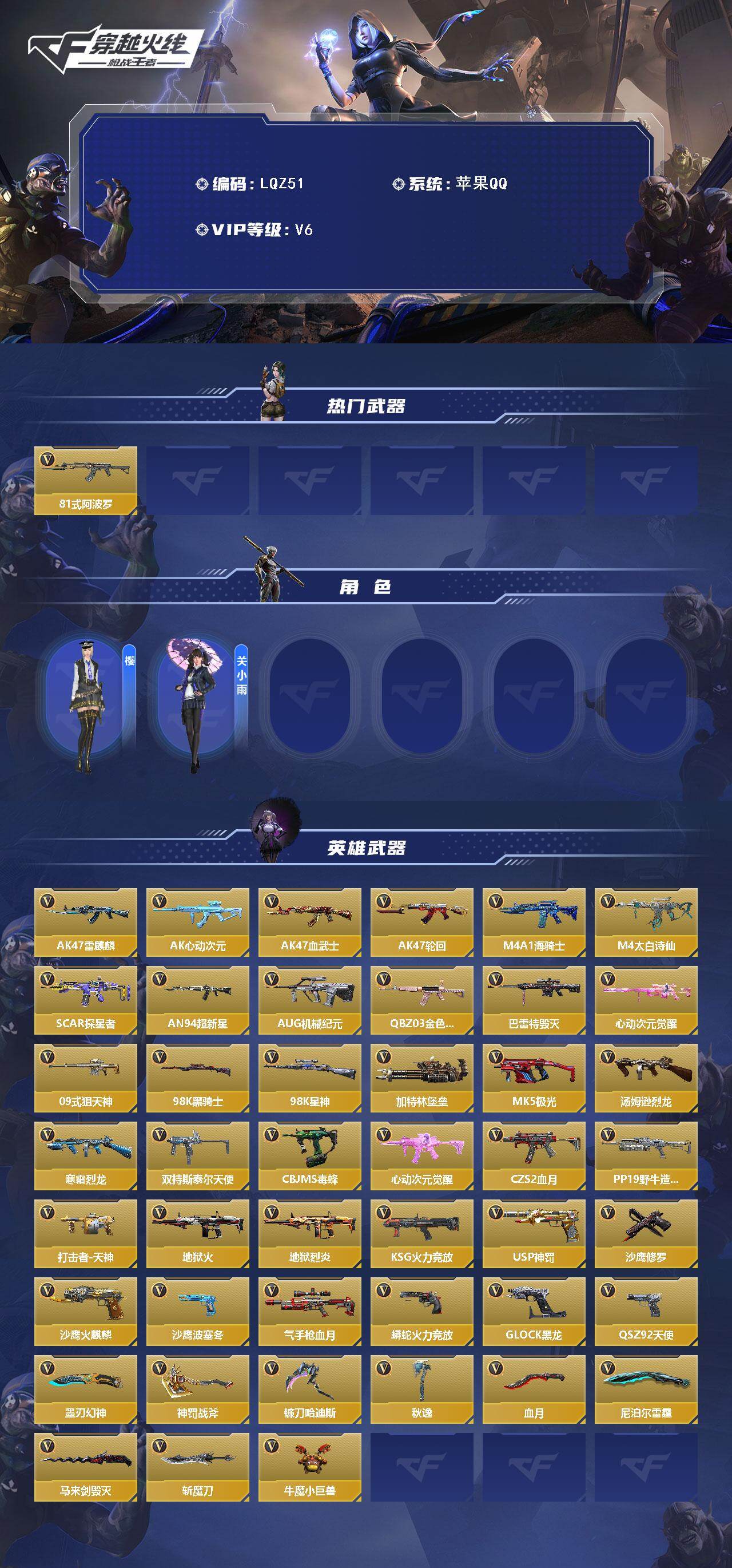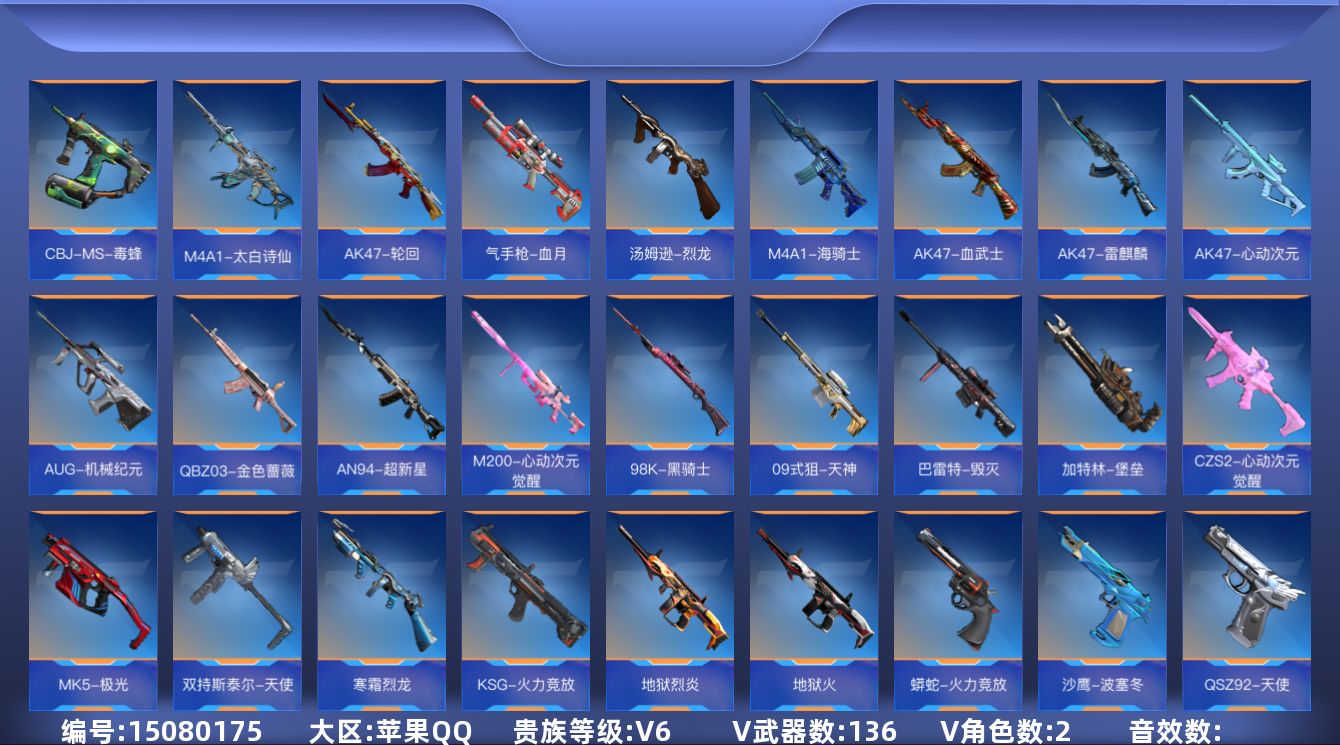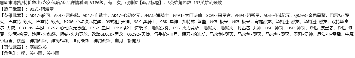[15080175]暑期末清货/特价急出/永久包赔/商品详情看图 VIP6级,有二次,可排位3英雄角色数-133英雄武器数 【热门武器】:81式-阿波罗 【英雄武器】:AK47-轮回,AK47-雷麒麟,AK47-血武士,AK47-心动次元,M4A1-海骑士,M4A1-太白诗仙,SCAR-探星者,AN94-超新星,AUG-机械纪元,QBZ03-金色蔷薇,巴雷特-毁灭,巴雷特-毁灭,巴雷特-毁灭,M200-心动次元觉醒,09式狙-天神,98K-黑骑士,98K-星神,加特林-堡垒,MK5-极光,MK5-极光,寒霜烈龙,汤姆逊-烈龙,汤姆逊-烈龙,双持斯泰尔-天使,CBJ-MS-毒蜂,CZS2-心动次元觉醒,CZS2-血月,PP19野牛-造纸术,地狱烈炎,KSG-火力竞放,地狱火,地狱火,打击者-天神,USP-神罚,USP-神罚,沙鹰-波塞冬,沙鹰-修罗,沙鹰-修罗,沙鹰-火麒麟,蟒蛇-火力竞放,改装GLOCK-黑龙,QSZ92-天使,气手枪-血月,镰刀-哈迪斯,马来剑-毁灭,马来剑-毁灭,马来剑-毁灭,墨刃-幻神,尼泊尔-雷霆,牛魔小巨兽,秋逸,神罚战斧,神罚战斧,神罚战斧,神罚战斧,血月,斩魔刀 【其他武器】:寒霜烈龙 【角色】:樱,关小雨,关小雨