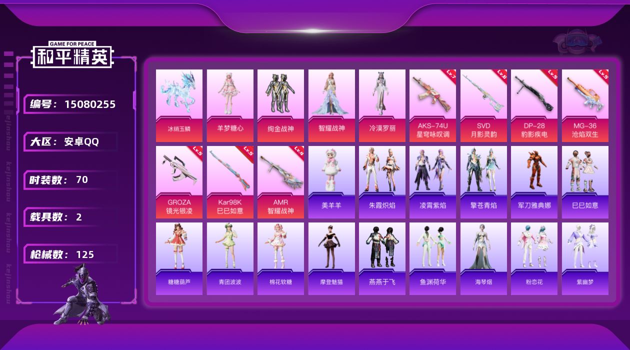 [15080255]【店主推荐捡漏号!可直接换绑】安卓 手Q-4粉装-7特效枪-2载具-2粉色飞行器-3.7w热力值-7王牌印记-70套装-125枪皮【热门品类】:角色-军刀雅典娜【粉色载具】:僚机-冰龙团团,冰绡玉鳞【粉色套装】:粉装-绚金战神,角色-智耀战神,角色-冷漠罗丽,角色-羊梦糖心【粉色枪皮等级】:GROZA-镜光银凌(五级),AKS-74U-星穹咏叹调(七级),Kar98K-巳巳如意(五级),AMR-智耀战神(四级),SVD-月影灵韵(六级),DP-28-豹影疾电(五级),MG-36-沧焰双生(五级)【粉色飞行器】:终晖之翼飞行器,灵珠游龙飞行器