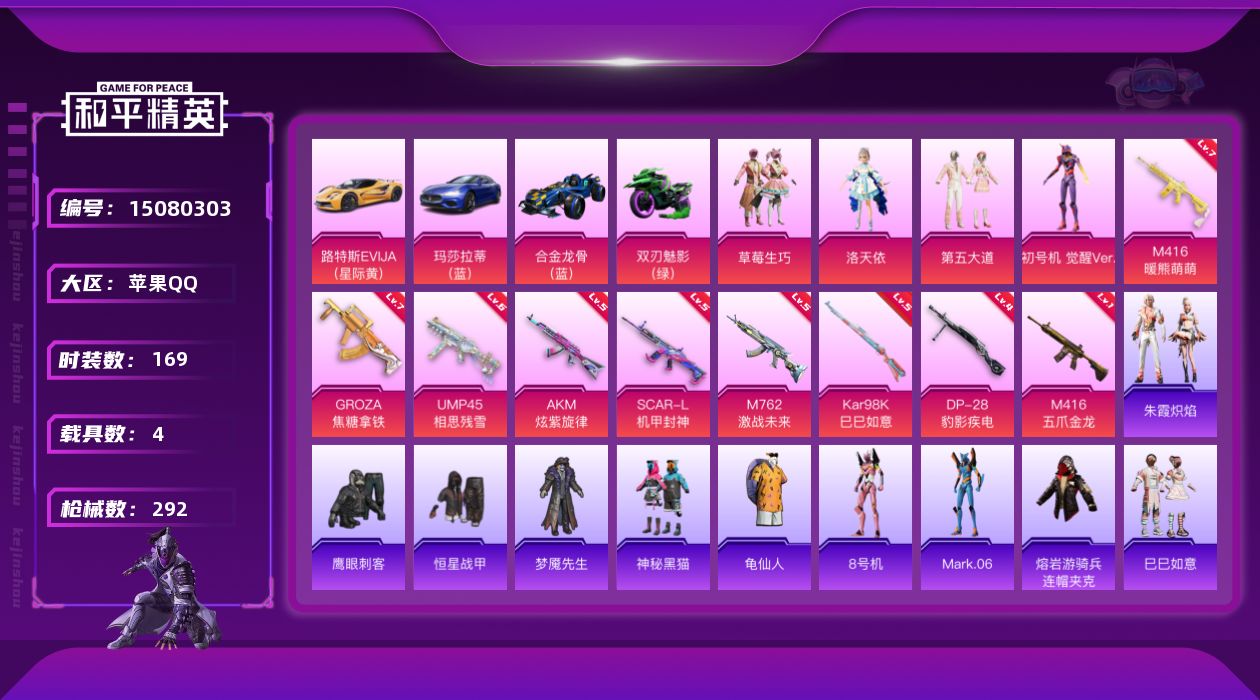 [15080303]【店主推荐捡漏号!可直接换绑】苹果 手Q-4粉装-9特效枪-4载具-1粉色飞行器-88695热力值-13王牌印记-169套装-292枪皮