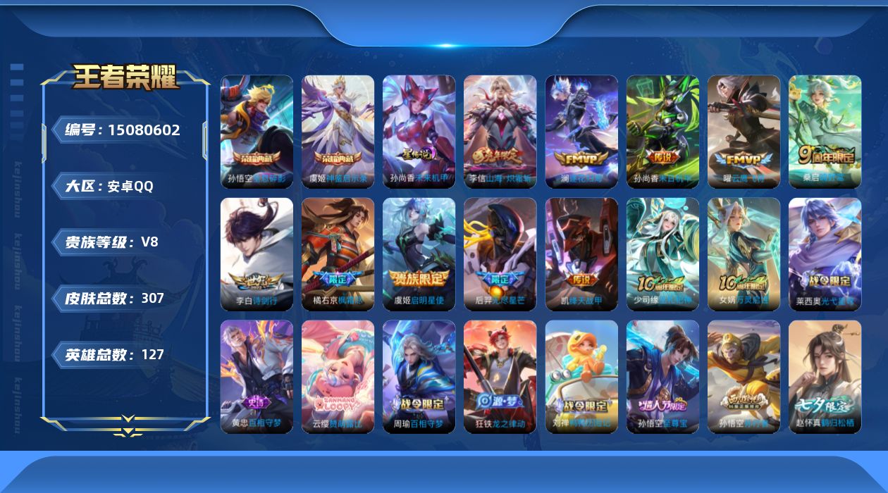 [15080602]【店主推荐捡漏号!可直接换绑】:安卓Q-V8-最强王者段位-127英雄-307皮肤-2典藏-1星元-11传说-90史诗 【英雄全皮】:孙权全皮,蒙恬全皮,金蝉全皮,空空儿全皮,影全皮 【荣耀典藏】:孙悟空全息碎影,虞姬神鉴启示录 【传说皮肤】:后羿神树通天,桑启鸣野蒿,澜逐花归海,李信山海炽霜斩,李白诗剑行,橘右京枫霜尽,后羿无尽星芒,铠绛天战甲,虞姬启明星使,曜云鹰飞将,孙尚香末日机甲 【限定皮肤】:蒙犽顽岩魄,蔡文姬夏日便利店,大乔绒语心约,虞姬夏日便利店,姜子牙天穹之誓,杨戬破阵退雄兵,狄仁杰阴阳师,赵云皇家上将,赵云龙胆,墨子降魔,孙尚香蔷薇恋人,鲁班七号狮舞东方,高渐离死亡摇滚,高渐离玩趣恶龙,钟无艳超时空战士,白起夜都怪侠,芈月幻夜卜梦,元歌无心,夏侯惇匿光决锋者,甄姬落雪兰心,马可波罗暗影游猎,马可波罗山海玄木吟,狄仁杰魔术师,达摩沙漠行僧,项羽海滩派对,韩信傲雪梅枪,王昭君午后时光,兰陵王金庭之子,橘右京枫霜尽,孙悟空美猴王,孙悟空至尊宝,孙悟空孙行者,后羿无尽星芒,李元芳云中旅人,虞姬启明星使,鬼谷子五谷丰年,黄忠火炮绅士,铠青龙志,苏烈千军破阵,百里玄策原初追逐者,梦奇顽趣,沈梦溪大漠名商,明世隐疑决卦,明世隐吟游魔法,裴擒虎擒涛扼浪,狂铁电玩高手,米莱狄胡桃异想国,云中君纤云弄巧,李信山海炽霜斩,盾山御銮,上官婉儿梁祝,嫦娥暖冬兔眠,鲁班大师探海日志,桑启海盐诗旅,金蝉唐三藏,暃星界游侠,赵怀真鹤归松栖,阿古朵江河有灵,张良古海寻踪,蒙恬荣光圣徽,鬼谷子天穹祈灯,伽罗琥珀纪元,沈梦溪龙舞盛年,刘邦剑破天穹,程咬金群星魔术团,镜青焰无极,项羽苍威无极,周瑜熔金海岸 【年限皮肤】:铠青龙志,孙悟空美猴王,赵云龙胆,马可波罗山海玄木吟,李信山海炽霜斩 【赛季限定】:达摩沙漠行僧,兰陵王金庭之子,张良古海寻踪,李元芳云中旅人,苏烈千军破阵,百里玄策原初追逐者,梦奇顽趣,沈梦溪大漠名商,明世隐疑决卦,裴擒虎擒涛扼浪,盾山御銮,鲁班大师探海日志,桑启海盐诗旅,鬼谷子天穹祈灯,蒙恬荣光圣徽,刘邦剑破天穹,姜子牙天穹之誓 【战令限定】:蔡文姬夏日便利店,虞姬夏日便利店,鲁班七号狮舞东方,钟无艳超时空战士,白起夜都怪侠,芈月幻夜卜梦,甄姬落雪兰心,马可波罗暗影游猎,王昭君午后时光,黄忠火炮绅士,明世隐吟游魔法,狂铁电玩高手,米莱狄胡桃异想国,嫦娥暖冬兔眠,暃星