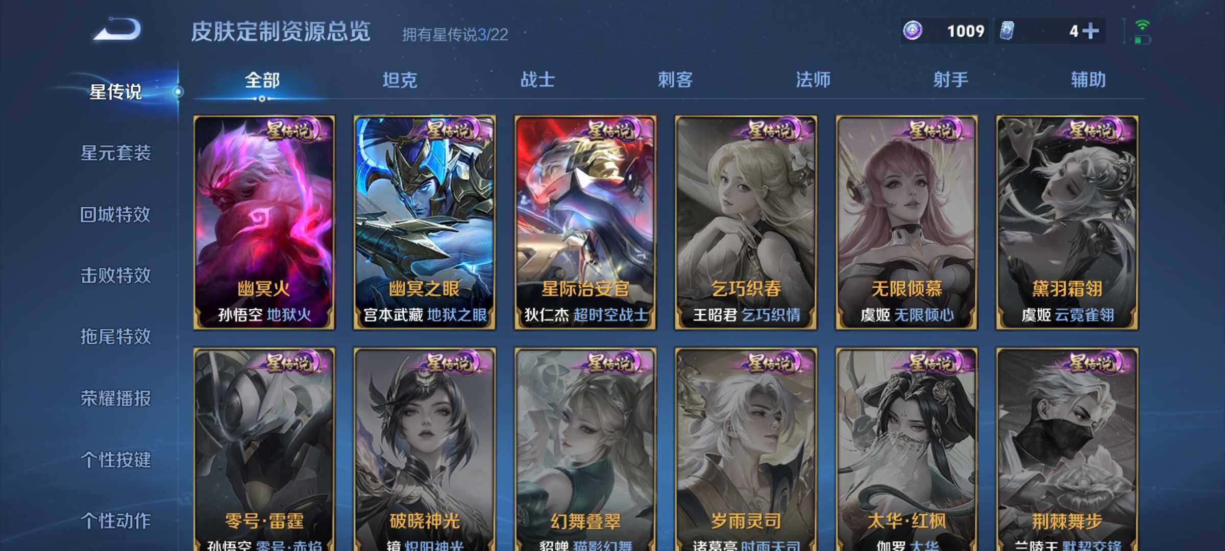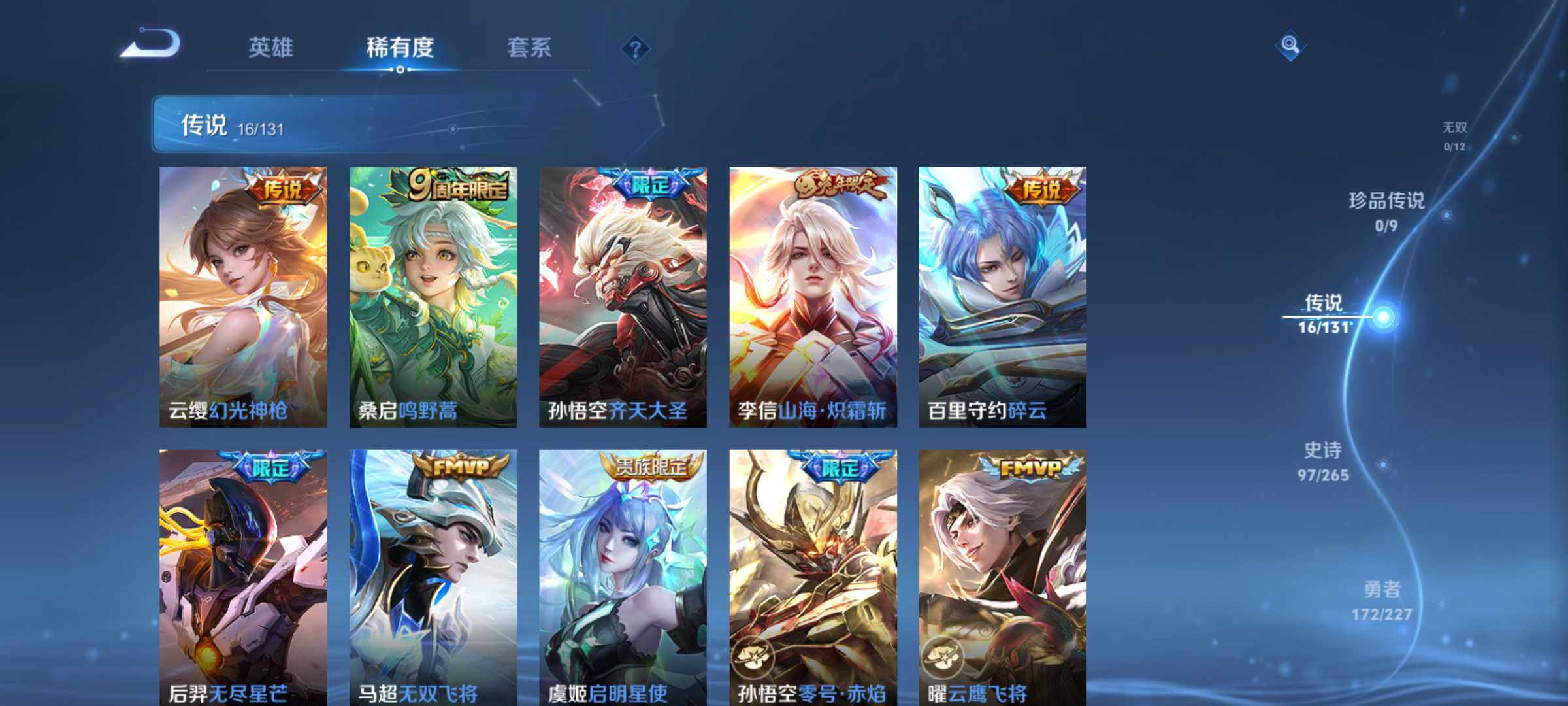 【传说皮肤】:云缨幻光神枪,桑启鸣野蒿,孙悟空齐天大圣,李信山海炽霜斩,百里守约碎云,后羿无尽星芒,马超无双飞将,虞姬启明星使,孙悟空零号赤焰,曜云鹰飞将,李信一念神魔,达摩黄金狮子座,百里玄策白虎志,李白凤求凰,宫本武藏地狱之眼,孙悟空地狱火