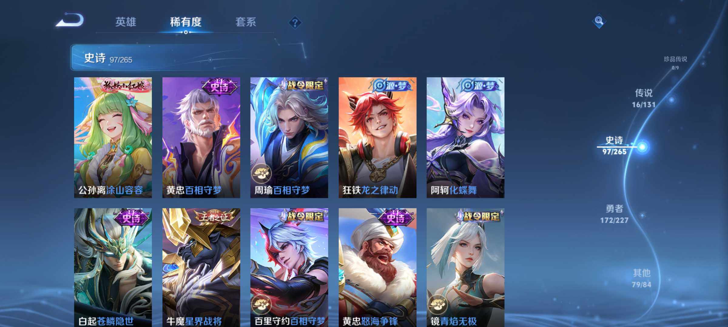 白起狰,太乙真人饕餮,曹操烛龙,芈月重明,典韦穷奇,狂铁御狮,米莱狄御霄,牛魔御旌,盾山御銮,夏侯惇朔风刀,明世隐疑决卦,老夫子醍醐杖,鬼谷子原初探秘者,狄仁杰万华元夜,程咬金演武夺筹,钟馗驱傩正仪,吕布猎兽之王,嬴政白昼王子,女娲朔望之晖,典韦蓝屏警告,钟馗神迹守卫,鲁班七号狮舞东方,沈梦溪星空之诺,李元芳银河之约,刘邦夺宝奇兵,元歌云间偶戏,弈星混沌棋,达摩沙漠行僧,兰陵王金庭之子,沈梦溪大漠名商,李元芳云中旅人,桑启海盐诗旅,裴擒虎擒涛扼浪,鲁班大师探海日志,张良古海寻踪,项羽苍威无极,镜青焰无极
