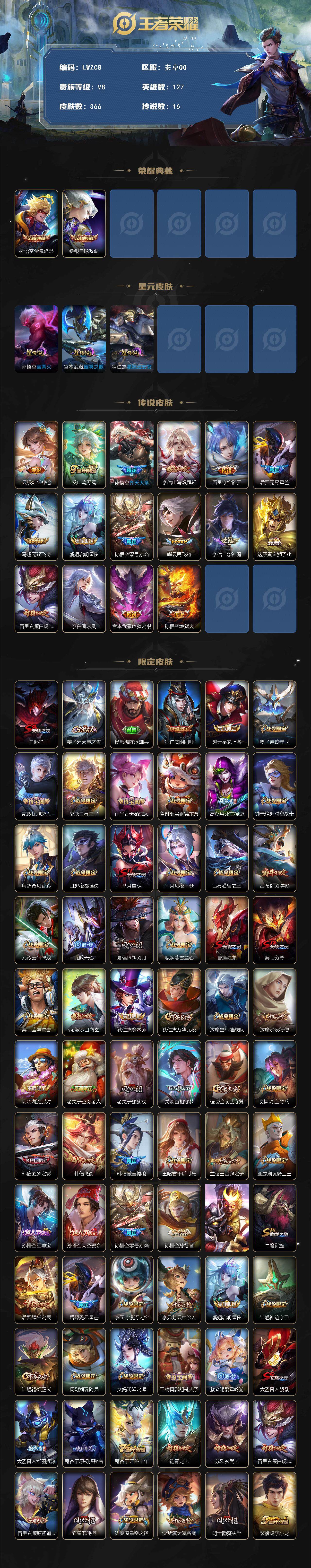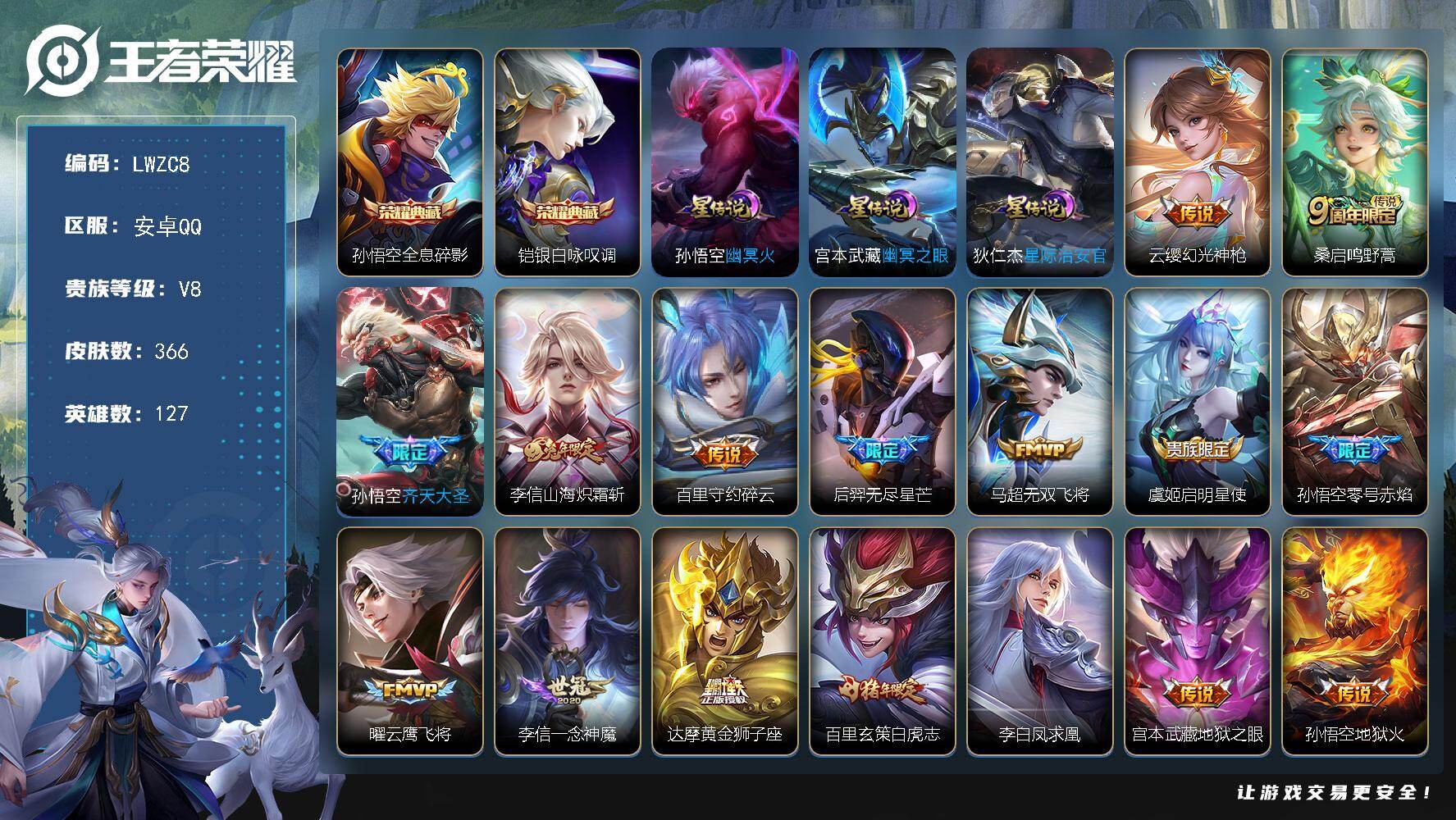[15080608]【特价出售/店主推荐】安卓Q-V8-至尊星耀II段位-127英雄-366皮肤-2典藏皮肤-3星传说-16传说-97史诗