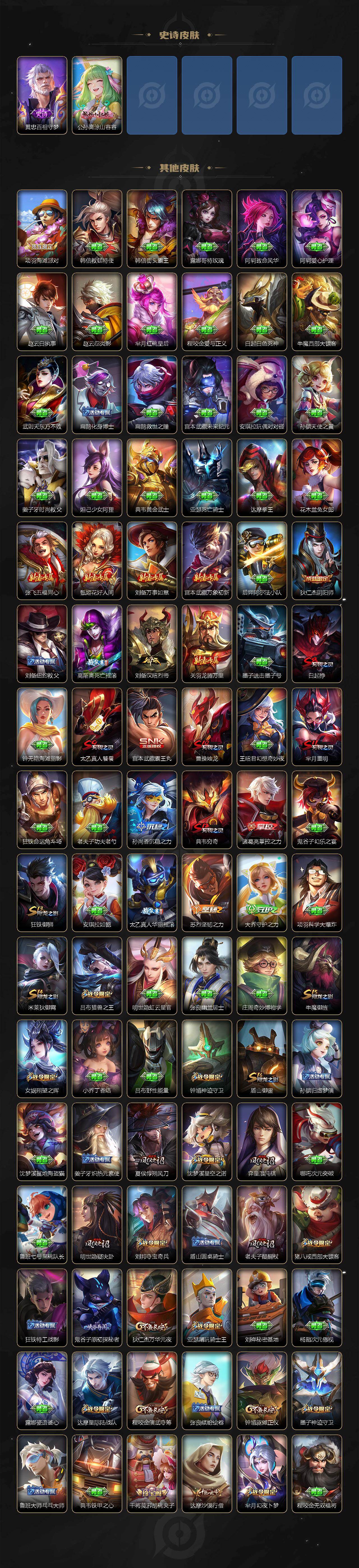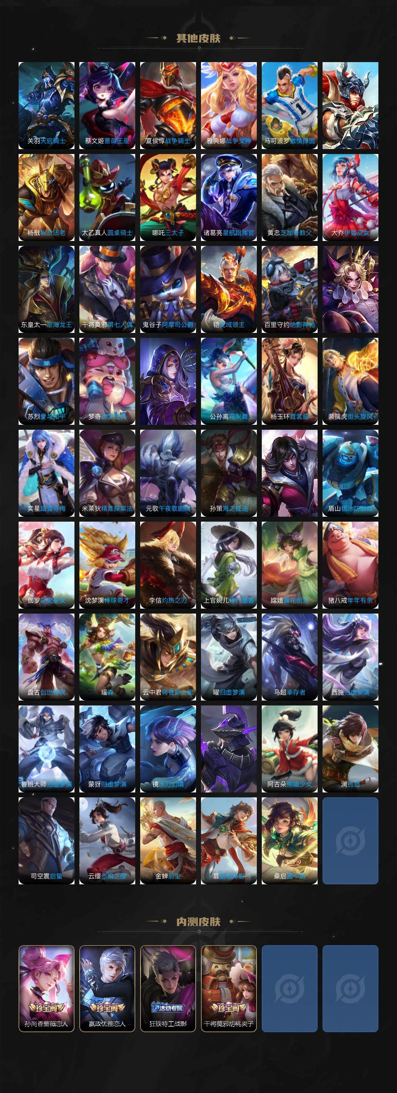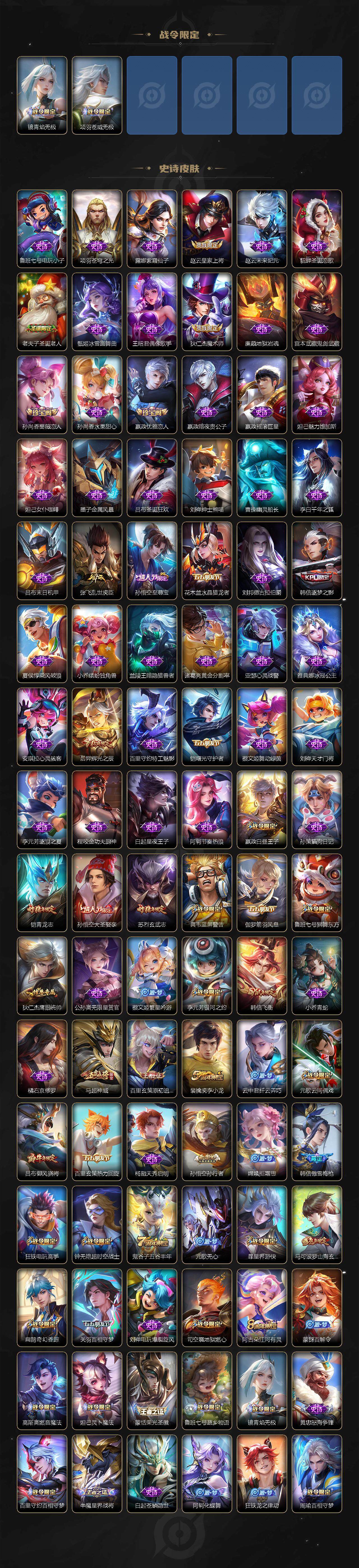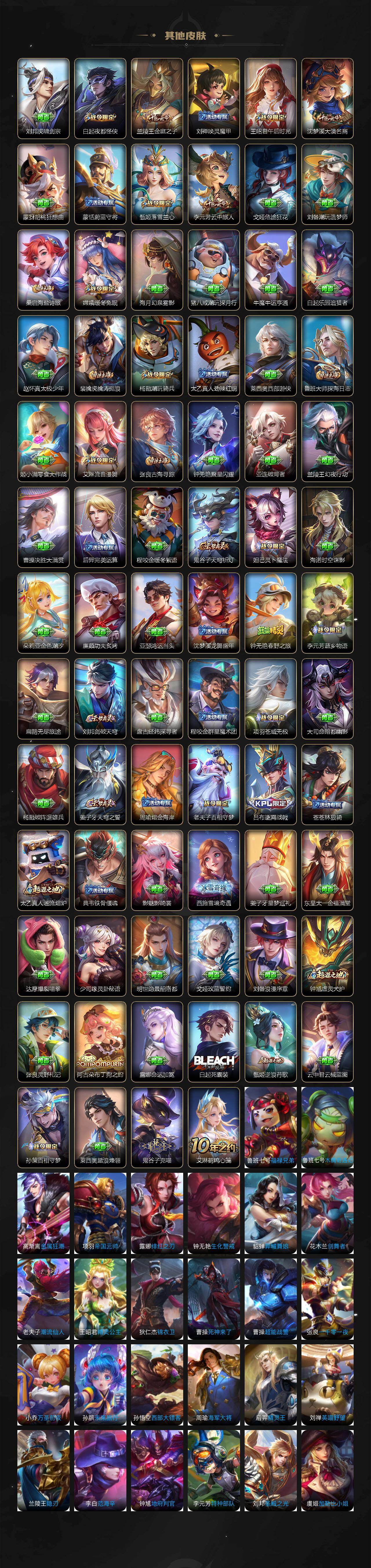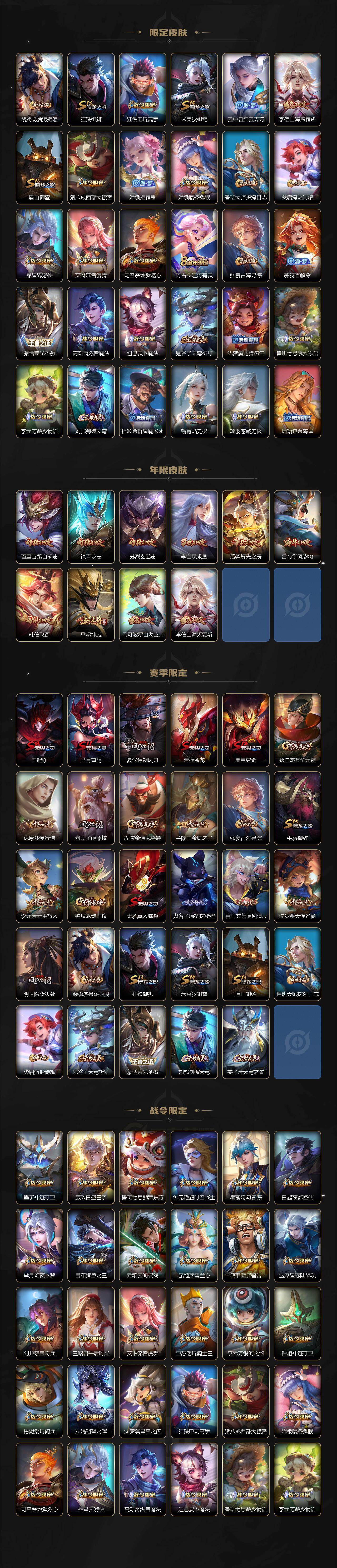 【限定皮肤】:白起狰,姜子牙天穹之誓,杨戬破阵退雄兵,狄仁杰阴阳师,赵云皇家上将,墨子神迹守卫,嬴政优雅恋人,嬴政白昼王子,孙尚香蔷薇恋人,鲁班七号狮舞东方,高渐离死亡摇滚,钟无艳超时空战士,扁鹊奇幻香踪,白起夜都怪侠,芈月重明,芈月幻夜卜梦,吕布猎兽之王,吕布御风骁将,元歌云间偶戏,元歌无心,夏侯惇朔风刀,甄姬落雪兰心,曹操烛龙,典韦穷奇,典韦蓝屏警告,马可波罗山海玄木吟,狄仁杰魔术师,狄仁杰万华元夜,达摩星际陆战队,达摩沙漠行僧,项羽海滩派对,老夫子圣诞老人,老夫子醍醐杖,关羽百相守梦,程咬金演武夺筹,刘邦夺宝奇兵,韩信逐梦之影,韩信飞衡,韩信傲雪梅枪,王昭君午后时光,兰陵王金庭之子,亚瑟潮玩骑士王,孙悟空至尊宝,孙悟空大圣娶亲,孙悟空零号赤焰,孙悟空孙行者,孙悟空齐天大圣,牛魔御旌,后羿辉光之辰,后羿无尽星芒,李元芳银河之约,李元芳云中旅人,虞姬启明星使,钟馗神迹守卫,钟馗驱傩正仪,杨戬潮玩骑兵,女娲朔望之晖,干将莫邪胡桃夹子,蔡文姬繁星吟游,太乙真人饕餮,太乙真人华丽摇滚,鬼谷子原初探秘者,鬼谷子五谷丰年,铠青龙志,苏烈玄武志,百里玄策白虎志,百里玄策原初追逐者,弈星混沌棋,沈梦溪星空之诺,沈梦溪大漠名商,明世隐疑决卦,裴擒虎李小龙,裴擒虎擒涛扼浪,狂铁御狮,狂铁电玩高手,米莱狄御霄,云中君纤云弄巧,李信山海炽霜斩,盾山御銮,猪八戒西部大镖客,嫦娥拒霜思,嫦娥暖冬兔眠,鲁班大师探海日志,桑启海盐诗旅,暃星界游侠,艾琳流音漫舞,司空震地狱燃心,阿古朵江河有灵,张良古海寻踪,蒙犽百解令,蒙恬荣光圣徽,高渐离燃音魔法,妲己灵卜魔法,鬼谷子天穹祈灯,沈梦溪龙舞盛年,鲁班七号蔬乡物语,李元芳蔬乡物语,刘邦剑破天穹,程咬金群星魔术团,镜青焰无极,项羽苍威无极,周瑜熔金海