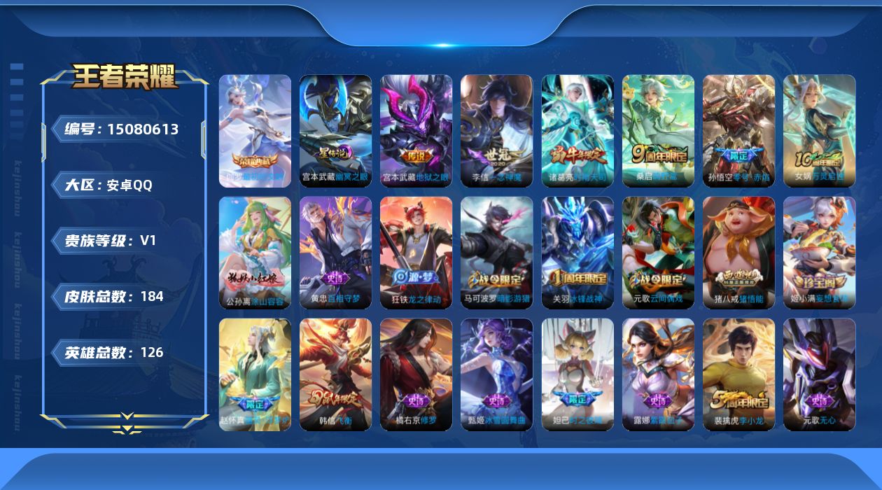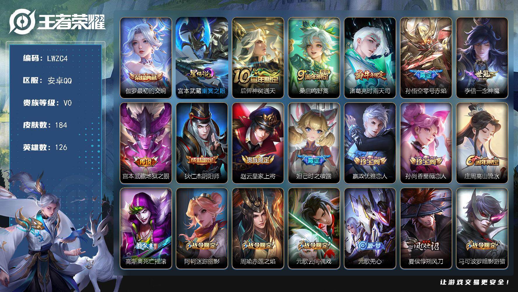 [15080613]可二次【特价出售/店主推荐】安卓Q-V0-最强王者段位-126英雄-184皮肤-1典藏皮肤-1星传说-6传说-54史诗