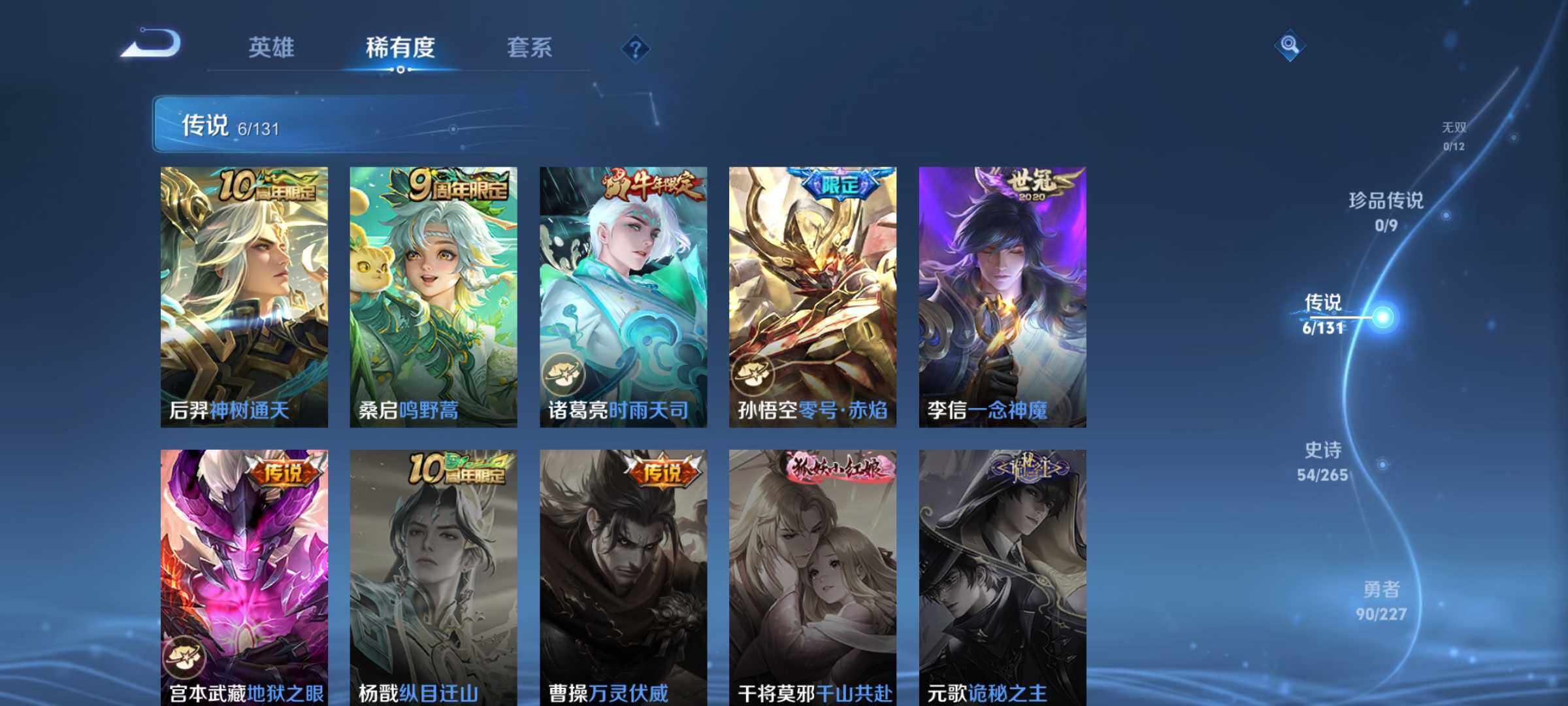 【传说皮肤】:后羿神树通天,桑启鸣野蒿,诸葛亮时雨天司,孙悟空零号赤焰,李信一念神魔,宫本武藏地狱之眼