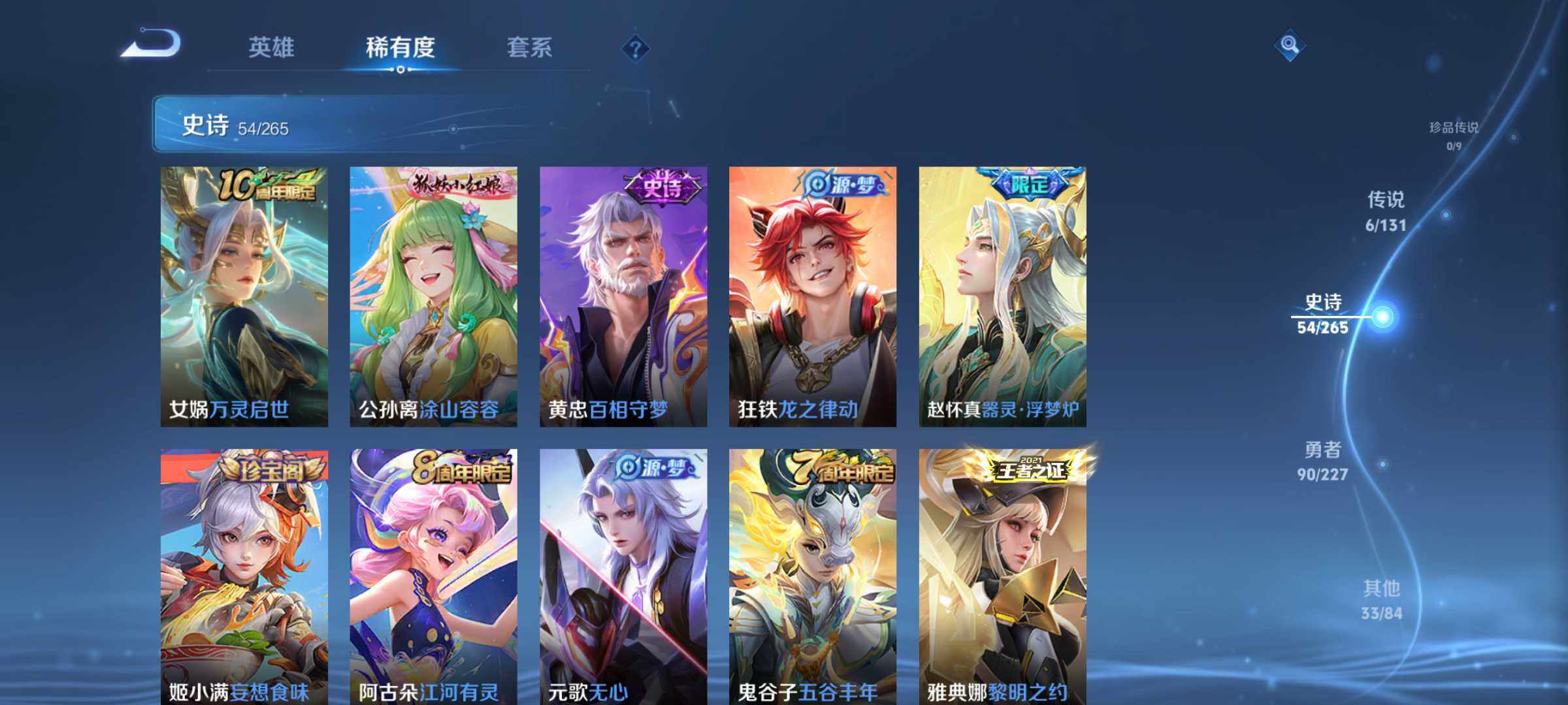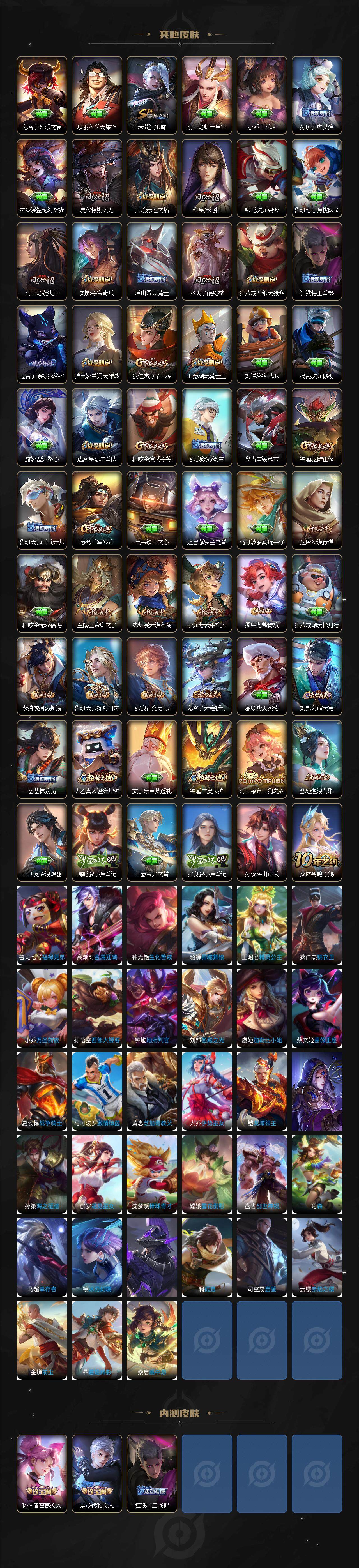 【限定皮肤】:狄仁杰阴阳师,赵云皇家上将,妲己时之彼端,嬴政优雅恋人,孙尚香蔷薇恋人,庄周高山流水,高渐离死亡摇滚,阿轲迷踪丽影,周瑜赤莲之焰,元歌云间偶戏,元歌无心,夏侯惇朔风刀,马可波罗暗影游猎,狄仁杰魔术师,狄仁杰万华元夜,达摩星际陆战队,达摩沙漠行僧,项羽海滩派对,老夫子醍醐杖,关羽冰锋战神,程咬金演武夺筹,刘邦夺宝奇兵,韩信飞衡,兰陵王金庭之子,亚瑟潮玩骑士王,孙悟空零号赤焰,李元芳云中旅人,钟馗驱傩正仪,杨玉环遇见飞天,雅典娜单词大作战,雅典娜黎明之约,蔡文姬繁星吟游,鬼谷子原初探秘者,鬼谷子五谷丰年,诸葛亮时雨天司,苏烈千军破阵,弈星混沌棋,沈梦溪大漠名商,明世隐疑决卦,裴擒虎李小龙,裴擒虎擒涛扼浪,米莱狄御霄,米莱狄胡桃异想国,云中君纤云弄巧,猪八戒西部大镖客,猪八戒猪悟能,嫦娥拒霜思,蒙犽狂想玩偶喵,鲁班大师探海日志,桑启海盐诗旅,阿古朵江河有灵,张良古海寻踪,鬼谷子天穹祈灯,姬小满妄想食味,刘邦剑破天穹