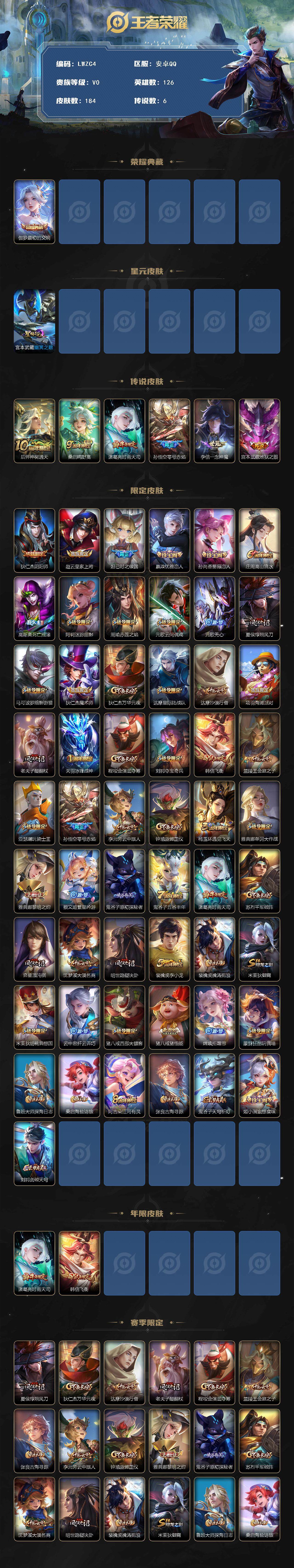- [13338830]安卓Q-V7-秩序白银I段位-108英雄-164皮肤-1典藏-0珍品无双-0无双-0珍品传说-3传说-33史诗 【荣耀典藏】:孙悟空全息碎影 【传说皮肤】:貂蝉仲夏夜之梦,孙悟空地狱火,狄仁杰超时空战士 【限定皮肤】:白起狰,狄仁杰阴阳师,赵云皇家上将,赵云引擎之心,嬴政白昼王子,鲁班七号狮舞东方,阿轲迷踪丽影,钟无艳王者之锤,芈月重明,吕布猎兽之王,周瑜赤莲之焰,夏侯惇朔风刀,甄姬游园惊梦,典韦穷奇,典韦蓝屏警告,马可波罗暗影游猎,狄仁杰魔术师,狄仁杰万华元夜,项羽海滩派对,老夫子醍醐杖,程咬金演武夺筹,刘邦夺宝奇兵,韩信逐梦之影,兰陵王驯魔猎人,牛魔御旌,李元芳银河之约,钟馗神迹守卫,钟馗驱傩正仪,杨玉环遇见飞天,女娲朔望之晖,干将莫邪冰霜恋舞曲,雅典娜单词大作战,蔡文姬繁星吟游,太乙真人饕餮,鬼谷子原初探秘者,百里玄策原初追逐者,百里守约朱雀志,弈星混沌棋,沈梦溪星空之诺,明世隐疑决卦,裴擒虎李小龙,狂铁御狮,米莱狄御霄,盾山御銮,猪八戒西部大镖客,上官婉儿梁祝,上官婉儿天狼绘梦者,蒙犽狂想玩偶喵 【年限皮肤】:百里守约朱雀志 【赛季限定】:白起狰,芈月重明,夏侯惇朔风刀,典韦穷奇,狄仁杰万华元夜,老夫子醍醐杖,程咬金演武夺筹,牛魔御旌,钟馗驱傩正仪,太乙真人饕餮,鬼谷子原初探秘者,百里玄策原初追逐者,弈星混沌棋,明世隐疑决卦,狂铁御狮,米莱狄御霄,盾山御銮 【战令限定】:嬴政白昼王子,鲁班七号狮舞东方,阿轲迷踪丽影,吕布猎兽之王,周瑜赤莲之焰,典韦蓝屏警告,马可波罗暗影游猎,刘邦夺宝奇兵,兰陵王驯魔猎人,李元芳银河之约,钟馗神迹守卫,女娲朔望之晖,雅典娜单词大作战,沈梦溪星空之诺,猪八戒西部大镖客,蒙犽狂想玩偶喵 【史诗皮肤】:钟无艳王者之锤,赵云皇家上将,赵云未来纪元,貂蝉圣诞恋歌,狄仁杰魔术师,孙尚香水果甜心,曹操幽灵船长,李白千年之狐,韩信白龙吟,赵云引擎之心,刘邦德古拉伯爵,韩信逐梦之影,夏侯惇乘风破浪,诸葛亮黄金分割率,甄姬游园惊梦,百里守约特工魅影,杨玉环遇见飞天,嬴政白昼王子,百里守约朱雀志,干将莫邪冰霜恋舞曲,典韦蓝屏警告,鲁班七号狮舞东方,狄仁杰鹰眼统帅,兰陵王驯魔猎人,上官婉儿梁祝,蔡文姬繁星吟游,李元芳银河之约,阿轲迷踪丽影,上官婉儿天狼绘梦者,马可波罗暗影游猎,蒙犽狂想玩偶喵,百里玄策原初追逐者,裴擒虎李小龙 【其他皮肤】:项羽海滩