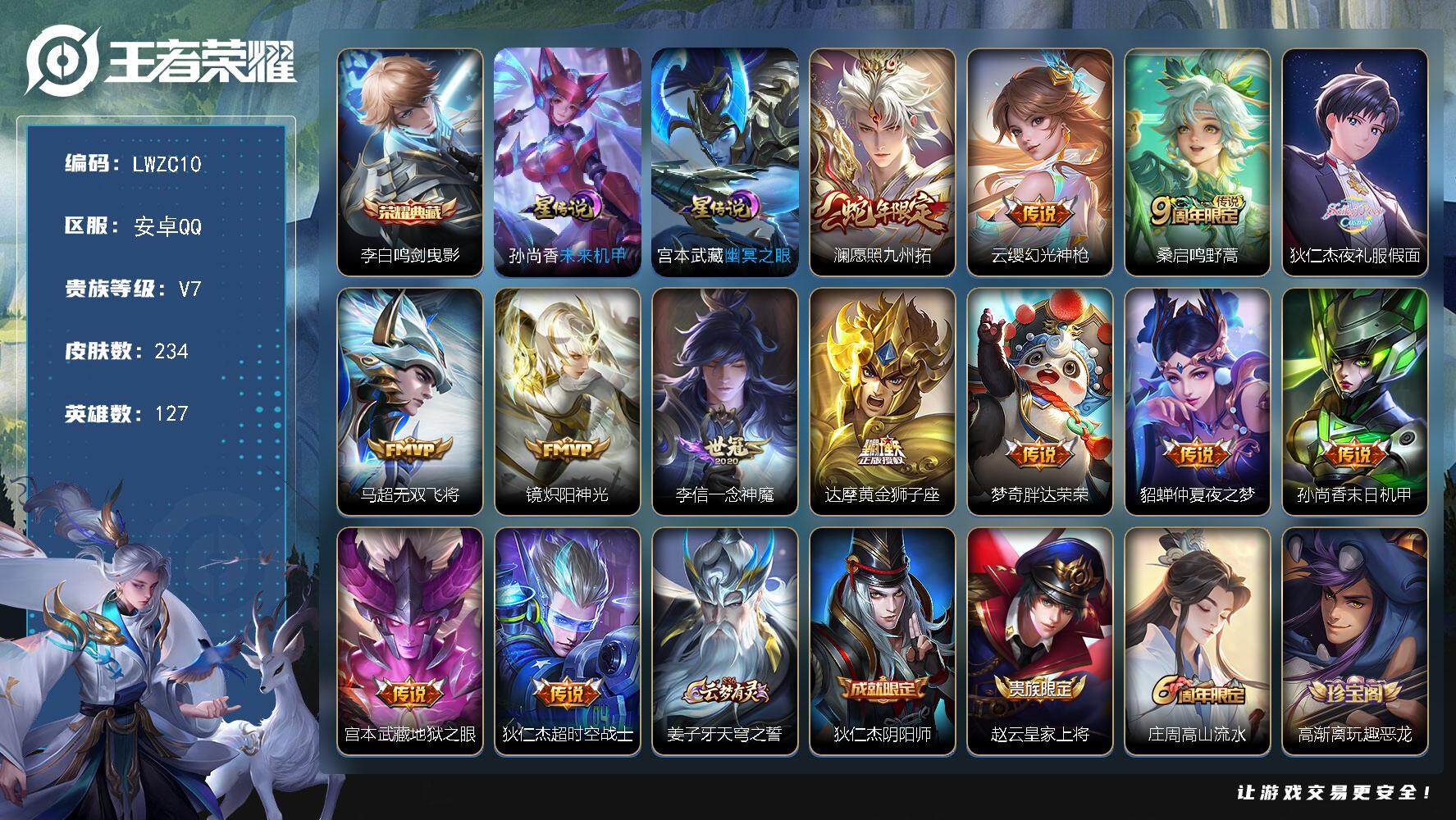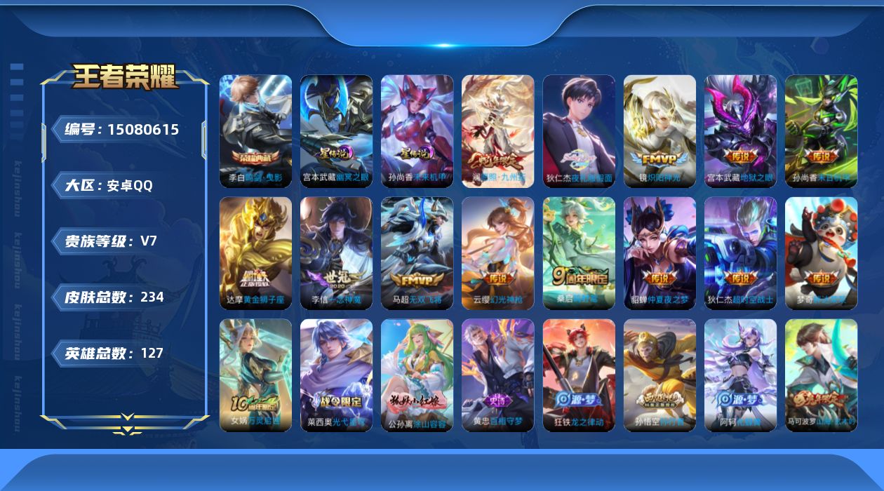 [15080615]可二次【店主推荐捡漏号!可直接换绑】安卓Q-V7-最强王者段位-127英雄-234皮肤-1典藏皮肤-13传说-63史诗 【英雄全皮】:蒙恬全皮 【荣耀典藏】:李白鸣剑曳影 【传说皮肤】:澜愿照九州拓,云缨幻光神枪,桑启鸣野蒿,狄仁杰夜礼服假面,马超无双飞将,镜炽阳神光,李信一念神魔,达摩黄金狮子座,梦奇胖达荣荣,貂蝉仲夏夜之梦,孙尚香末日机甲,宫本武藏地狱之眼,狄仁杰超时空战士 【限定皮肤】:姜子牙天穹之誓,狄仁杰阴阳师,赵云皇家上将,庄周高山流水,高渐离玩趣恶龙,夏侯惇朔风刀,马可波罗山海玄木吟,狄仁杰魔术师,狄仁杰万华元夜,达摩沙漠行僧,项羽海滩派对,老夫子醍醐杖,程咬金演武夺筹,韩信飞衡,王昭君午后时光,兰陵王金庭之子,孙悟空孙行者,后羿圣弓游侠,李元芳银河之约,李元芳云中旅人,钟馗驱傩正仪,干将莫邪真爱魔法,蔡文姬繁星吟游,太乙真人华丽摇滚,鬼谷子原初探秘者,鬼谷子五谷丰年,苏烈千军破阵,弈星混沌棋,公孙离玉兔公主,沈梦溪大漠名商,裴擒虎李小龙,裴擒虎擒涛扼浪,狂铁电玩高手,云中君纤云弄巧,盾山御銮,猪八戒猪悟能,嫦娥拒霜思,嫦娥暖冬兔眠,鲁班大师探海日志,桑启海盐诗旅,暃星界游侠,艾琳女武神,张良古海寻踪,狄仁杰夜礼服假面,蒙犽百解令,蒙恬荣光圣徽,高渐离燃音魔法,妲己灵卜魔法,鬼谷子天穹祈灯,伽罗琥珀纪元,姬小满妄想食味,百里玄策超元猎域,沈梦溪龙舞盛年,鲁班七号蔬乡物语,李元芳蔬乡物语,刘邦剑破天穹,程咬金群星魔术团,项羽苍威无极,刘备异域游侠,周瑜熔金海岸 【年限皮肤】:韩信飞衡,马可波罗山海玄木吟 【赛季限定】:夏侯惇朔风刀,狄仁杰万华元夜,达摩沙漠行僧,老夫子醍醐杖,程咬金演武夺筹,兰陵王金庭之子,张良古海寻踪,李元芳云中旅人,钟馗驱傩正仪,鬼谷子原初探秘者,苏烈千军破阵,弈星混沌棋,沈梦溪大漠名商,裴擒虎擒涛扼浪,盾山御銮,鲁班大师探海日志,桑启海盐诗旅,鬼谷子天穹祈灯,蒙恬荣光圣徽,刘邦剑破天穹,姜子牙天穹之誓 【战令限定】:王昭君午后时光,后羿圣弓游侠,李元芳银河之约,干将莫邪真爱魔法,狂铁电玩高手,嫦娥暖冬兔眠,暃星界游侠,高渐离燃音魔法,妲己灵卜魔法,鲁班七号蔬乡物语,李元芳蔬乡物语,项羽苍威无极 【史诗皮肤】:露娜紫霞仙子,赵云皇家上将,赵云未来纪元,甄姬冰雪圆舞曲,王昭君偶像歌手,狄仁杰魔术师,廉颇地狱岩魂,宫本武藏鬼剑武藏,孙尚