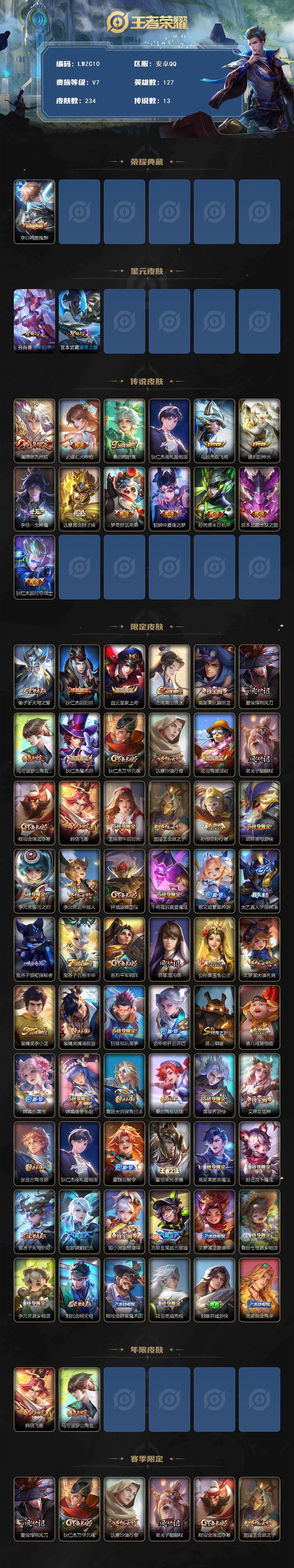 [15080615]可二次【店主推荐捡漏号!可直接换绑】安卓Q-V7-最强王者段位-127英雄-234皮肤-1典藏皮肤-13传说-63史诗