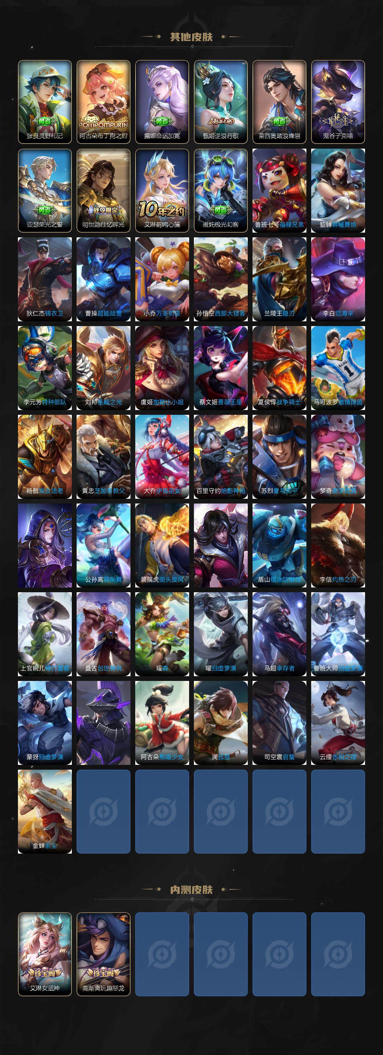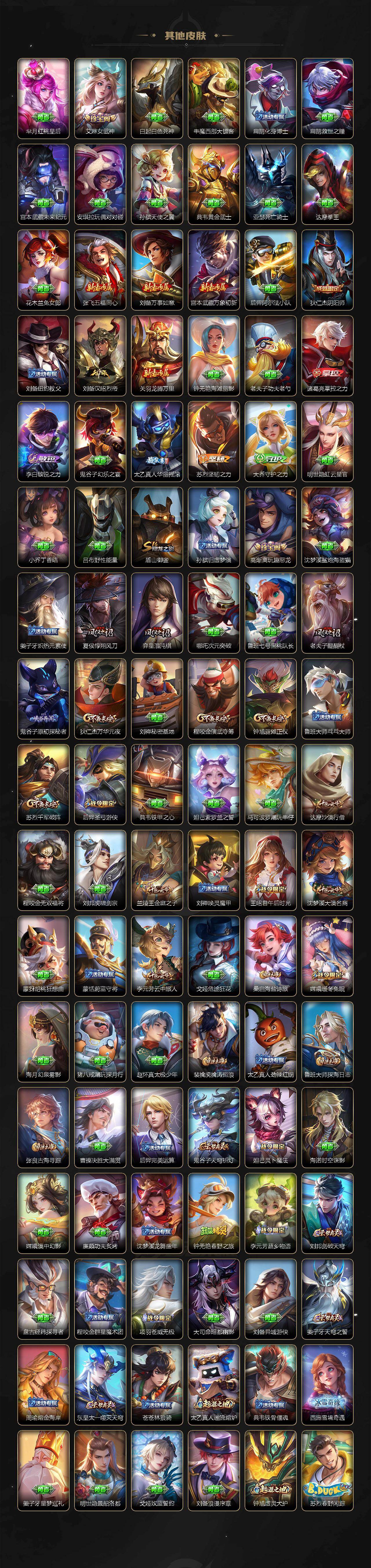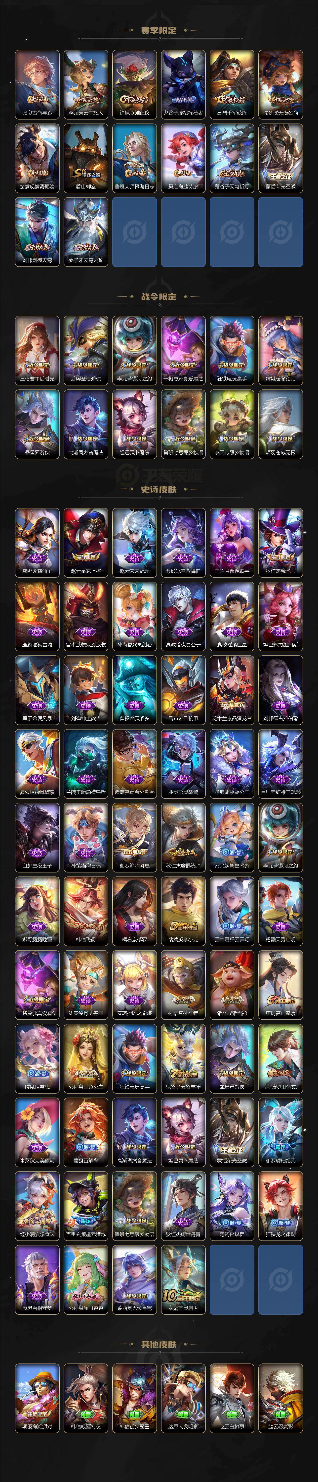 【限定皮肤】:姜子牙天穹之誓,狄仁杰阴阳师,赵云皇家上将,庄周高山流水,高渐离玩趣恶龙,夏侯惇朔风刀,马可波罗山海玄木吟,狄仁杰魔术师,狄仁杰万华元夜,达摩沙漠行僧,项羽海滩派对,老夫子醍醐杖,程咬金演武夺筹,韩信飞衡,王昭君午后时光,兰陵王金庭之子,孙悟空孙行者,后羿圣弓游侠,李元芳银河之约,李元芳云中旅人,钟馗驱傩正仪,干将莫邪真爱魔法,蔡文姬繁星吟游,太乙真人华丽摇滚,鬼谷子原初探秘者,鬼谷子五谷丰年,苏烈千军破阵,弈星混沌棋,公孙离玉兔公主,沈梦溪大漠名商,裴擒虎李小龙,裴擒虎擒涛扼浪,狂铁电玩高手,云中君纤云弄巧,盾山御銮,猪八戒猪悟能,嫦娥拒霜思,嫦娥暖冬兔眠,鲁班大师探海日志,桑启海盐诗旅,暃星界游侠,艾琳女武神,张良古海寻踪,狄仁杰夜礼服假面,蒙犽百解令,蒙恬荣光圣徽,高渐离燃音魔法,妲己灵卜魔法,鬼谷子天穹祈灯,伽罗琥珀纪元,姬小满妄想食味,百里玄策超元猎域,沈梦溪龙舞盛年,鲁班七号蔬乡物语,李元芳蔬乡物语,刘邦剑破天穹,程咬金群星魔术团,项羽苍威无极,刘备异域游侠,周瑜熔金海岸
