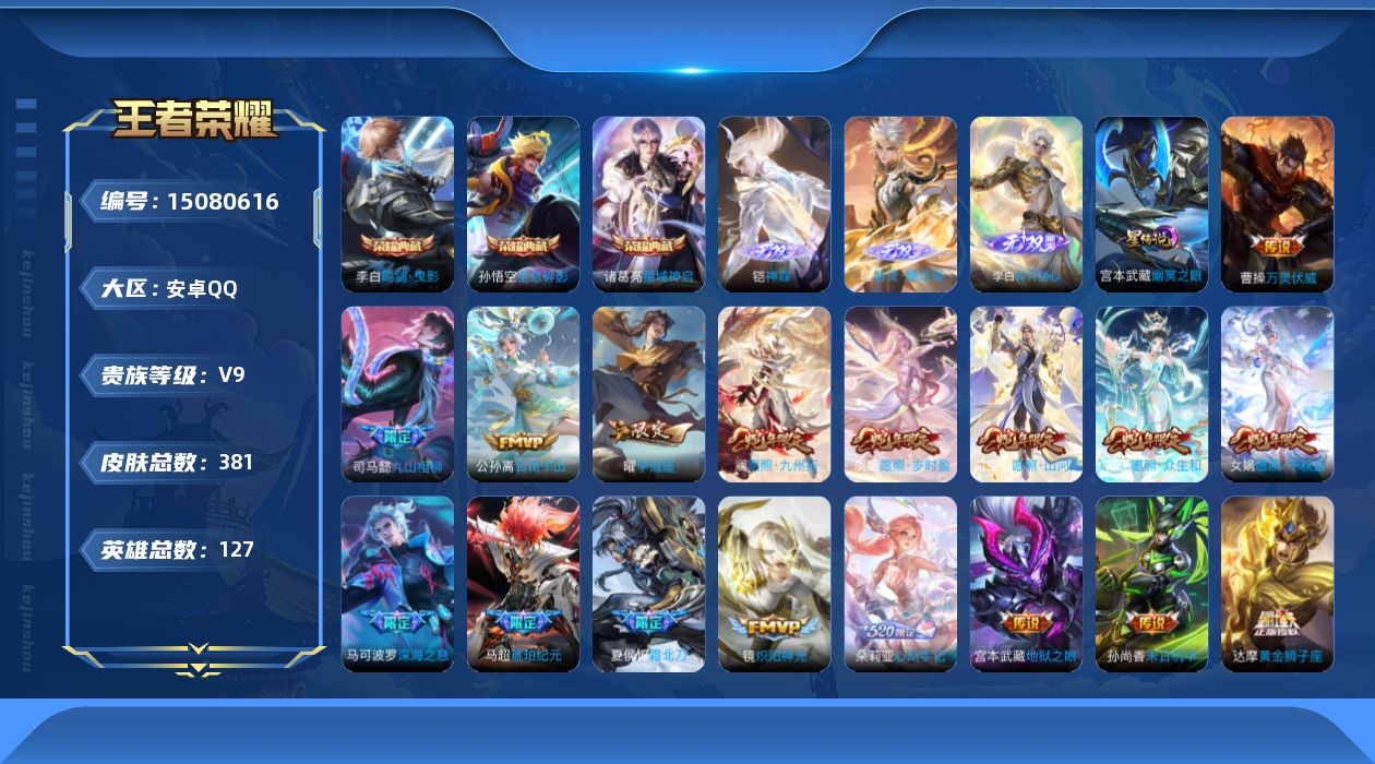 [15080616]可二次【店主推荐捡漏号!可直接换绑】:安卓Q-V9-最强王者段位-127英雄-381皮肤-1星元-3典藏皮肤-3无双-31传说-107史诗