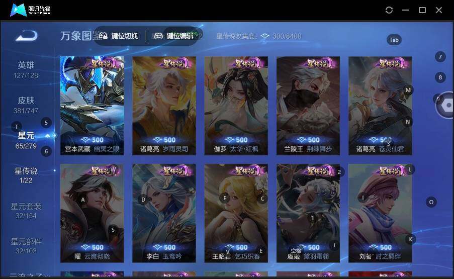 孙膑妖精王,扁鹊炼金王,白起狰,曹操烛龙,芈月重明,狂铁御狮,米莱狄御霄,牛魔御旌,盾山御銮,夏侯惇朔风刀,明世隐疑决卦,老夫子醍醐杖,鬼谷子原初探秘者,狄仁杰万华元夜,程咬金演武夺筹,钟馗驱傩正仪,苏烈千军破阵,吕布猎兽之王,女娲朔望之晖,典韦蓝屏警告,钟馗神迹守卫,鲁班七号狮舞东方,沈梦溪星空之诺,李元芳银河之约,刘邦夺宝奇兵,马可波罗暗影游猎,蒙犽狂想玩偶喵,元歌云间偶戏,弈星混沌棋,达摩沙漠行僧,兰陵王金庭之子,沈梦溪大漠名商,李元芳云中旅人,桑启海盐诗旅,裴擒虎擒涛扼浪,鲁班大师探海日志,张良古海寻踪