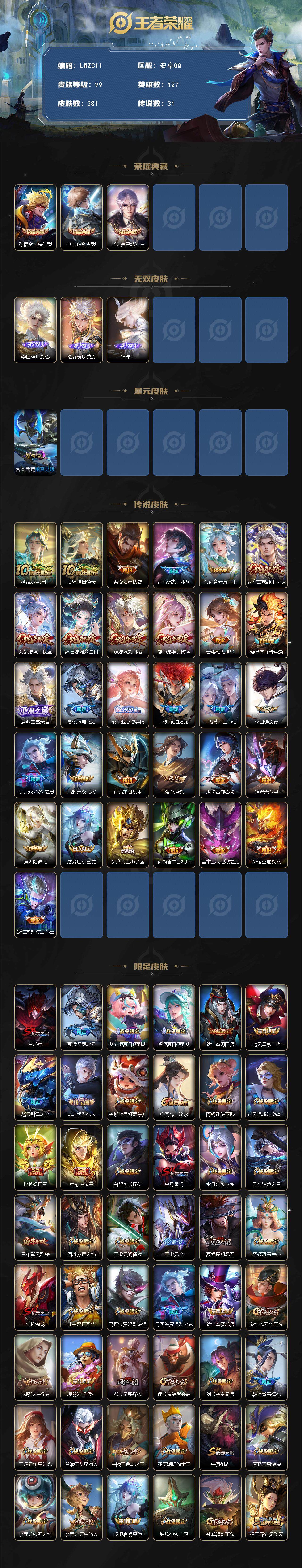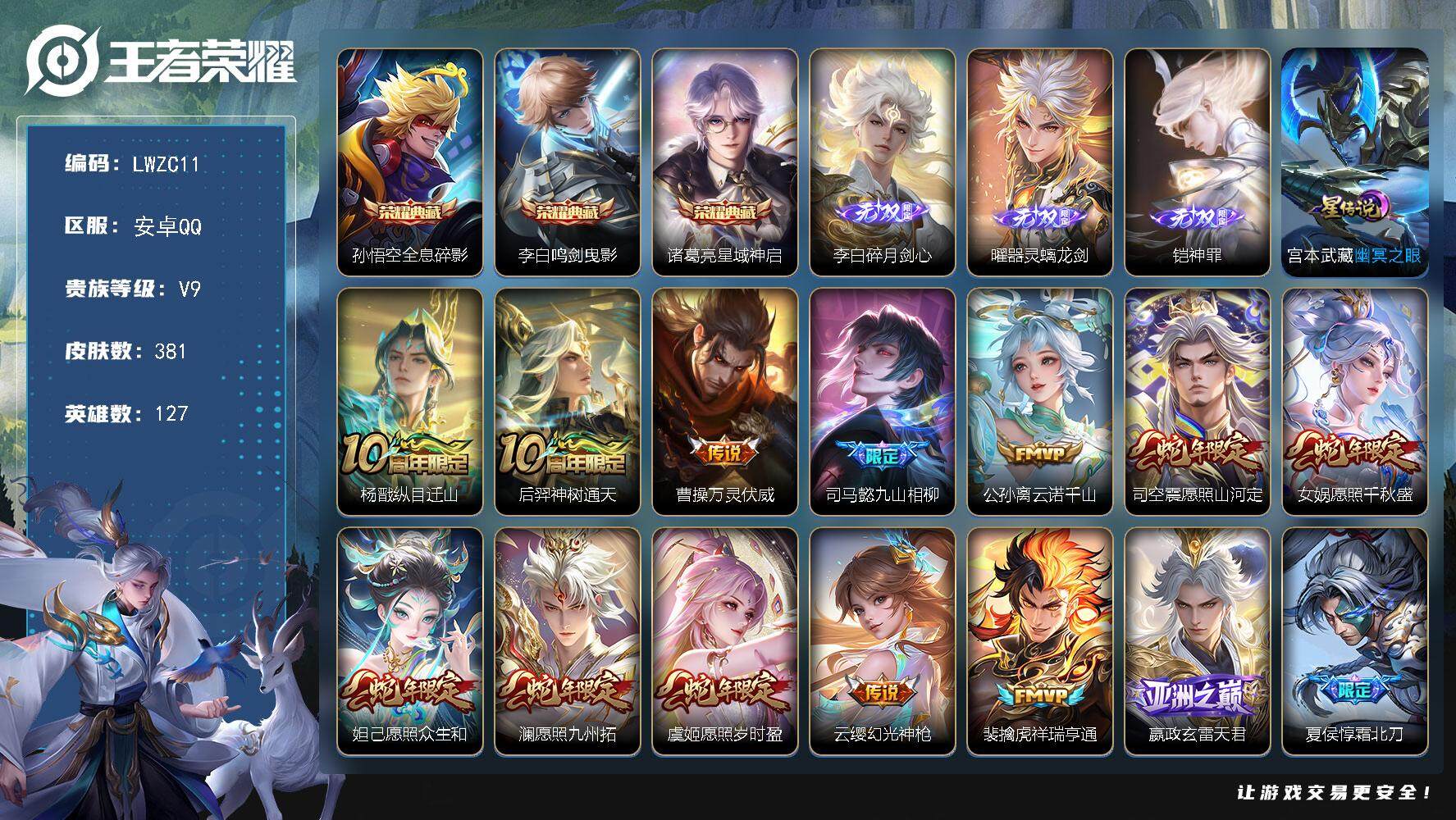 [15080616]可二次【店主推荐捡漏号!可直接换绑】:安卓Q-V9-最强王者段位-127英雄-381皮肤-1星元-3典藏皮肤-3无双-31传说-107史诗 【英雄全皮】:司马懿全皮,孙权全皮,钟馗全皮,狂铁全皮,盾山全皮,司空震全皮,莱西奥全皮,影全皮 【荣耀典藏】:孙悟空全息碎影,李白鸣剑曳影,诸葛亮星域神启 【无双皮肤】:李白碎月剑心,曜器灵螭龙剑,铠神罪 【传说皮肤】:杨戬纵目迁山,后羿神树通天,曹操万灵伏威,司马懿九山相柳,公孙离云诺千山,司空震愿照山河定,女娲愿照千秋盛,妲己愿照众生和,澜愿照九州拓,虞姬愿照岁时盈,云缨幻光神枪,裴擒虎祥瑞亨通,嬴政玄雷天君,夏侯惇霜北刀,朵莉亚心动手记,马超琥珀纪元,干将莫邪画中仙,李白诗剑行,马可波罗深海之息,马超无双飞将,孙策末日机甲,曜李逍遥 ,周瑜音你心动,铠绛天战甲,镜炽阳神光,虞姬启明星使,达摩黄金狮子座,孙尚香末日机甲,宫本武藏地狱之眼,孙悟空地狱火,狄仁杰超时空战士 【限定皮肤】:白起狰,夏侯惇霜北刀,蔡文姬夏日便利店,虞姬夏日便利店,狄仁杰阴阳师,赵云皇家上将,赵云引擎之心,嬴政优雅恋人,鲁班七号狮舞东方,庄周高山流水,阿轲迷踪丽影,钟无艳超时空战士,孙膑妖精王,扁鹊炼金王,白起夜都怪侠,芈月重明,芈月幻夜卜梦,吕布猎兽之王,吕布御风骁将,周瑜赤莲之焰,元歌云间偶戏,元歌无心,夏侯惇朔风刀,甄姬落雪兰心,曹操烛龙,典韦蓝屏警告,马可波罗暗影游猎,马可波罗深海之息,狄仁杰魔术师,狄仁杰万华元夜,达摩沙漠行僧,项羽海滩派对,老夫子醍醐杖,程咬金演武夺筹,刘邦夺宝奇兵,韩信傲雪梅枪,王昭君午后时光,兰陵王驯魔猎人,兰陵王金庭之子,亚瑟潮玩骑士王,牛魔御旌,后羿圣弓游侠,李元芳银河之约,李元芳云中旅人,虞姬启明星使,钟馗神迹守卫,钟馗驱傩正仪,杨玉环遇见飞天,女娲朔望之晖,干将莫邪冰霜恋舞曲,干将莫邪真爱魔法,干将莫邪画中仙,雅典娜单词大作战,蔡文姬繁星吟游,鬼谷子原初探秘者,鬼谷子五谷丰年,黄忠火炮绅士,苏烈千军破阵,弈星混沌棋,沈梦溪星空之诺,沈梦溪大漠名商,明世隐疑决卦,明世隐吟游魔法,裴擒虎李小龙,裴擒虎擒涛扼浪,狂铁御狮,狂铁电玩高手,米莱狄御霄,云中君纤云弄巧,盾山御銮,盾山梦圆繁星,猪八戒西部大镖客,上官婉儿梁祝,嫦娥拒霜思,嫦娥暖冬兔眠,曜李逍遥 ,蒙犽狂想玩偶喵,鲁班大师探海日志,桑启海盐诗旅,艾琳流音漫舞