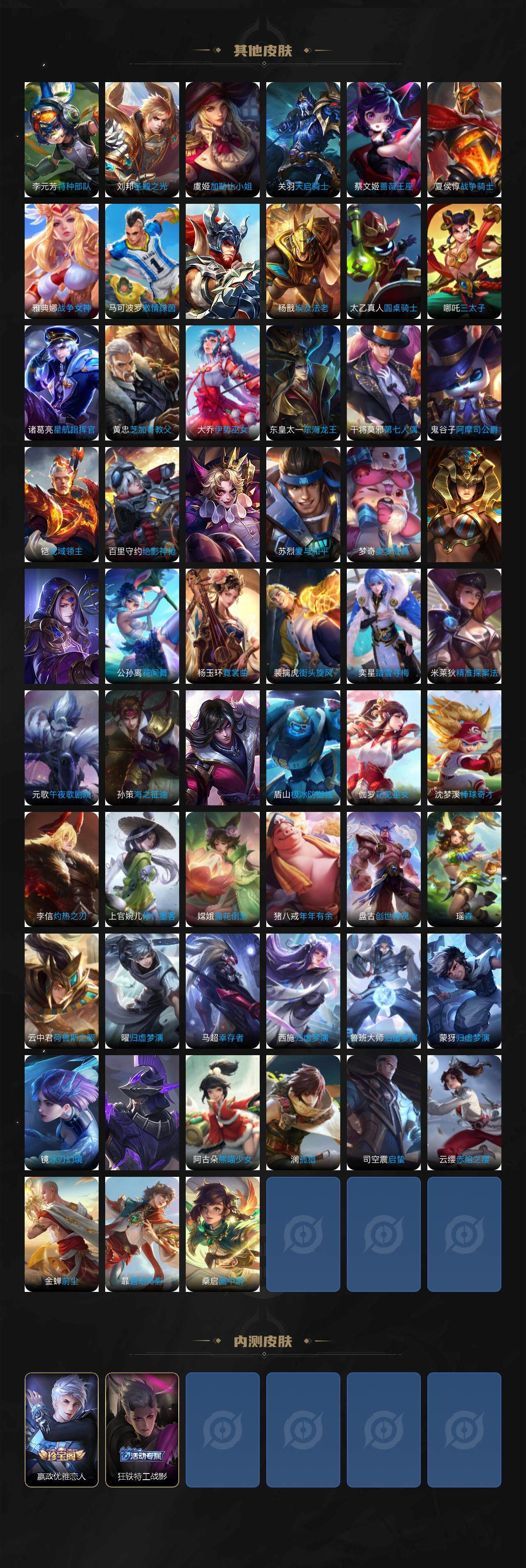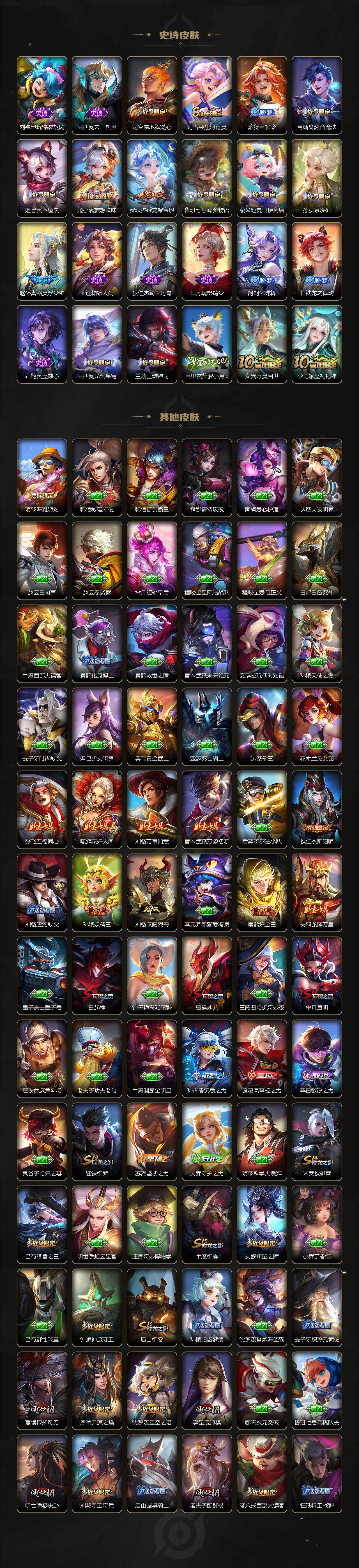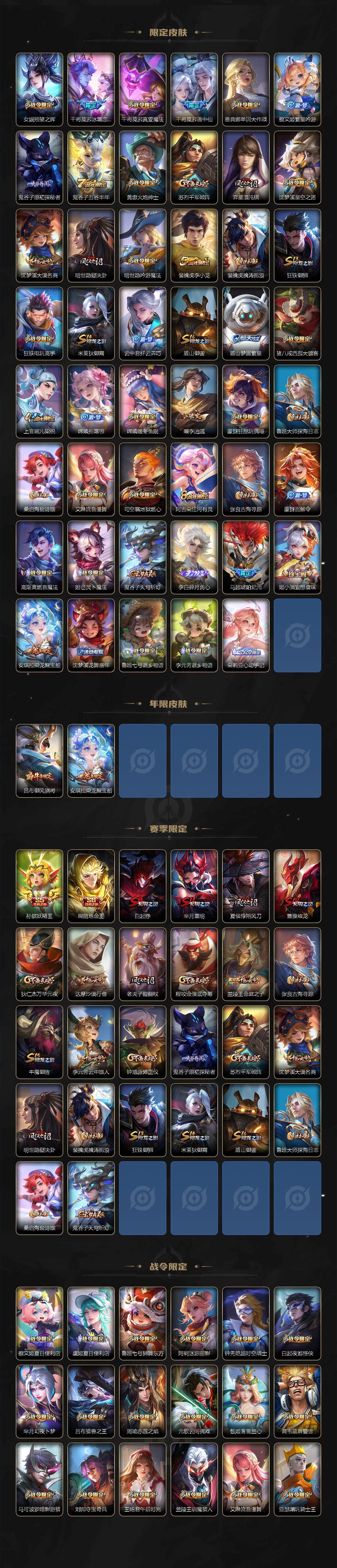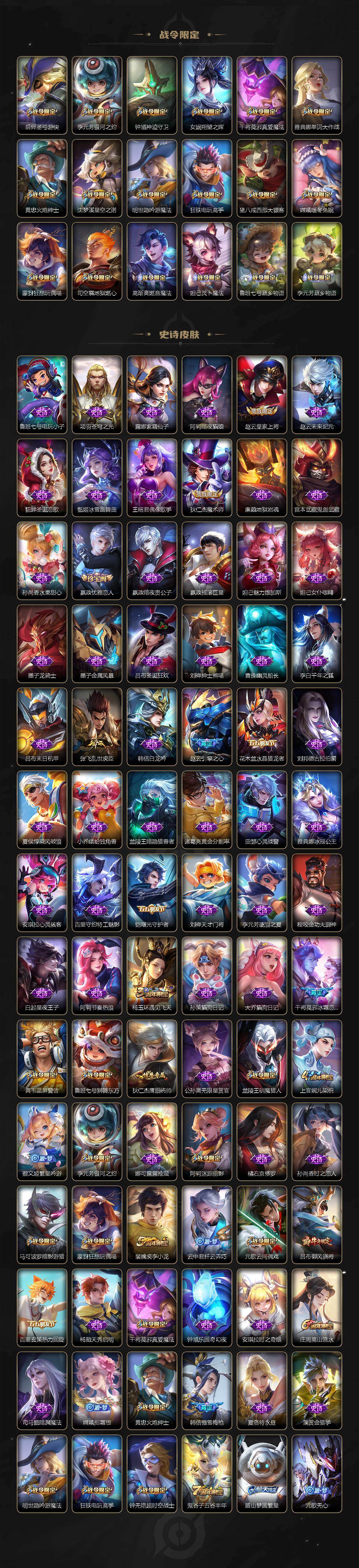 【限定皮肤】:白起狰,夏侯惇霜北刀,蔡文姬夏日便利店,虞姬夏日便利店,狄仁杰阴阳师,赵云皇家上将,赵云引擎之心,嬴政优雅恋人,鲁班七号狮舞东方,庄周高山流水,阿轲迷踪丽影,钟无艳超时空战士,孙膑妖精王,扁鹊炼金王,白起夜都怪侠,芈月重明,芈月幻夜卜梦,吕布猎兽之王,吕布御风骁将,周瑜赤莲之焰,元歌云间偶戏,元歌无心,夏侯惇朔风刀,甄姬落雪兰心,曹操烛龙,典韦蓝屏警告,马可波罗暗影游猎,马可波罗深海之息,狄仁杰魔术师,狄仁杰万华元夜,达摩沙漠行僧,项羽海滩派对,老夫子醍醐杖,程咬金演武夺筹,刘邦夺宝奇兵,韩信傲雪梅枪,王昭君午后时光,兰陵王驯魔猎人,兰陵王金庭之子,亚瑟潮玩骑士王,牛魔御旌,后羿圣弓游侠,李元芳银河之约,李元芳云中旅人,虞姬启明星使,钟馗神迹守卫,钟馗驱傩正仪,杨玉环遇见飞天,女娲朔望之晖,干将莫邪冰霜恋舞曲,干将莫邪真爱魔法,干将莫邪画中仙,雅典娜单词大作战,蔡文姬繁星吟游,鬼谷子原初探秘者,鬼谷子五谷丰年,黄忠火炮绅士,苏烈千军破阵,弈星混沌棋,沈梦溪星空之诺,沈梦溪大漠名商,明世隐疑决卦,明世隐吟游魔法,裴擒虎李小龙,裴擒虎擒涛扼浪,狂铁御狮,狂铁电玩高手,米莱狄御霄,云中君纤云弄巧,盾山御銮,盾山梦圆繁星,猪八戒西部大镖客,上官婉儿梁祝,嫦娥拒霜思,嫦娥暖冬兔眠,曜李逍遥 ,蒙犽狂想玩偶喵,鲁班大师探海日志,桑启海盐诗旅,艾琳流音漫舞