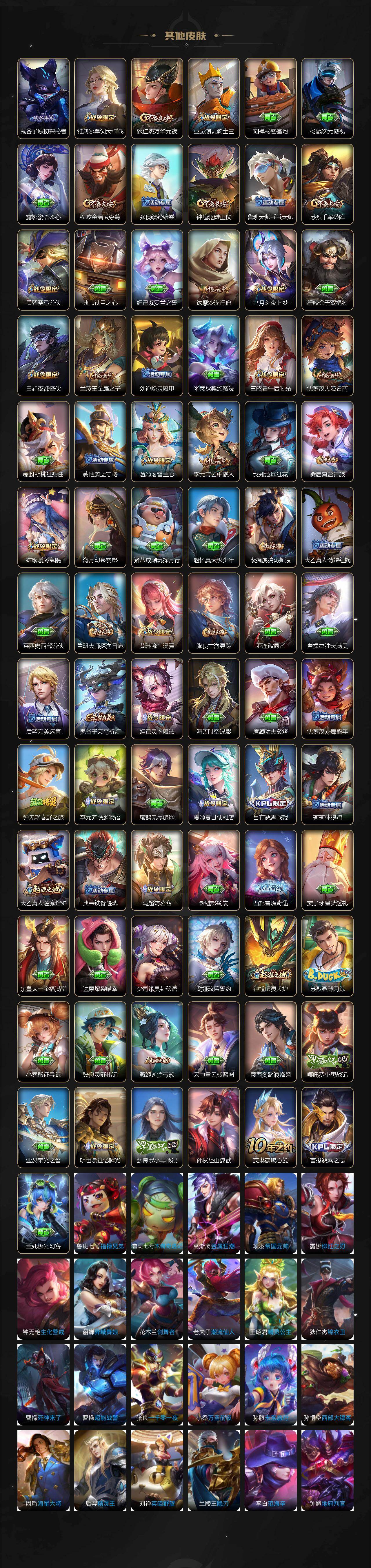 娜可露露晚萤,李元芳逐浪之夏,公孙离无限星赏官,大乔猫狗日记,孙策猫狗日记,阿轲节奏热浪,露娜紫霞仙子,诸葛亮黄金分割率,王昭君偶像歌手,韩信白龙吟,项羽苍穹之光,孙尚香时之恋人,阿轲暗夜猫娘,雅典娜冰冠公主,吕布末日机甲,鲁班七号电玩小子,橘右京修罗,墨子龙骑士,嬴政摇滚巨星,刘禅绅士熊喵,刘禅天才门将,白起星夜王子,安琪拉心灵骇客,安琪拉时之奇旅,程咬金功夫厨神,刘邦德古拉伯爵,兰陵王暗隐猎兽者,曹操幽灵船长,宫本武藏鬼剑武藏,司马懿暗渊魔法,亚瑟心灵战警,钟馗乐园奇幻夜,杨戬天秀·启明,廉颇地狱岩魂,小乔缤纷独角兽,夏侯惇乘风破浪,花木兰水晶猎龙者,铠曙光守护者,百里玄策热力回旋,墨子金属风暴,吕布圣诞狂欢,貂蝉圣诞恋歌,百里守约特工魅影,嬴政暗夜贵公子,嫦娥拒霜思,李白千年之狐,夏洛特永昼,澜赏金猎手,刘禅电玩·爆裂旋风,莱西奥末日机甲,蒙犽百解令,高渐离燃音魔法,安琪拉乘龙·聚宝船,赵怀真器灵·浮梦炉,亚连糖绘人间,狄仁杰绮世丹青