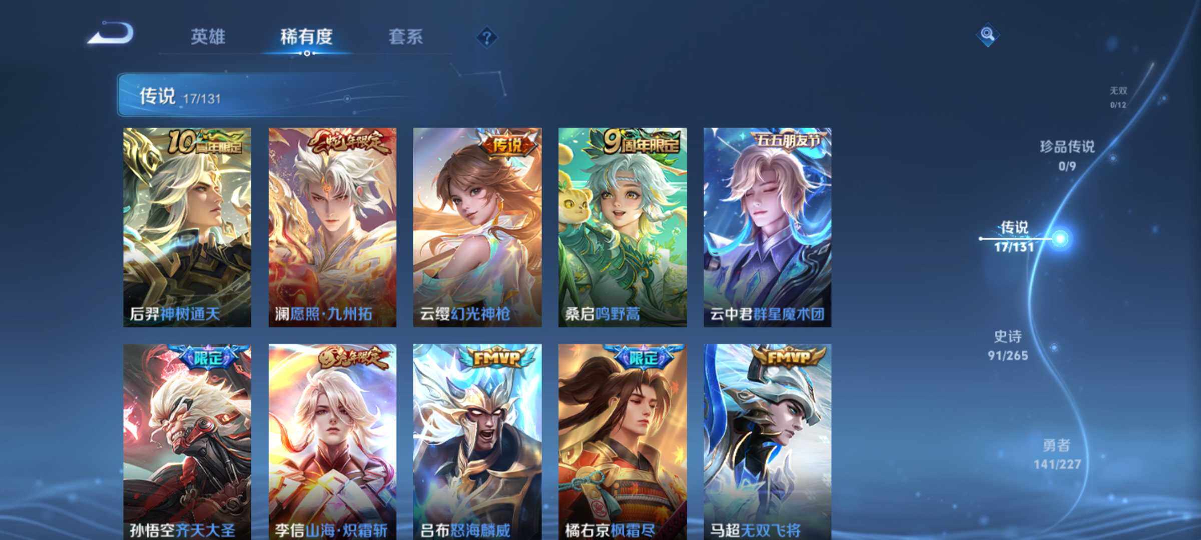【传说皮肤】:后羿神树通天,澜愿照九州拓,云缨幻光神枪,桑启鸣野蒿,云中君群星魔术团,孙悟空齐天大圣,李信山海炽霜斩,吕布怒海麟威,橘右京枫霜尽,马超无双飞将,鲁班七号寅虎瑞焰,李元芳飞鸢探春,曜云鹰飞将,干将莫邪久胜战神,后羿黄金射手座,宫本武藏地狱之眼,狄仁杰超时空战士
