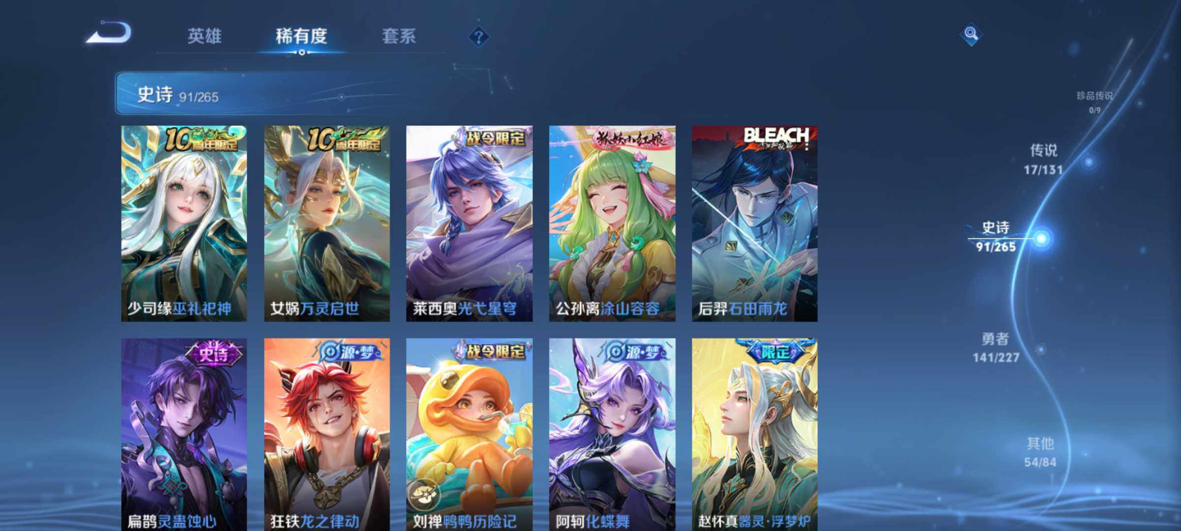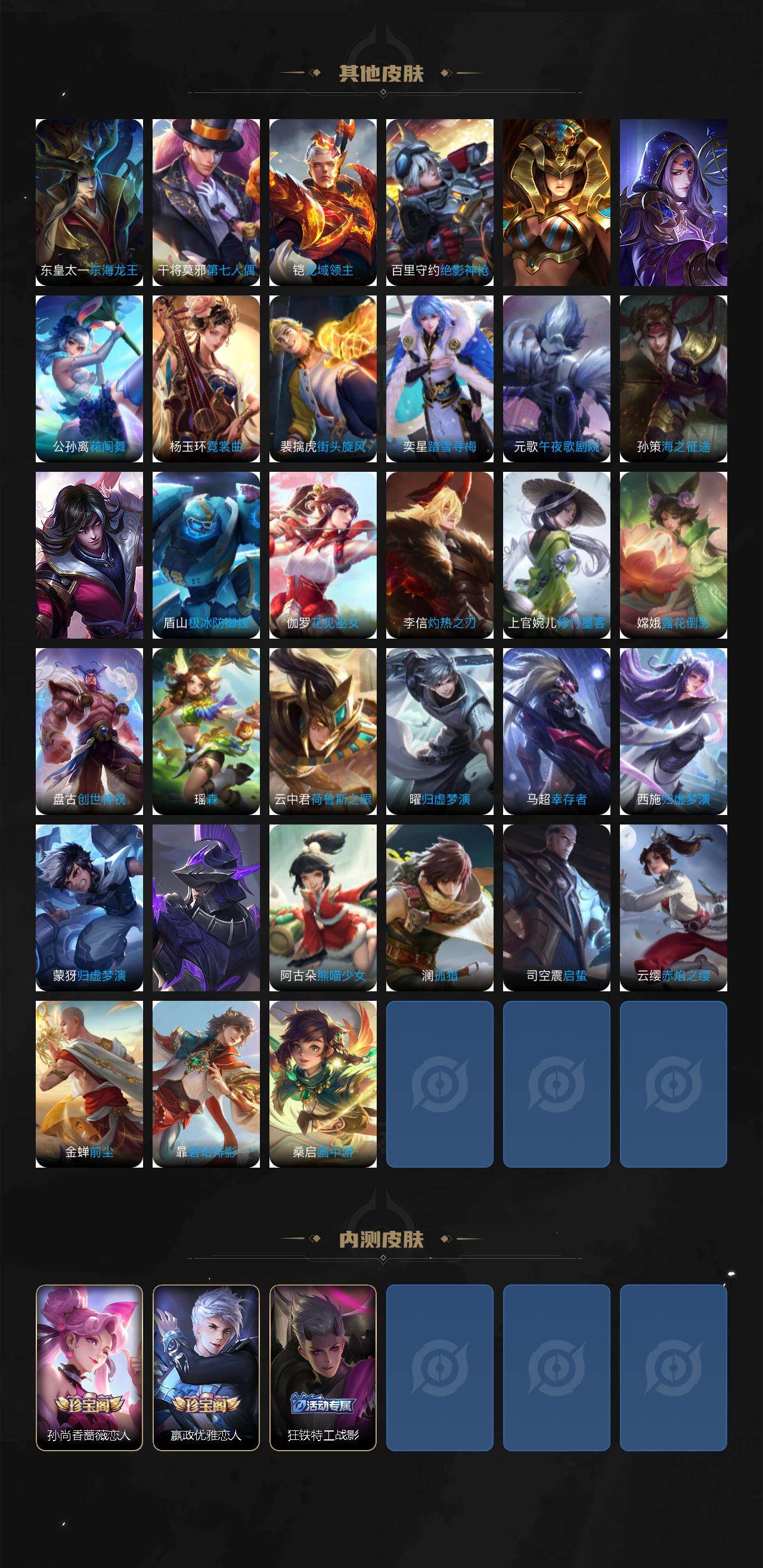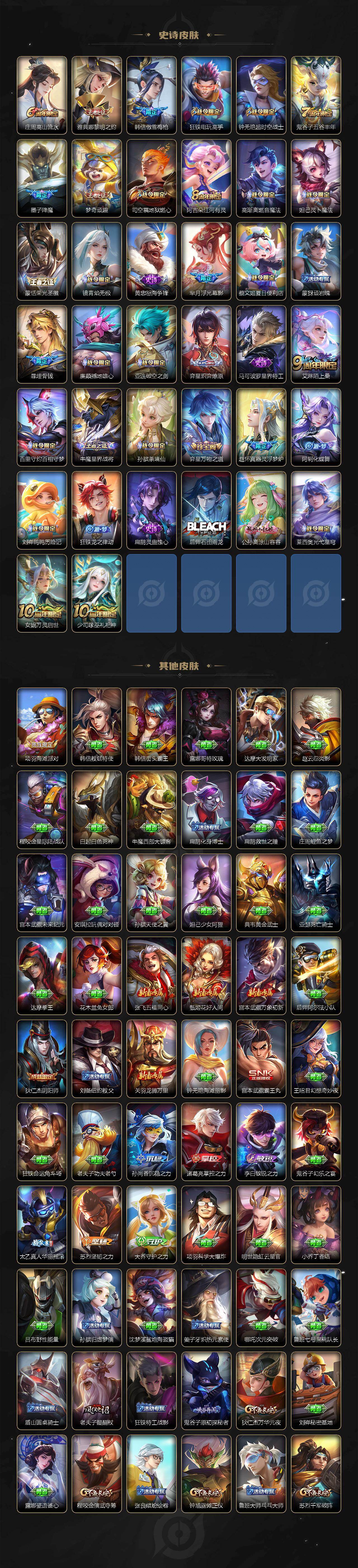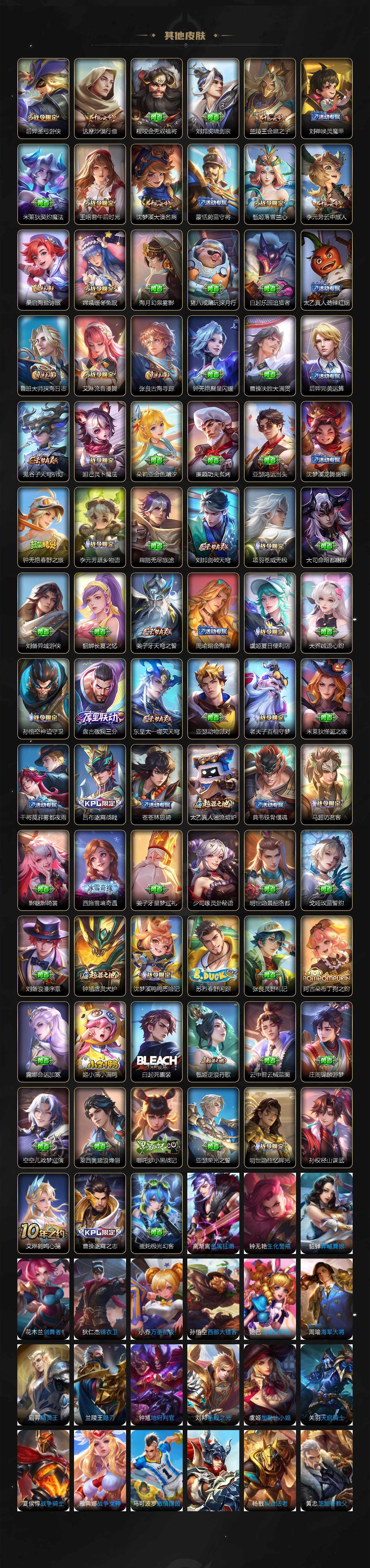 【限定皮肤】:暃埋骨钱,蒙犽顽岩魄,蔡文姬夏日便利店,大乔绒语心约,虞姬夏日便利店,姜子牙天穹之誓,狄仁杰阴阳师,赵云皇家上将,赵云龙胆,墨子降魔,妲己时之彼端,嬴政优雅恋人,孙尚香蔷薇恋人,鲁班七号狮舞东方,鲁班七号寅虎瑞焰,庄周高山流水,钟无艳超时空战士,甄姬落雪兰心,狄仁杰魔术师,狄仁杰万华元夜,达摩沙漠行僧,项羽海滩派对,老夫子醍醐杖,程咬金演武夺筹,韩信傲雪梅枪,王昭君午后时光,兰陵王金庭之子,橘右京枫霜尽,孙悟空孙行者,孙悟空齐天大圣,后羿圣弓游侠,李元芳云中旅人,钟馗驱傩正仪,干将莫邪真爱魔法,雅典娜黎明之约,太乙真人华丽摇滚,鬼谷子原初探秘者,鬼谷子五谷丰年,苏烈千军破阵,百里玄策原初追逐者,梦奇顽趣,沈梦溪大漠名商,裴擒虎李小龙,狂铁电玩高手,云中君纤云弄巧,李信山海炽霜斩,猪八戒猪悟能,上官婉儿梁祝,嫦娥暖冬兔眠,蒙犽狂想玩偶喵,鲁班大师探海日志,桑启海盐诗旅,艾琳流音漫舞,司空震地狱燃心,阿古朵江河有灵,张良古海寻踪,蒙恬荣光圣徽,高渐离燃音魔法,妲己灵卜魔法,鬼谷子天穹祈灯,沈梦溪龙舞盛年,李元芳蔬乡物语,刘邦剑破天穹,云中君群星魔术团,镜青焰无极,项羽苍威无极,刘备异域游侠,芈月浮光幕影,周瑜熔金海岸