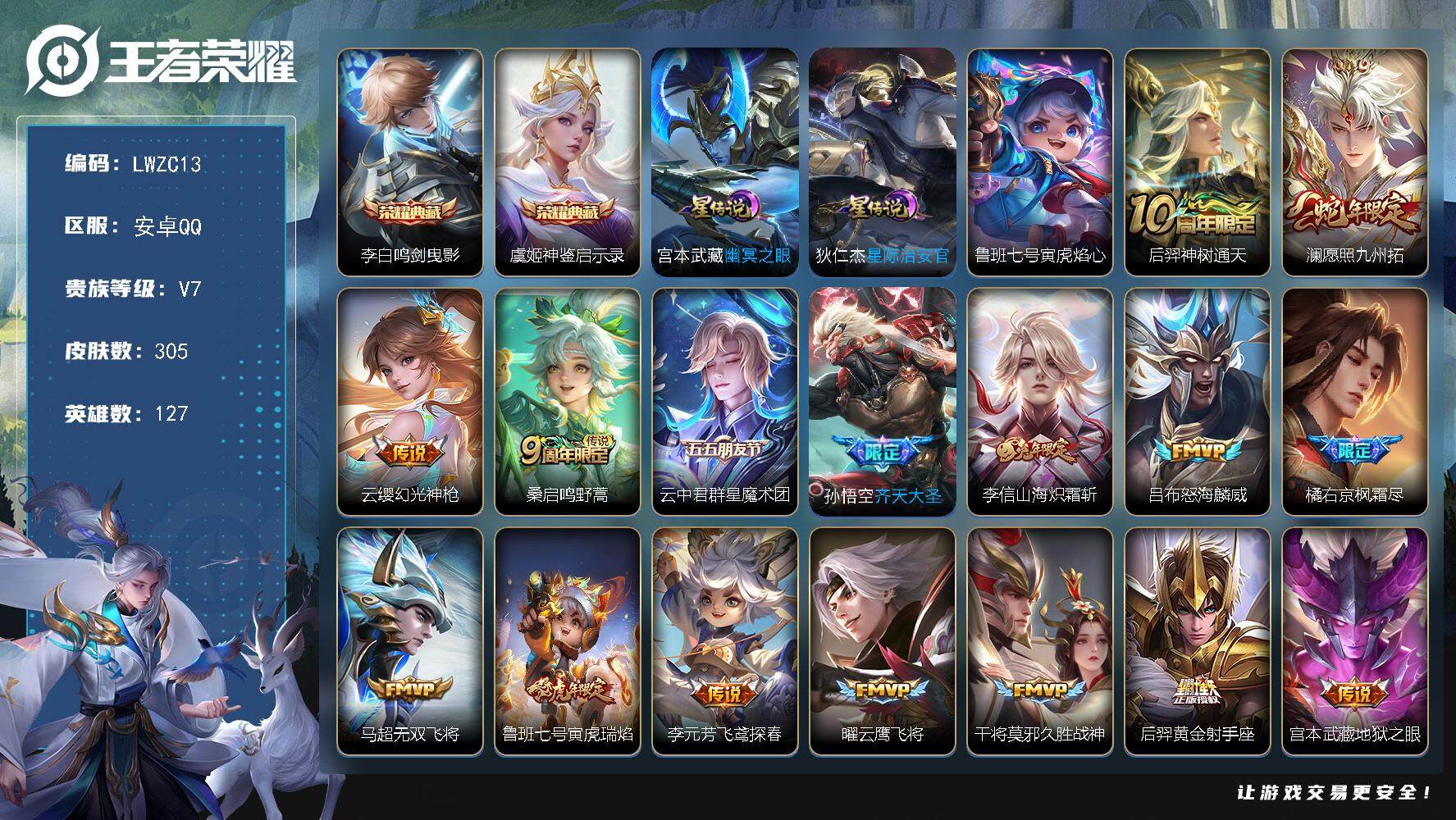 [15080627]可二次【特价出售/店主推荐】打野35段、对抗路32段,安卓Q-V7-最强王者段位-127英雄-305皮肤-2典藏皮肤-3星传说-17传说-91史诗 【英雄全皮】:孙权全皮,橘右京全皮,蒙恬全皮,空空儿全皮,影全皮 【荣耀典藏】:李白鸣剑曳影,虞姬神鉴启示录 【传说皮肤】:后羿神树通天,澜愿照九州拓,云缨幻光神枪,桑启鸣野蒿,云中君群星魔术团,孙悟空齐天大圣,李信山海炽霜斩,吕布怒海麟威,橘右京枫霜尽,马超无双飞将,鲁班七号寅虎瑞焰,李元芳飞鸢探春,曜云鹰飞将,干将莫邪久胜战神,后羿黄金射手座,宫本武藏地狱之眼,狄仁杰超时空战士 【限定皮肤】:暃埋骨钱,蒙犽顽岩魄,蔡文姬夏日便利店,大乔绒语心约,虞姬夏日便利店,姜子牙天穹之誓,狄仁杰阴阳师,赵云皇家上将,赵云龙胆,墨子降魔,妲己时之彼端,嬴政优雅恋人,孙尚香蔷薇恋人,鲁班七号狮舞东方,鲁班七号寅虎瑞焰,庄周高山流水,钟无艳超时空战士,甄姬落雪兰心,狄仁杰魔术师,狄仁杰万华元夜,达摩沙漠行僧,项羽海滩派对,老夫子醍醐杖,程咬金演武夺筹,韩信傲雪梅枪,王昭君午后时光,兰陵王金庭之子,橘右京枫霜尽,孙悟空孙行者,孙悟空齐天大圣,后羿圣弓游侠,李元芳云中旅人,钟馗驱傩正仪,干将莫邪真爱魔法,雅典娜黎明之约,太乙真人华丽摇滚,鬼谷子原初探秘者,鬼谷子五谷丰年,苏烈千军破阵,百里玄策原初追逐者,梦奇顽趣,沈梦溪大漠名商,裴擒虎李小龙,狂铁电玩高手,云中君纤云弄巧,李信山海炽霜斩,猪八戒猪悟能,上官婉儿梁祝,嫦娥暖冬兔眠,蒙犽狂想玩偶喵,鲁班大师探海日志,桑启海盐诗旅,艾琳流音漫舞,司空震地狱燃心,阿古朵江河有灵,张良古海寻踪,蒙恬荣光圣徽,高渐离燃音魔法,妲己灵卜魔法,鬼谷子天穹祈灯,沈梦溪龙舞盛年,李元芳蔬乡物语,刘邦剑破天穹,云中君群星魔术团,镜青焰无极,项羽苍威无极,刘备异域游侠,芈月浮光幕影,周瑜熔金海岸 【年限皮肤】:鲁班七号寅虎瑞焰,赵云龙胆,李信山海炽霜斩 【赛季限定】:狄仁杰万华元夜,达摩沙漠行僧,老夫子醍醐杖,程咬金演武夺筹,兰陵王金庭之子,张良古海寻踪,李元芳云中旅人,钟馗驱傩正仪,雅典娜黎明之约,鬼谷子原初探秘者,苏烈千军破阵,百里玄策原初追逐者,梦奇顽趣,沈梦溪大漠名商,鲁班大师探海日志,桑启海盐诗旅,鬼谷子天穹祈灯,蒙恬荣光圣徽,刘邦剑破天穹,姜子牙天穹之誓 【战令限定】:蔡文姬夏日便利店,虞姬夏日便