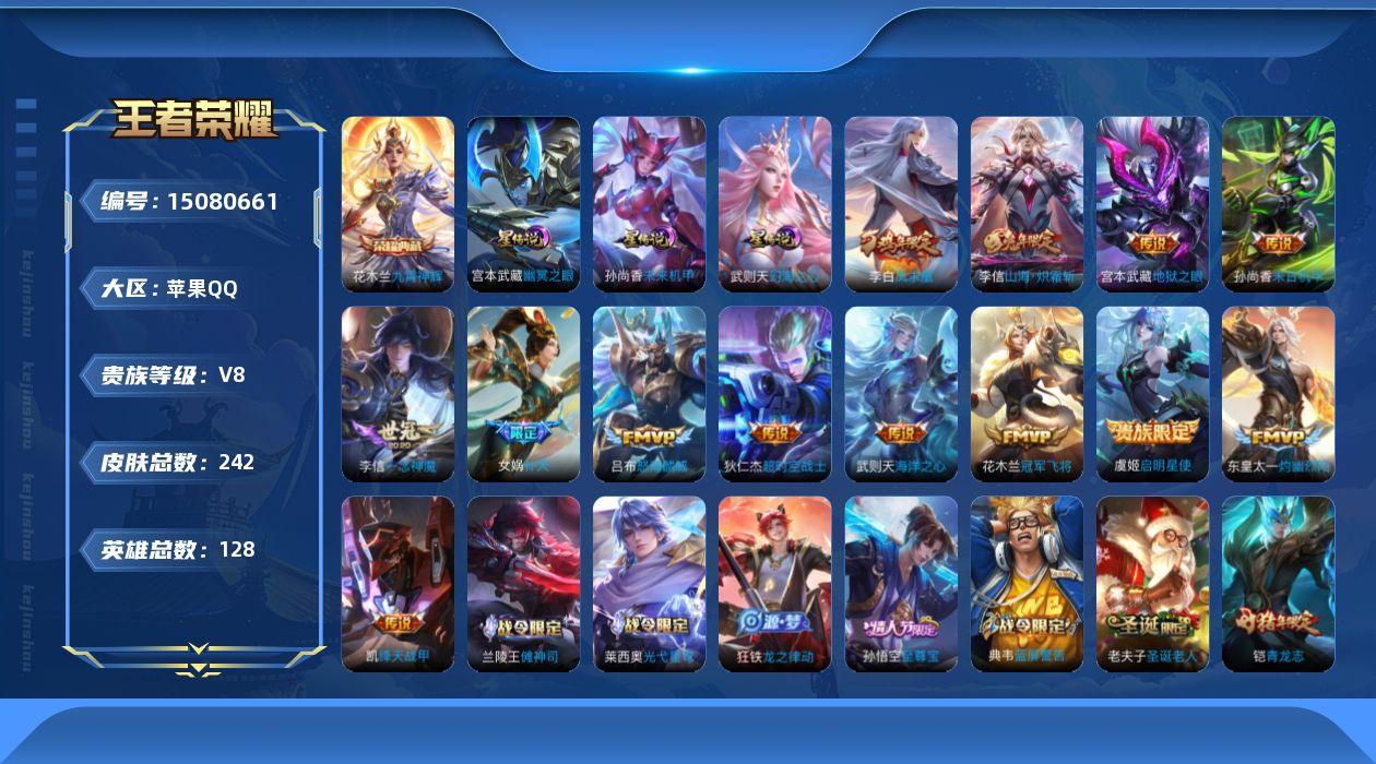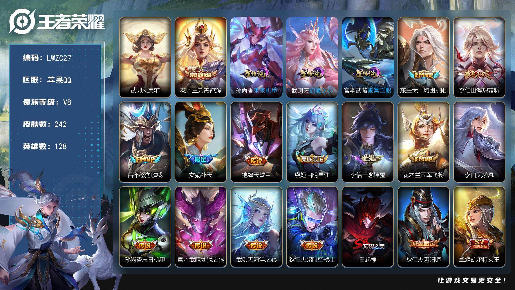 [15080661]【特价急出/详情看图】苹果Q-V8-最强王者段位-128英雄-242皮肤-1典藏皮肤-1典藏英雄-13传说-3星元-67史诗