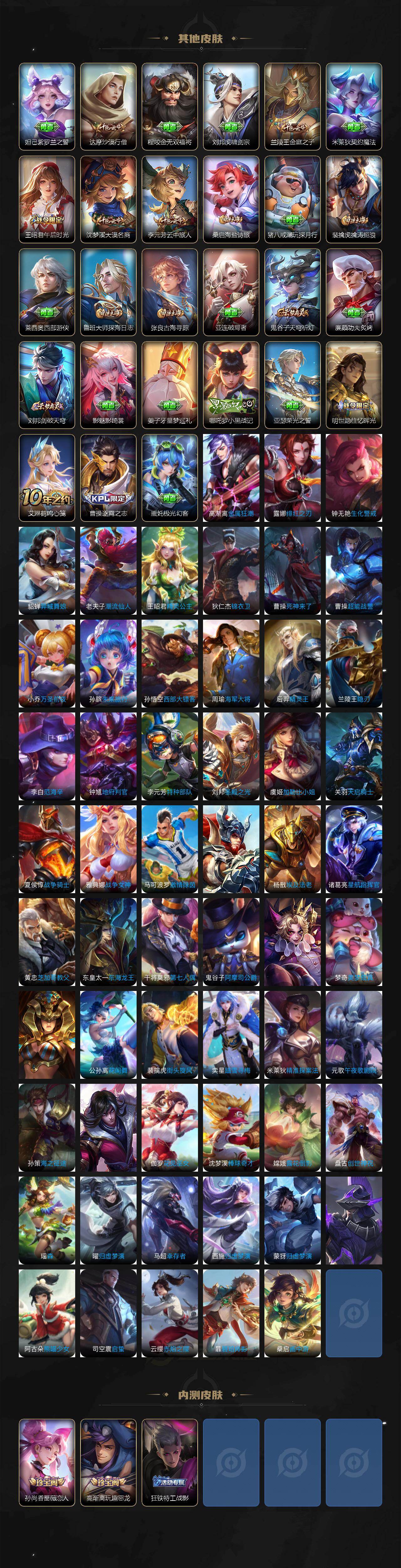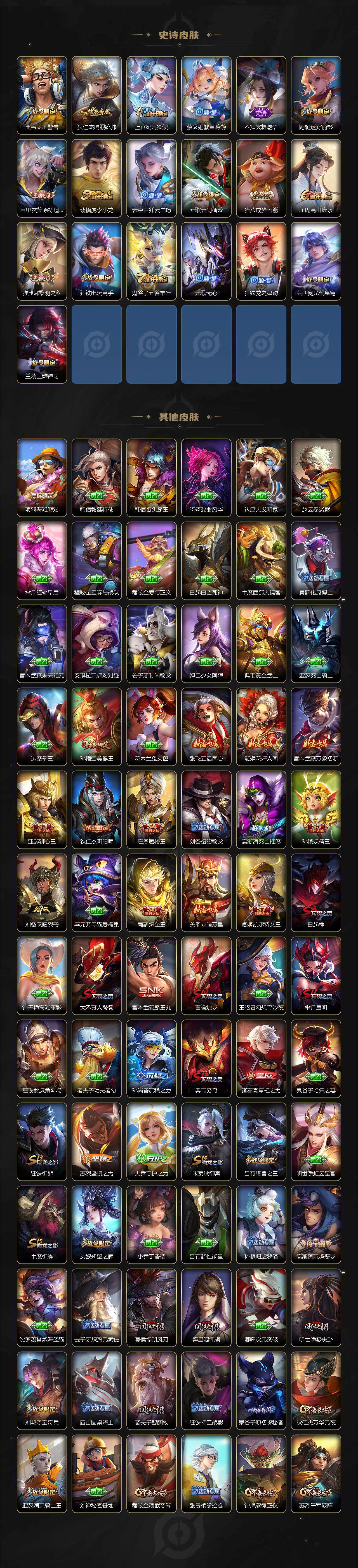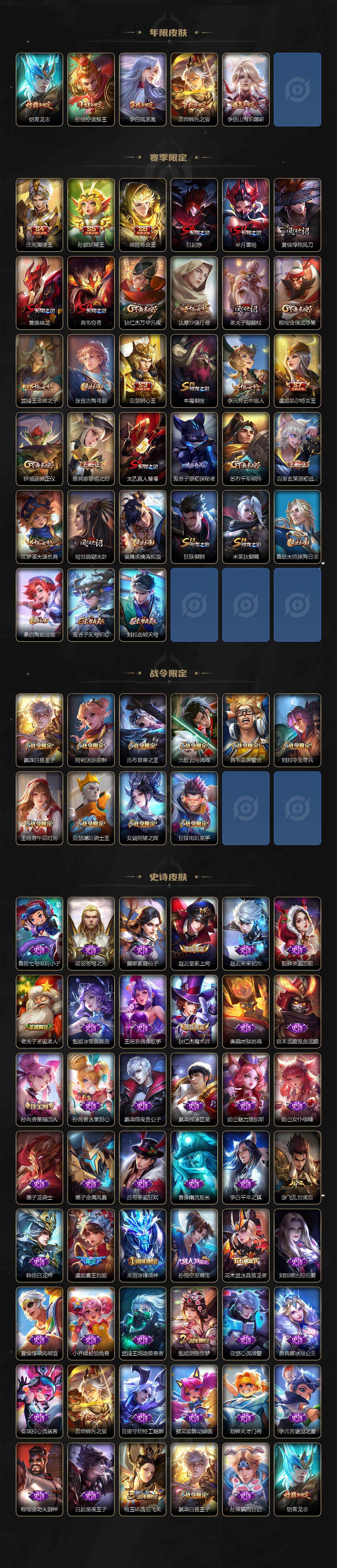 【限定皮肤】:白起狰,狄仁杰阴阳师,虞姬凯尔特女王,赵云皇家上将,嬴政白昼王子,孙尚香蔷薇恋人,庄周蜃楼王,庄周高山流水,高渐离死亡摇滚,高渐离玩趣恶龙,阿轲迷踪丽影,孙膑妖精王,扁鹊炼金王,芈月重明,吕布猎兽之王,元歌云间偶戏,元歌无心,夏侯惇朔风刀,甄姬游园惊梦,曹操烛龙,典韦穷奇,典韦蓝屏警告,狄仁杰魔术师,狄仁杰万华元夜,达摩沙漠行僧,项羽海滩派对,老夫子圣诞老人,老夫子醍醐杖,关羽冰锋战神,程咬金演武夺筹,刘邦夺宝奇兵,王昭君午后时光,兰陵王金庭之子,亚瑟狮心王,亚瑟潮玩骑士王,孙悟空美猴王,孙悟空至尊宝,牛魔御旌,后羿辉光之辰,李元芳云中旅人,虞姬霸王别姬,虞姬启明星使,钟馗驱傩正仪,杨玉环遇见飞天,女娲朔望之晖,女娲补天,雅典娜黎明之约,蔡文姬繁星吟游,太乙真人饕餮,鬼谷子原初探秘者,鬼谷子五谷丰年,铠青龙志,苏烈千军破阵,百里玄策原初追逐者,弈星混沌棋,沈梦溪大漠名商,明世隐疑决卦,裴擒虎李小龙,裴擒虎擒涛扼浪,狂铁御狮,狂铁电玩高手,米莱狄御霄,云中君纤云弄巧,李信山海炽霜斩,猪八戒猪悟能,上官婉儿梁祝,鲁班大师探海日志,桑启海盐诗旅,张良古海寻踪,鬼谷子天穹祈灯,刘邦剑破天穹