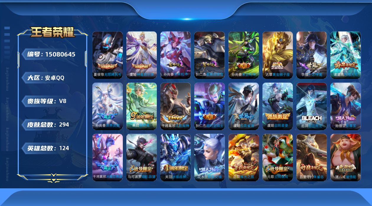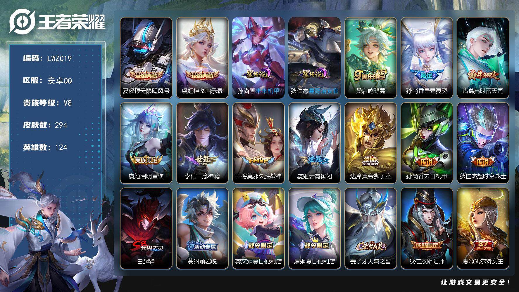 [15080645]【特价急出/详情看图】安卓Q-V8-永恒钻石III段位-124英雄-294皮肤-2典藏皮肤-10传说-2星元-95史诗