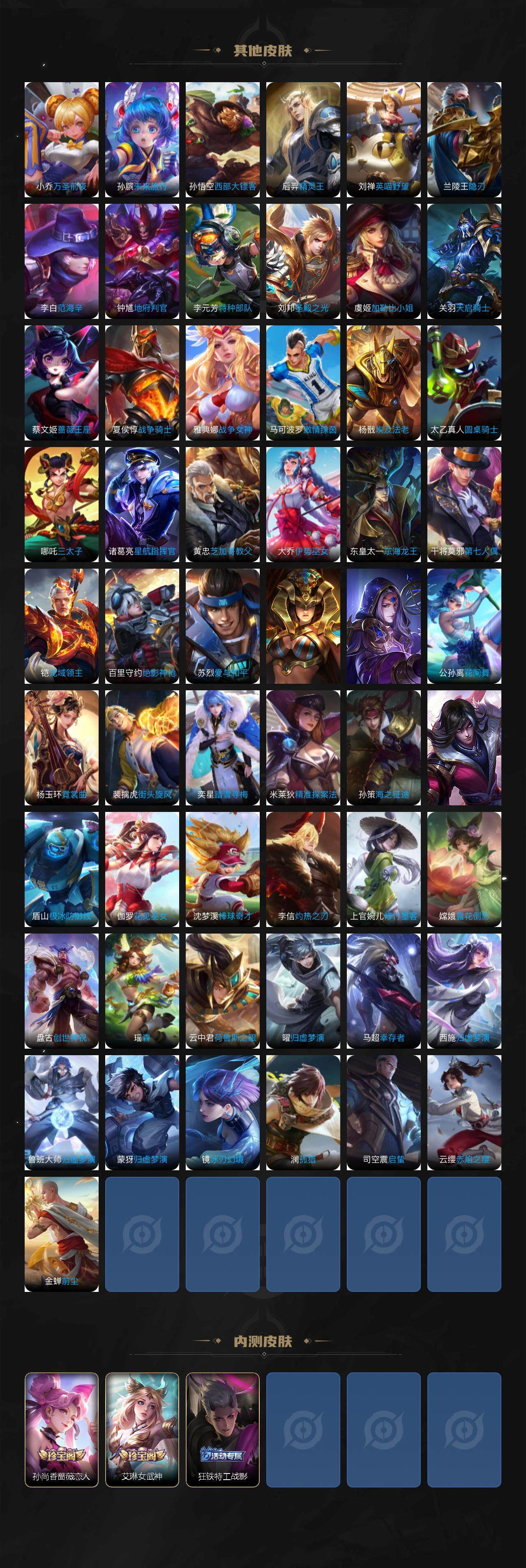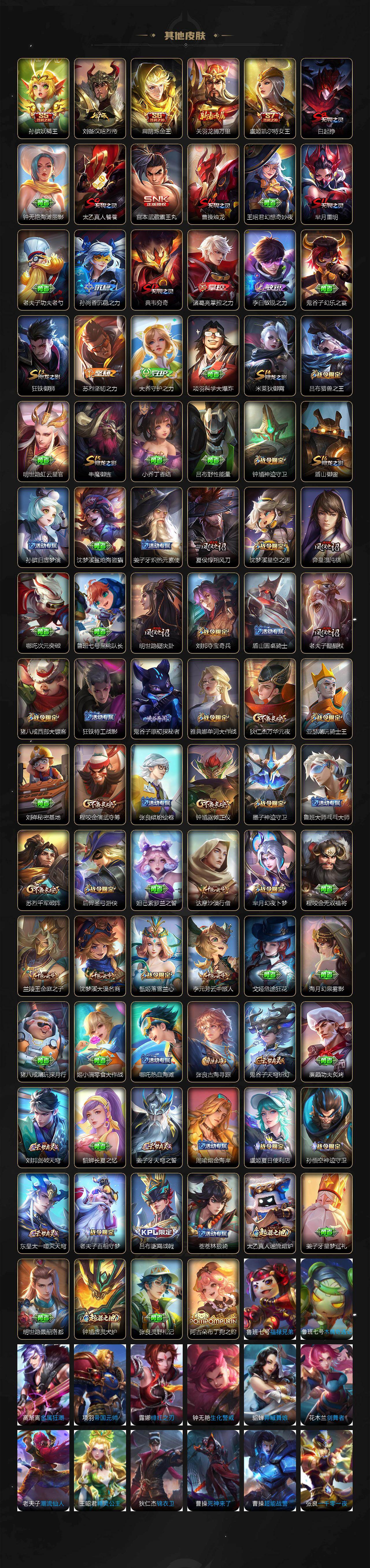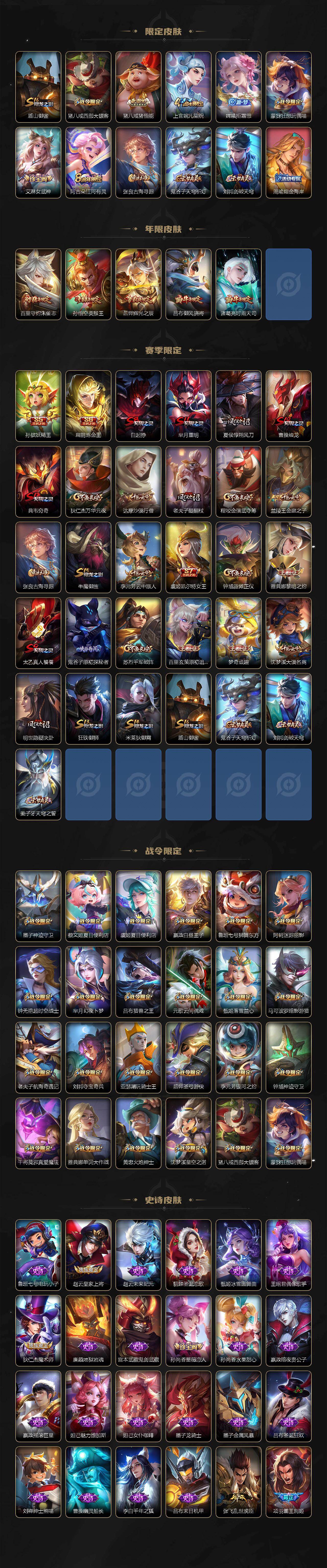 【限定皮肤】:白起狰,蒙犽顽岩魄,蔡文姬夏日便利店,虞姬夏日便利店,姜子牙天穹之誓,狄仁杰阴阳师,虞姬凯尔特女王,赵云皇家上将,墨子神迹守卫,墨子降魔,嬴政白昼王子,孙尚香蔷薇恋人,孙尚香异界灵契,鲁班七号狮舞东方,庄周高山流水,阿轲迷踪丽影,钟无艳超时空战士,孙膑妖精王,扁鹊炼金王,芈月重明,芈月幻夜卜梦,吕布猎兽之王,吕布御风骁将,元歌云间偶戏,元歌无心,夏侯惇朔风刀,甄姬游园惊梦,甄姬落雪兰心,曹操烛龙,典韦穷奇,马可波罗暗影游猎,狄仁杰魔术师,狄仁杰万华元夜,达摩沙漠行僧,项羽海滩派对,项羽霸王别姬,老夫子醍醐杖,老夫子航海奇遇记,关羽冰锋战神,程咬金演武夺筹,刘邦夺宝奇兵,韩信逐梦之影,兰陵王金庭之子,花木兰默契交锋,亚瑟潮玩骑士王,孙悟空美猴王,孙悟空至尊宝,牛魔御旌,后羿辉光之辰,后羿圣弓游侠,李元芳银河之约,李元芳匿光侦查者,李元芳云中旅人,虞姬霸王别姬,虞姬启明星使,钟馗神迹守卫,钟馗驱傩正仪,杨玉环遇见飞天,干将莫邪冰霜恋舞曲,干将莫邪真爱魔法,雅典娜单词大作战,雅典娜黎明之约,太乙真人饕餮,鬼谷子原初探秘者,鬼谷子五谷丰年,诸葛亮时雨天司,黄忠火炮绅士,苏烈千军破阵,百里玄策原初追逐者,百里守约朱雀志,弈星混沌棋,梦奇顽趣,沈梦溪星空之诺,沈梦溪大漠名商,明世隐疑决卦,裴擒虎李小龙,狂铁御狮,米莱狄御霄,盾山御銮,猪八戒西部大镖客,猪八戒猪悟能,上官婉儿梁祝,嫦娥拒霜思,蒙犽狂想玩偶喵,艾琳女武神,阿古朵江河有灵,张良古海寻踪,鬼谷子天穹祈灯,刘邦剑破天穹,周瑜熔金海岸