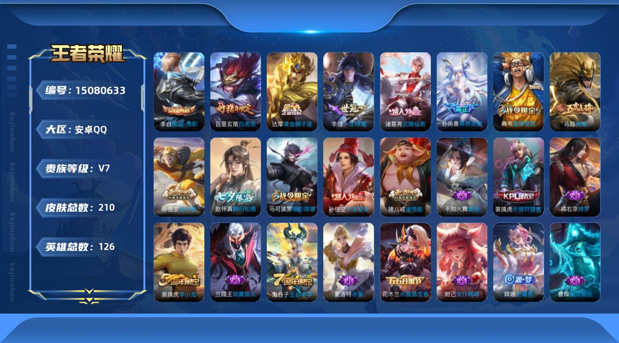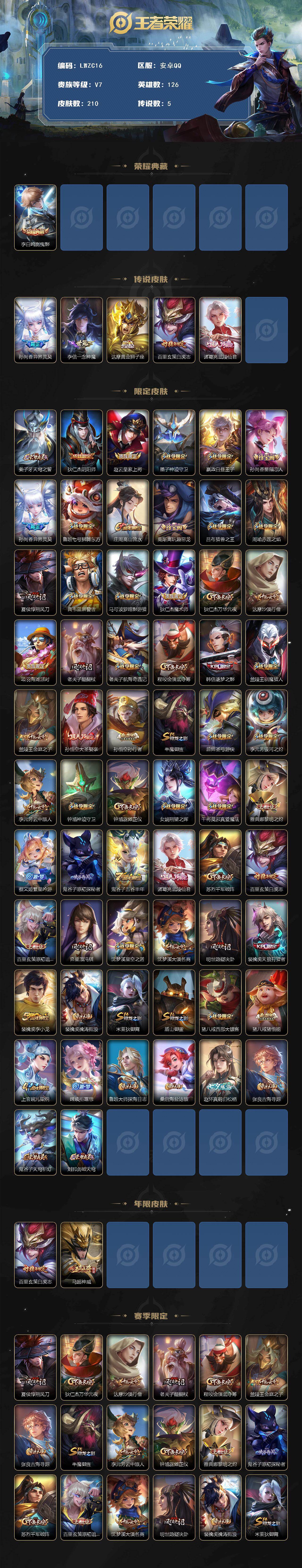 [15080633]可二次【特价出售/店主推荐】 安卓Q-V7-永恒钻石II段位-126英雄-210皮肤-1典藏皮肤-5传说-58史诗