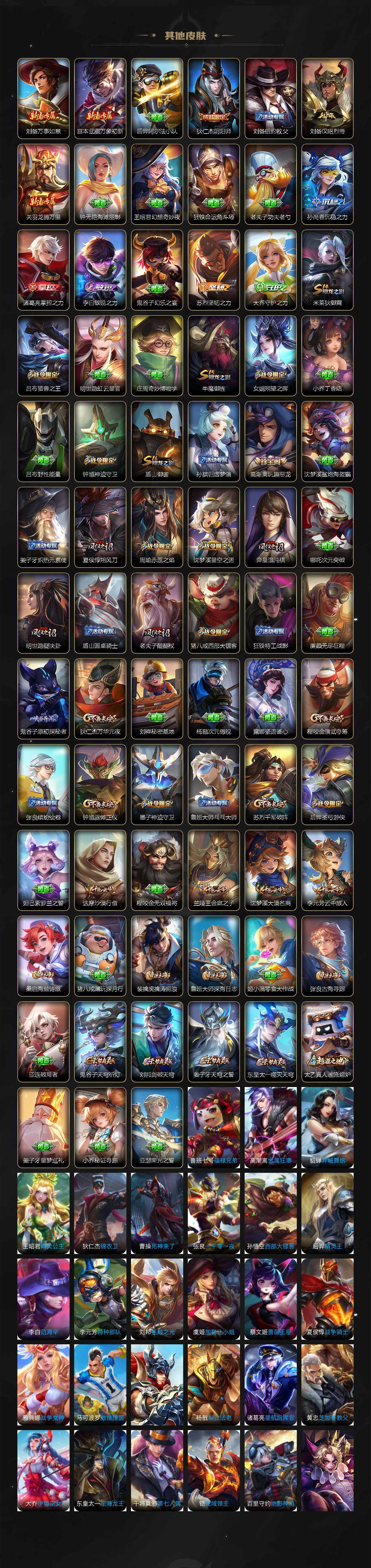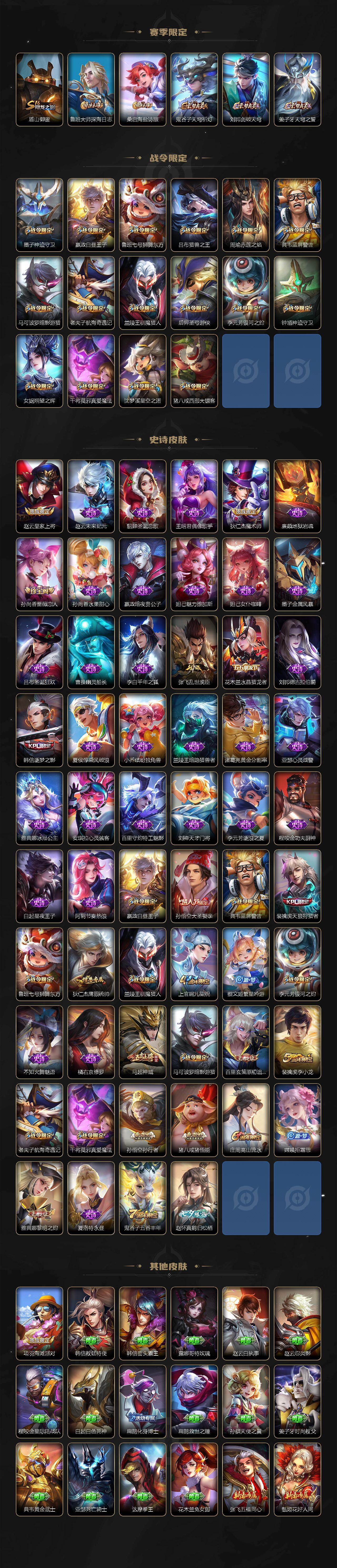 【限定皮肤】:姜子牙天穹之誓,狄仁杰阴阳师,赵云皇家上将,墨子神迹守卫,嬴政白昼王子,孙尚香蔷薇恋人,孙尚香异界灵契,鲁班七号狮舞东方,庄周高山流水,高渐离玩趣恶龙,吕布猎兽之王,周瑜赤莲之焰,夏侯惇朔风刀,典韦蓝屏警告,马可波罗暗影游猎,狄仁杰魔术师,狄仁杰万华元夜,达摩沙漠行僧,项羽海滩派对,老夫子醍醐杖,老夫子航海奇遇记,程咬金演武夺筹,韩信逐梦之影,兰陵王驯魔猎人,兰陵王金庭之子,孙悟空大圣娶亲,孙悟空孙行者,牛魔御旌,后羿圣弓游侠,李元芳银河之约,李元芳云中旅人,钟馗神迹守卫,钟馗驱傩正仪,女娲朔望之晖,干将莫邪真爱魔法,雅典娜黎明之约,蔡文姬繁星吟游,鬼谷子原初探秘者,鬼谷子五谷丰年,诸葛亮武陵仙君,苏烈千军破阵,百里玄策白虎志,百里玄策原初追逐者,弈星混沌棋,沈梦溪星空之诺,沈梦溪大漠名商,明世隐疑决卦,裴擒虎天狼狩猎者,裴擒虎李小龙,裴擒虎擒涛扼浪,米莱狄御霄,盾山御銮,猪八戒西部大镖客,猪八戒猪悟能,上官婉儿梁祝,嫦娥拒霜思,鲁班大师探海日志,桑启海盐诗旅,赵怀真鹤归松栖,张良古海寻踪,鬼谷子天穹祈灯,刘邦剑破天穹
