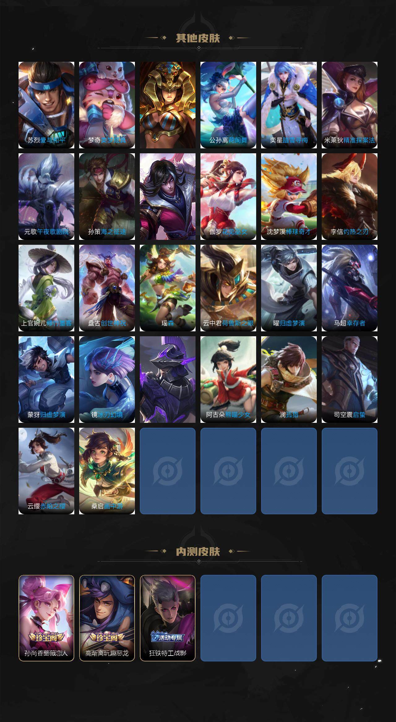 米莱狄御霄,牛魔御旌,盾山御銮,夏侯惇朔风刀,明世隐疑决卦,老夫子醍醐杖,鬼谷子原初探秘者,狄仁杰万华元夜,程咬金演武夺筹,钟馗驱傩正仪,苏烈千军破阵,吕布猎兽之王,嬴政白昼王子,女娲朔望之晖,典韦蓝屏警告,钟馗神迹守卫,鲁班七号狮舞东方,沈梦溪星空之诺,李元芳银河之约,马可波罗暗影游猎,弈星混沌棋,达摩沙漠行僧,兰陵王金庭之子,沈梦溪大漠名商,李元芳云中旅人,桑启海盐诗旅,裴擒虎擒涛扼浪,鲁班大师探海日志,张良古海寻踪