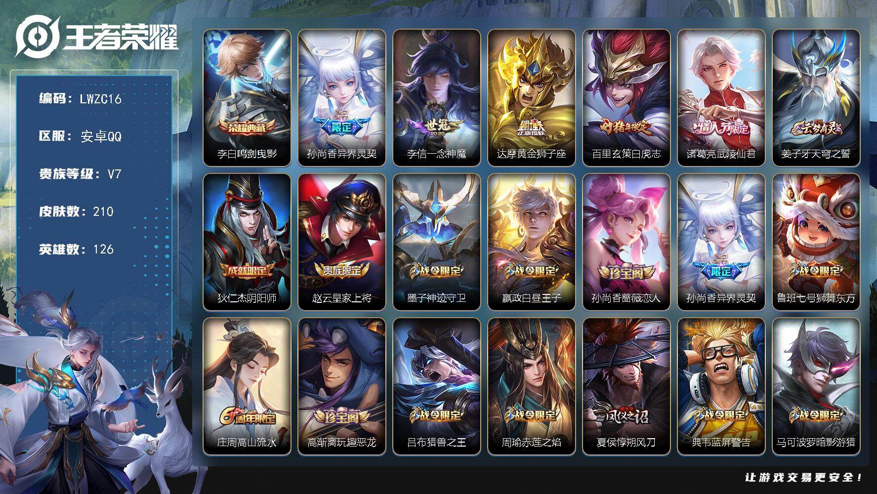 [15080633]可二次【特价出售/店主推荐】 安卓Q-V7-永恒钻石II段位-126英雄-210皮肤-1典藏皮肤-5传说-58史诗 【荣耀典藏】:李白鸣剑曳影 【传说皮肤】:孙尚香异界灵契,李信一念神魔,达摩黄金狮子座,百里玄策白虎志,诸葛亮武陵仙君 【限定皮肤】:姜子牙天穹之誓,狄仁杰阴阳师,赵云皇家上将,墨子神迹守卫,嬴政白昼王子,孙尚香蔷薇恋人,孙尚香异界灵契,鲁班七号狮舞东方,庄周高山流水,高渐离玩趣恶龙,吕布猎兽之王,周瑜赤莲之焰,夏侯惇朔风刀,典韦蓝屏警告,马可波罗暗影游猎,狄仁杰魔术师,狄仁杰万华元夜,达摩沙漠行僧,项羽海滩派对,老夫子醍醐杖,老夫子航海奇遇记,程咬金演武夺筹,韩信逐梦之影,兰陵王驯魔猎人,兰陵王金庭之子,孙悟空大圣娶亲,孙悟空孙行者,牛魔御旌,后羿圣弓游侠,李元芳银河之约,李元芳云中旅人,钟馗神迹守卫,钟馗驱傩正仪,女娲朔望之晖,干将莫邪真爱魔法,雅典娜黎明之约,蔡文姬繁星吟游,鬼谷子原初探秘者,鬼谷子五谷丰年,诸葛亮武陵仙君,苏烈千军破阵,百里玄策白虎志,百里玄策原初追逐者,弈星混沌棋,沈梦溪星空之诺,沈梦溪大漠名商,明世隐疑决卦,裴擒虎天狼狩猎者,裴擒虎李小龙,裴擒虎擒涛扼浪,米莱狄御霄,盾山御銮,猪八戒西部大镖客,猪八戒猪悟能,上官婉儿梁祝,嫦娥拒霜思,鲁班大师探海日志,桑启海盐诗旅,赵怀真鹤归松栖,张良古海寻踪,鬼谷子天穹祈灯,刘邦剑破天穹 【年限皮肤】:百里玄策白虎志,马超神威 【赛季限定】:夏侯惇朔风刀,狄仁杰万华元夜,达摩沙漠行僧,老夫子醍醐杖,程咬金演武夺筹,兰陵王金庭之子,张良古海寻踪,牛魔御旌,李元芳云中旅人,钟馗驱傩正仪,雅典娜黎明之约,鬼谷子原初探秘者,苏烈千军破阵,百里玄策原初追逐者,弈星混沌棋,沈梦溪大漠名商,明世隐疑决卦,裴擒虎擒涛扼浪,米莱狄御霄,盾山御銮,鲁班大师探海日志,桑启海盐诗旅,鬼谷子天穹祈灯,刘邦剑破天穹,姜子牙天穹之誓 【战令限定】:墨子神迹守卫,嬴政白昼王子,鲁班七号狮舞东方,吕布猎兽之王,周瑜赤莲之焰,典韦蓝屏警告,马可波罗暗影游猎,老夫子航海奇遇记,兰陵王驯魔猎人,后羿圣弓游侠,李元芳银河之约,钟馗神迹守卫,女娲朔望之晖,干将莫邪真爱魔法,沈梦溪星空之诺,猪八戒西部大镖客 【史诗皮肤】:赵云皇家上将,赵云未来纪元,貂蝉圣诞恋歌,王昭君偶像歌手,狄仁杰魔术师,廉颇地狱岩魂,孙尚香蔷薇恋人,孙尚香水果