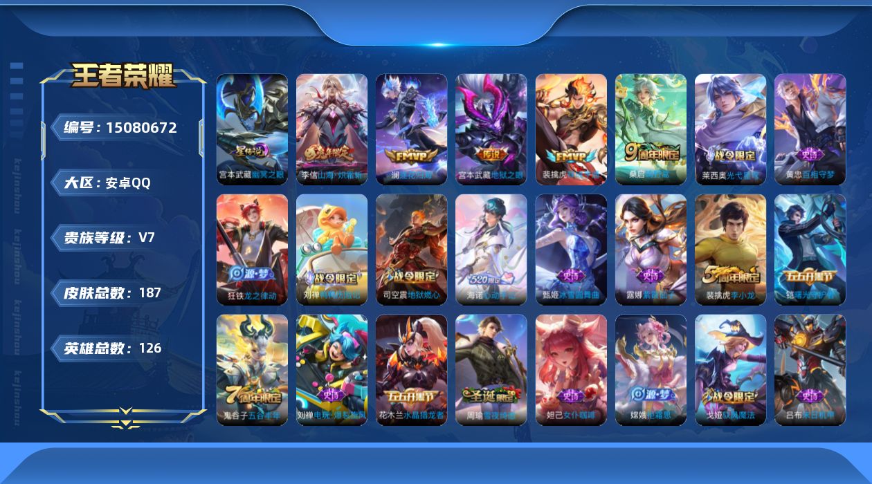 - [12928807]安卓Q-V0-最强王者段位-126英雄-184皮肤-1典藏-2传说-51史诗 【英雄全皮】:空空儿全皮 【荣耀典藏】:关羽赤影疾锋 【传说皮肤】:桑启鸣野蒿,孙悟空地狱火 【限定皮肤】:姜子牙天穹之誓,狄仁杰阴阳师,赵云皇家上将,嬴政优雅恋人,孙尚香蔷薇恋人,鲁班七号狮舞东方,庄周高山流水,芈月重明,元歌云间偶戏,夏侯惇朔风刀,曹操烛龙,典韦穷奇,典韦蓝屏警告,狄仁杰魔术师,狄仁杰万华元夜,达摩沙漠行僧,项羽海滩派对,老夫子醍醐杖,程咬金演武夺筹,兰陵王金庭之子,亚瑟潮玩骑士王,孙悟空至尊宝,牛魔御旌,钟馗神迹守卫,钟馗驱傩正仪,女娲朔望之晖,雅典娜黎明之约,鬼谷子原初探秘者,苏烈千军破阵,百里玄策原初追逐者,弈星混沌棋,梦奇顽趣,沈梦溪大漠名商,明世隐疑决卦,裴擒虎李小龙,裴擒虎擒涛扼浪,米莱狄御霄,盾山御銮,猪八戒猪悟能,上官婉儿梁祝,嫦娥拒霜思,鲁班大师探海日志,阿古朵江河有灵,张良古海寻踪,蒙恬荣光圣徽,鬼谷子天穹祈灯,沈梦溪龙舞盛年,刘邦剑破天穹,程咬金群星魔术团,周瑜熔金海岸 【赛季限定】:芈月重明,夏侯惇朔风刀,曹操烛龙,典韦穷奇,狄仁杰万华元夜,达摩沙漠行僧,老夫子醍醐杖,程咬金演武夺筹,兰陵王金庭之子,张良古海寻踪,牛魔御旌,钟馗驱傩正仪,雅典娜黎明之约,鬼谷子原初探秘者,苏烈千军破阵,百里玄策原初追逐者,弈星混沌棋,梦奇顽趣,沈梦溪大漠名商,明世隐疑决卦,裴擒虎擒涛扼浪,米莱狄御霄,盾山御銮,鲁班大师探海日志,鬼谷子天穹祈灯,蒙恬荣光圣徽,刘邦剑破天穹,姜子牙天穹之誓 【战令限定】:鲁班七号狮舞东方,元歌云间偶戏,典韦蓝屏警告,亚瑟潮玩骑士王,钟馗神迹守卫,女娲朔望之晖 【史诗皮肤】:鲁班七号电玩小子,露娜紫霞仙子,阿轲暗夜猫娘,赵云皇家上将,赵云未来纪元,貂蝉圣诞恋歌,狄仁杰魔术师,宫本武藏鬼剑武藏,孙尚香蔷薇恋人,孙尚香水果甜心,嬴政优雅恋人,妲己魅力维加斯,妲己女仆咖啡,墨子金属风暴,吕布圣诞狂欢,刘禅绅士熊喵,曹操幽灵船长,吕布末日机甲,韩信白龙吟,孙悟空至尊宝,花木兰水晶猎龙者,刘邦德古拉伯爵,夏侯惇乘风破浪,小乔缤纷独角兽,兰陵王暗隐猎兽者,诸葛亮黄金分割率,亚瑟心灵战警,百里守约特工魅影,铠曙光守护者,蔡文姬舞动绿茵,程咬金功夫厨神,白起星夜王子,典韦蓝屏警告,鲁班七号狮舞东方,狄仁杰鹰眼统帅,上官婉儿梁祝,百里玄策原初追逐者,裴