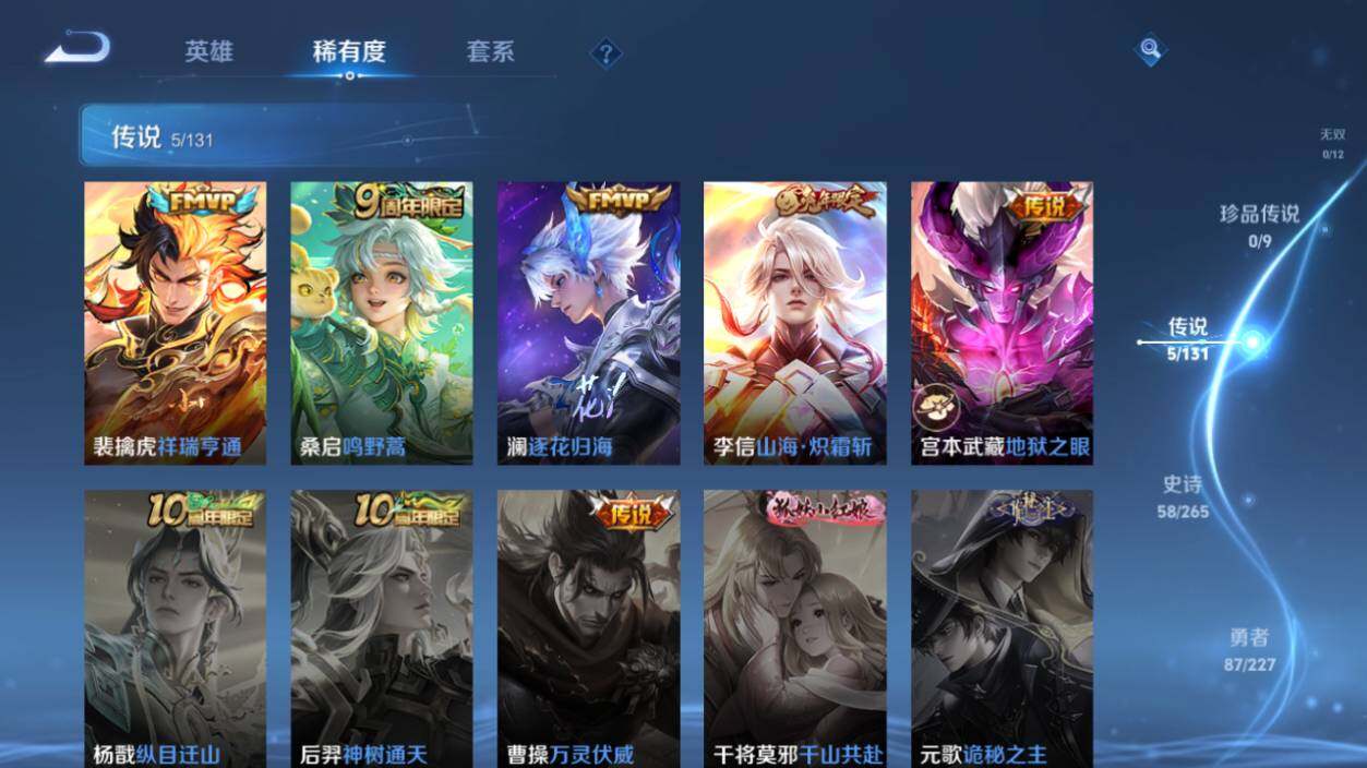【传说皮肤】:裴擒虎祥瑞亨通,桑启鸣野蒿,澜逐花归海,李信山海炽霜斩,宫本武藏地狱之眼