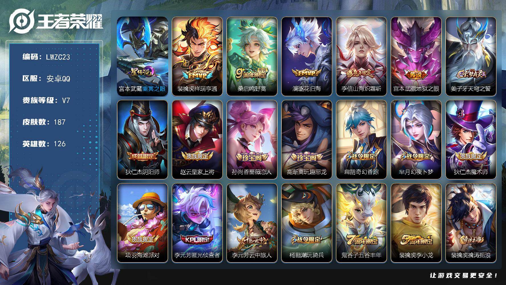 - [15259361]游走36段,【店主推荐捡漏号!可直接换绑】,安卓Q-V8-最强王者段位-127英雄-324皮肤-2典藏-1无双-3珍品传说-11传说-105史诗 【英雄全皮】:孙权全皮,瑶全皮,戈娅全皮,影全皮,少司缘全皮 【荣耀典藏】:小乔天鹅之梦,瑶拾光映像 【无双皮肤】:瑶真我赫兹 【珍品传说】:马可波罗怪盗基德,瑶大耳狗之梦,安琪拉酷洛米之心 【传说皮肤】:后羿神树通天,女娲愿照千秋盛,妲己愿照众生和,云缨幻光神枪,桑启鸣野蒿,瑶时之祈愿,孙尚香异界灵契,貂蝉遇见胡旋,西施游龙清影,虞姬启明星使,干将莫邪久胜战神 【限定皮肤】:白起狰,蔡文姬夏日便利店,大乔绒语心约,虞姬夏日便利店,姜子牙天穹之誓,杨戬破阵退雄兵,狄仁杰阴阳师,赵云皇家上将,墨子神迹守卫,嬴政优雅恋人,孙尚香蔷薇恋人,孙尚香异界灵契,鲁班七号狮舞东方,鲁班七号乒乒小将,庄周高山流水,孙膑寅虎展翼,白起夜都怪侠,芈月重明,芈月幻夜卜梦,元歌无心,甄姬女儿国国王,曹操烛龙,典韦穷奇,马可波罗暗影游猎,狄仁杰魔术师,狄仁杰万华元夜,达摩沙漠行僧,项羽海滩派对,老夫子醍醐杖,老夫子航海奇遇记,貂蝉遇见胡旋,兰陵王金庭之子,花木兰青春决赛季,后羿圣弓游侠,李元芳云中旅人,虞姬启明星使,钟馗驱傩正仪,杨玉环遇见飞天,杨戬潮玩骑兵,女娲朔望之晖,干将莫邪真爱魔法,太乙真人饕餮,鬼谷子五谷丰年,黄忠火炮绅士,苏烈千军破阵,百里玄策原初追逐者,梦奇顽趣,沈梦溪大漠名商,明世隐疑决卦,明世隐吟游魔法,裴擒虎擒涛扼浪,瑶时之祈愿,瑶山海碧波行,云中君纤云弄巧,上官婉儿梁祝,上官婉儿神器万象笔,嫦娥拒霜思,嫦娥暖冬兔眠,西施玲珑珍味,西施至美乘鲤谣,蒙犽狂想玩偶喵,鲁班大师探海日志,镜匿光追影者,桑启海盐诗旅,暃星界游侠,戈娅驭风魔法,阿古朵江河有灵,张良古海寻踪,蒙犽百解令,蒙恬荣光圣徽,鬼谷子天穹祈灯,伽罗琥珀纪元,沈梦溪龙舞盛年,鲁班七号蔬乡物语,李元芳蔬乡物语,刘邦剑破天穹,程咬金群星魔术团,镜青焰无极,项羽苍威无极,周瑜熔金海岸 【年限皮肤】:孙膑寅虎展翼,瑶山海碧波行 【赛季限定】:白起狰,芈月重明,曹操烛龙,典韦穷奇,狄仁杰万华元夜,达摩沙漠行僧,老夫子醍醐杖,兰陵王金庭之子,张良古海寻踪,李元芳云中旅人,钟馗驱傩正仪,太乙真人饕餮,苏烈千军破阵,百里玄策原初追逐者,梦奇顽趣,沈梦溪大漠名商,明世隐疑决卦,裴擒虎擒