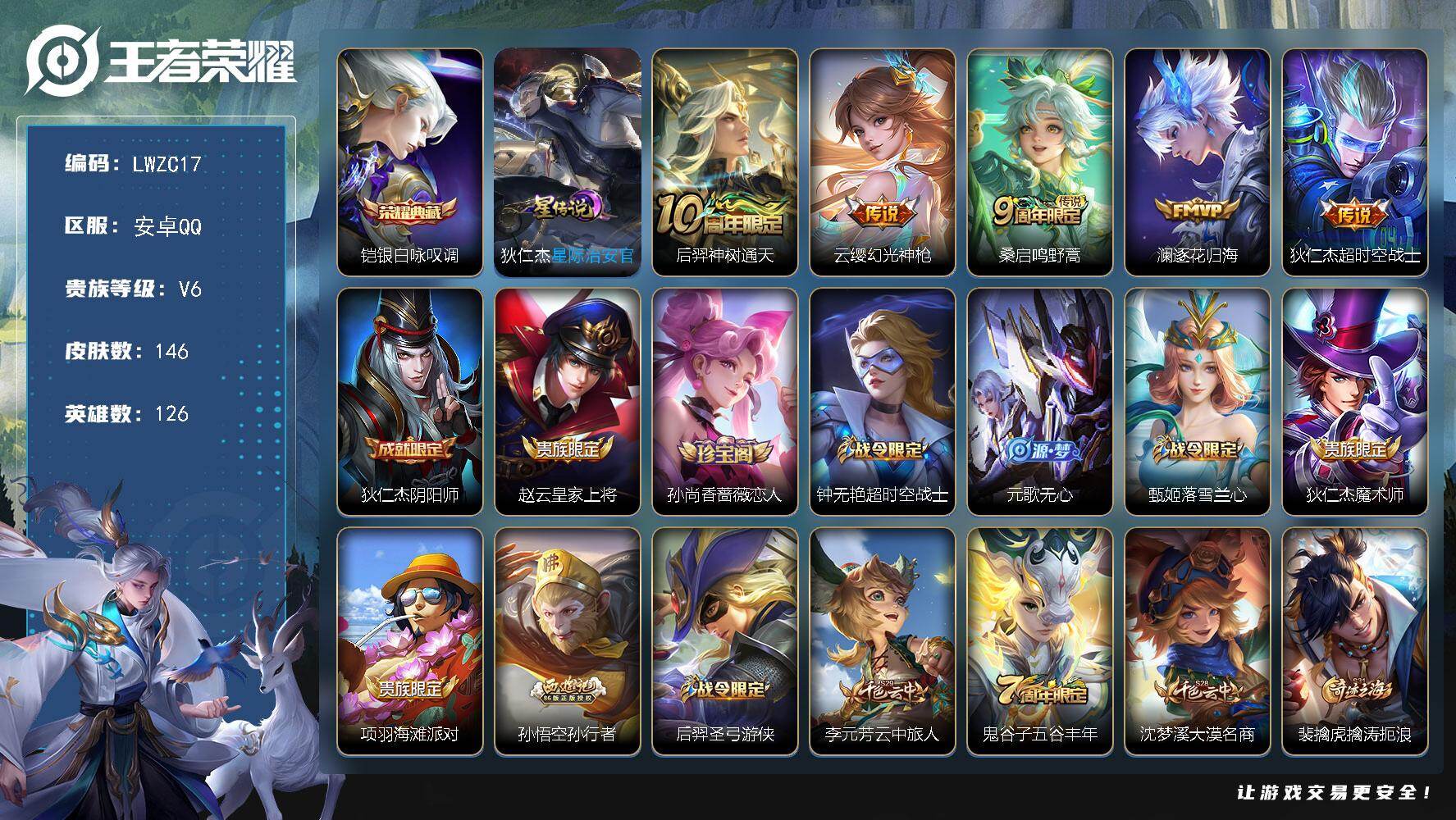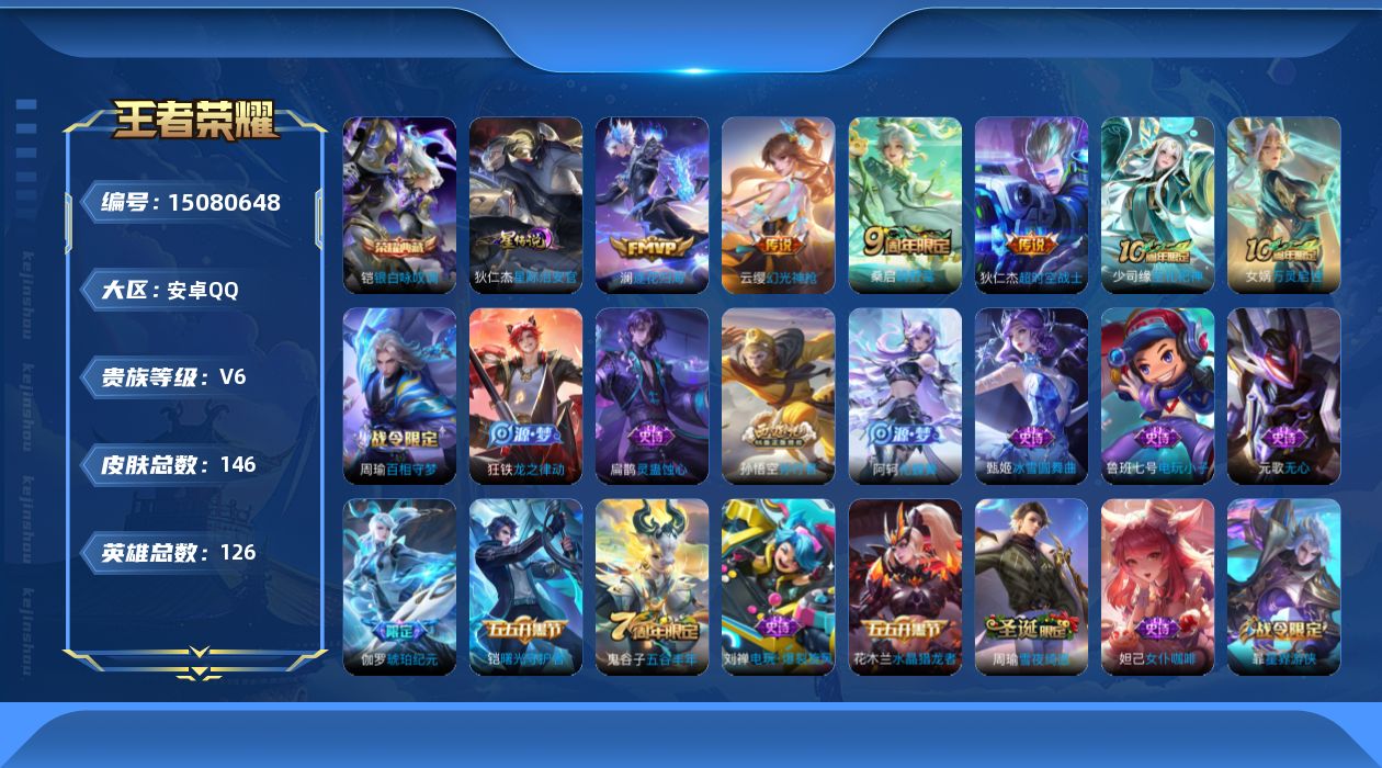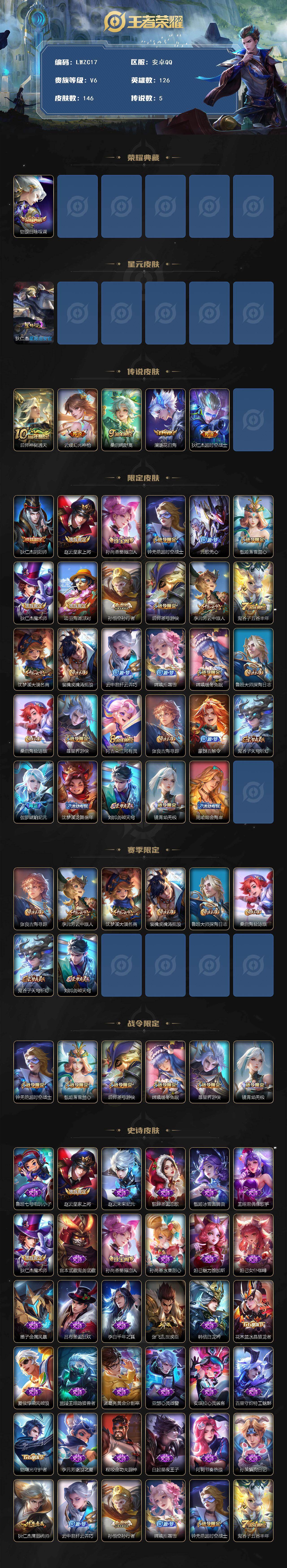 [15080648]【特价出售/店主推荐】安卓Q-V6-最强王者段位-126英雄-146皮肤-1典藏皮肤-1星传说-5传说-51史诗