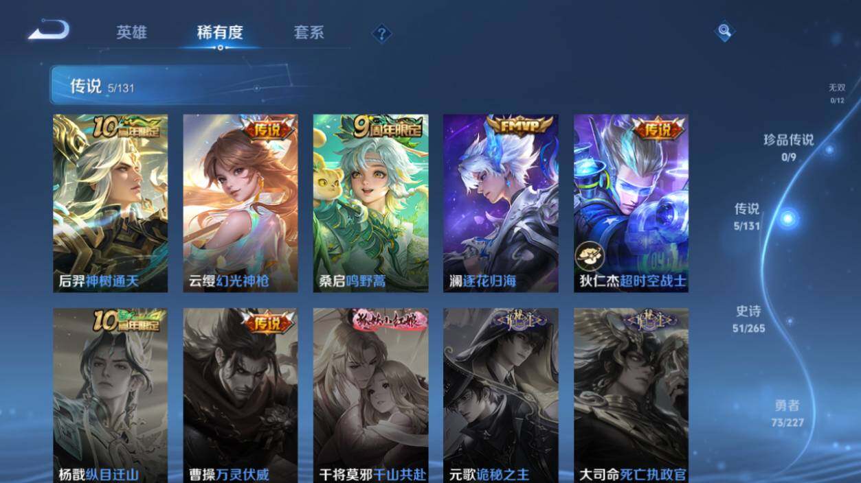 【传说皮肤】:后羿神树通天,云缨幻光神枪,桑启鸣野蒿,澜逐花归海,狄仁杰超时空战士