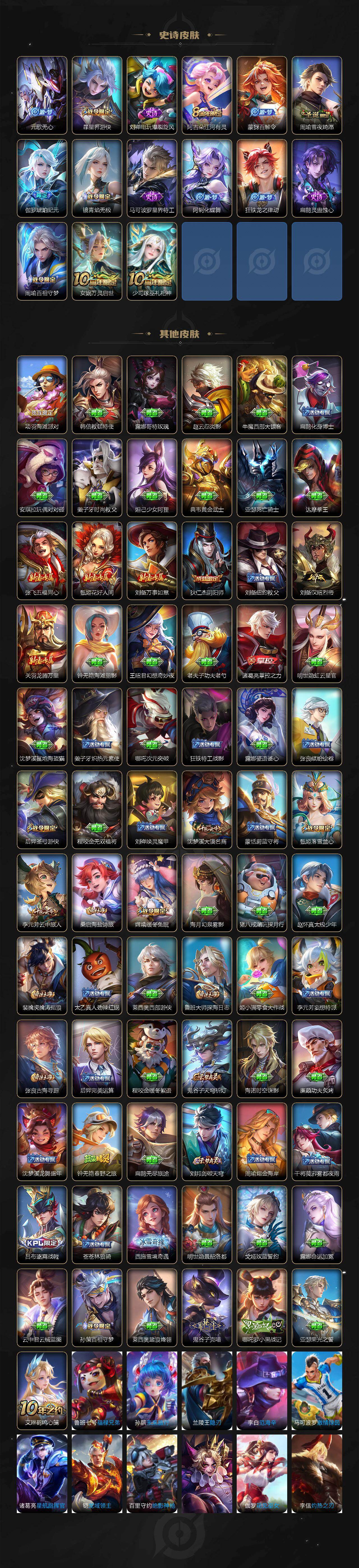 【史诗皮肤】:鲁班七号电玩小子,赵云皇家上将,赵云未来纪元,貂蝉圣诞恋歌,甄姬冰雪圆舞曲,王昭君偶像歌手,狄仁杰魔术师,宫本武藏鬼剑武藏,孙尚香蔷薇恋人,孙尚香水果甜心,妲己魅力维加斯,妲己女仆咖啡,墨子金属风暴,吕布圣诞狂欢,李白千年之狐,张飞乱世虎臣,韩信白龙吟,花木兰水晶猎龙者,夏侯惇乘风破浪,兰陵王暗隐猎兽者,诸葛亮黄金分割率,亚瑟心灵战警,安琪拉心灵骇客,百里守约特工魅影,铠曙光守护者,李元芳逐浪之夏,程咬金功夫厨神,白起星夜王子,阿轲节奏热浪,孙策猫狗日记,狄仁杰鹰眼统帅,云中君纤云弄巧,孙悟空孙行者,嫦娥拒霜思,钟无艳超时空战士,鬼谷子五谷丰年,元歌无心,暃星界游侠,刘禅电玩爆裂旋风,阿古朵江河有灵,蒙犽百解令,周瑜雪夜绮愿,伽罗琥珀纪元,镜青焰无极,马可波罗星界特工,阿轲化蝶舞,狂铁龙之律动,扁鹊灵蛊蚀心,周瑜百相守梦,女娲万灵启世,少司缘巫礼祀神