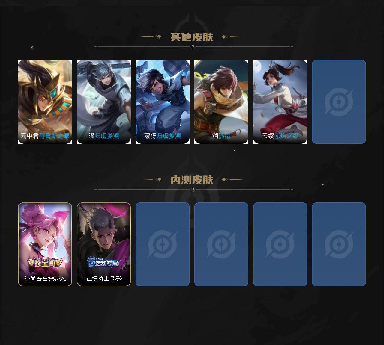 【其他皮肤】:项羽海滩派对,韩信教廷特使,露娜哥特玫瑰,赵云忍炎影,牛魔西部大镖客,扁鹊化身博士,安琪拉玩偶对对碰,姜子牙时尚教父,妲己少女阿狸,典韦黄金武士,亚瑟死亡骑士,达摩拳王,张飞五福同心,甄姬花好人间,刘备万事如意,狄仁杰阴阳师,刘备纽约教父,刘备汉昭烈帝,关羽龙腾万里,钟无艳海滩丽影,王昭君幻想奇妙夜,老夫子功夫