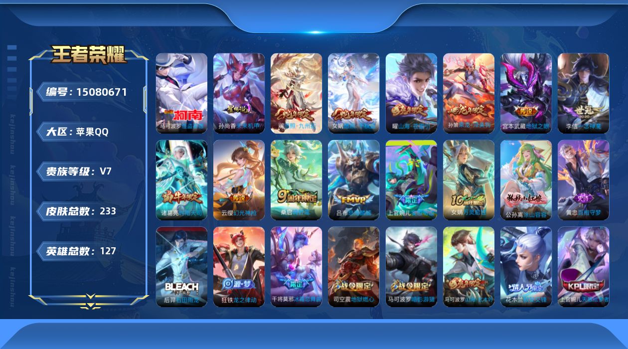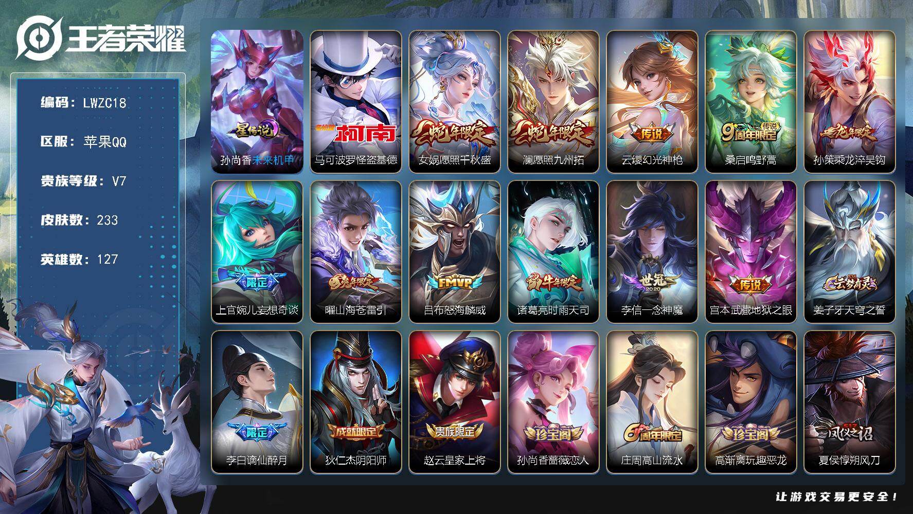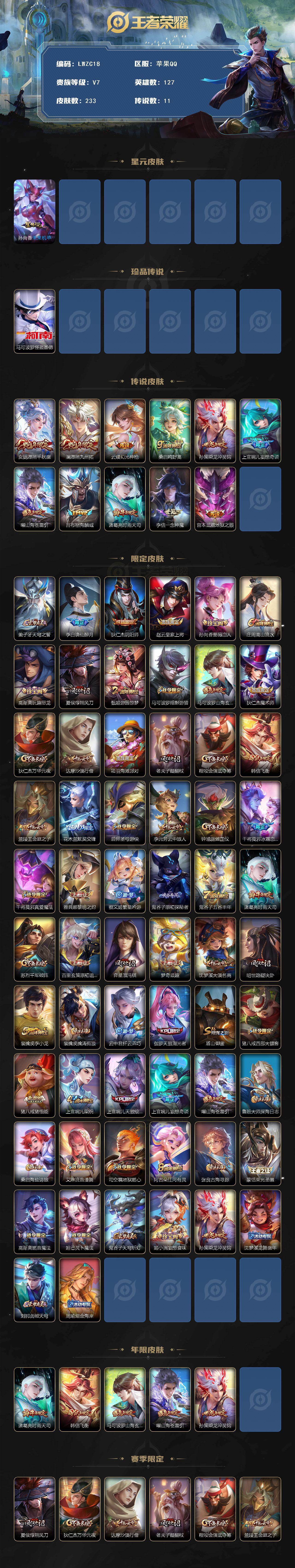 [15080671]【特价急出/详情看图】苹果Q-V7-最强王者段位-127英雄-233皮肤-1珍品传说-11传说-1星元-63史诗