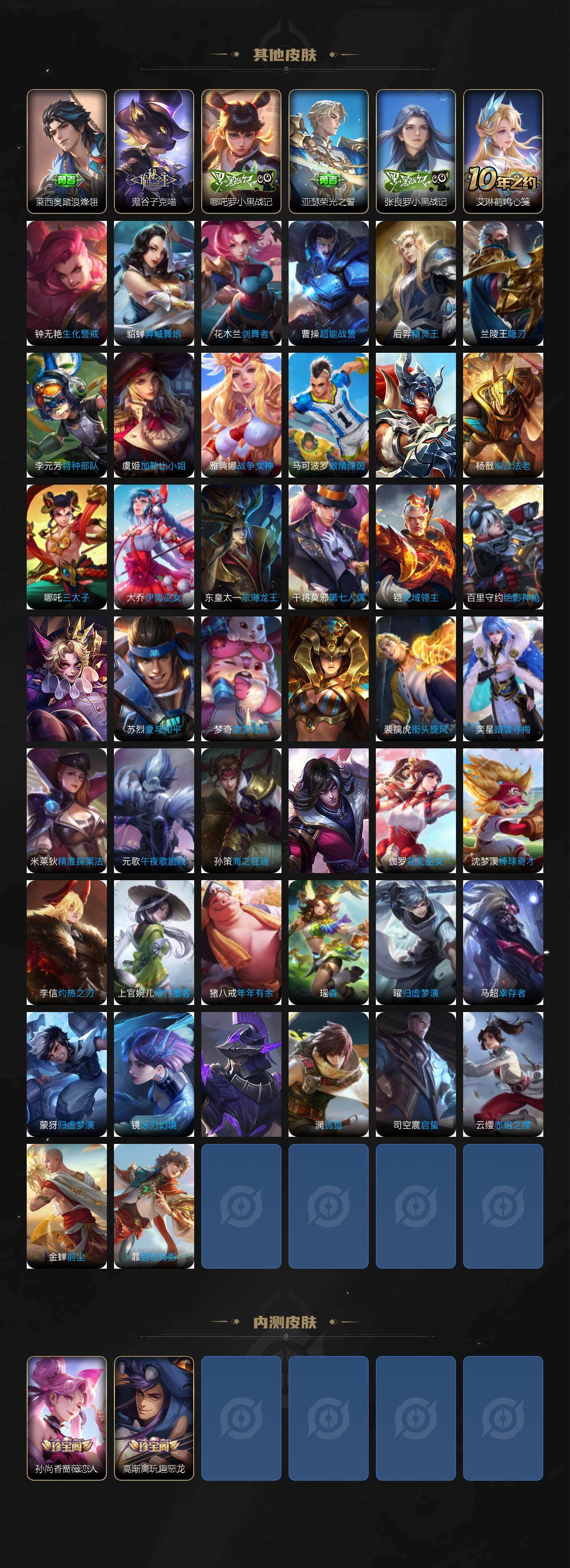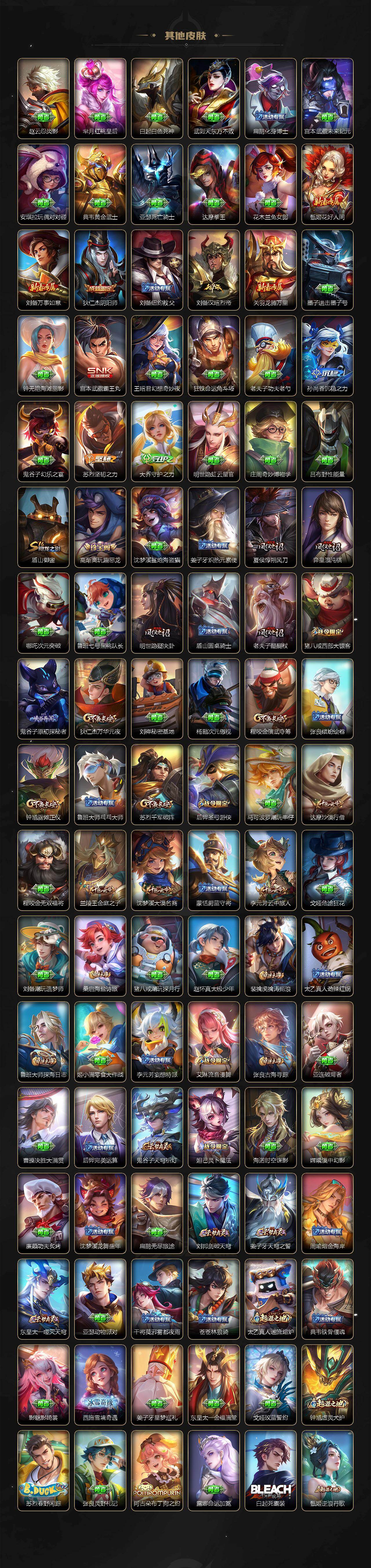 【限定皮肤】:姜子牙天穹之誓,李白谪仙醉月,狄仁杰阴阳师,赵云皇家上将,孙尚香蔷薇恋人,庄周高山流水,高渐离玩趣恶龙,夏侯惇朔风刀,甄姬游园惊梦,马可波罗暗影游猎,马可波罗山海玄木吟,狄仁杰魔术师,狄仁杰万华元夜,达摩沙漠行僧,项羽海滩派对,老夫子醍醐杖,程咬金演武夺筹,韩信飞衡,兰陵王金庭之子,花木兰默契交锋,后羿圣弓游侠,李元芳云中旅人,钟馗驱傩正仪,干将莫邪冰霜恋舞曲,干将莫邪真爱魔法,雅典娜黎明之约,蔡文姬繁星吟游,鬼谷子原初探秘者,鬼谷子五谷丰年,诸葛亮时雨天司,苏烈千军破阵,百里玄策原初追逐者,弈星混沌棋,梦奇顽趣,沈梦溪大漠名商,明世隐疑决卦,裴擒虎李小龙,裴擒虎擒涛扼浪,云中君纤云弄巧,伽罗天狼溯光者,盾山御銮,猪八戒西部大镖客,猪八戒猪悟能,上官婉儿梁祝,上官婉儿天狼绘梦者,上官婉儿妄想奇谈,曜山海苍雷引,鲁班大师探海日志,桑启海盐诗旅,艾琳流音漫舞,司空震地狱燃心,阿古朵江河有灵,张良古海寻踪,蒙恬荣光圣徽,高渐离燃音魔法,妲己灵卜魔法,鬼谷子天穹祈灯,姬小满妄想食味,孙策乘龙淬吴钩,沈梦溪龙舞盛年,刘邦剑破天穹,周瑜熔金海岸