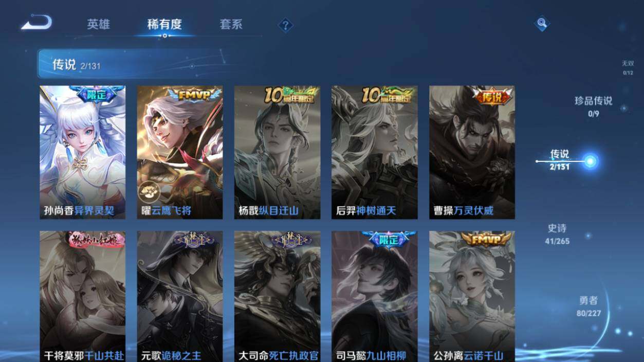 【限定皮肤】:狄仁杰阴阳师,赵云皇家上将,赵云龙胆,孙尚香蔷薇恋人,孙尚香异界灵契,庄周高山流水,芈月重明,吕布御风骁将,周瑜赤莲之焰,夏侯惇朔风刀,甄姬游园惊梦,典韦穷奇,马可波罗暗影游猎,狄仁杰魔术师,狄仁杰万华元夜,达摩沙漠行僧,项羽海滩派对,老夫子醍醐杖,程咬金演武夺筹,兰陵王驯魔猎人,兰陵王金庭之子,花木兰青春决赛季,孙悟空至尊宝,孙悟空大圣娶亲,牛魔御旌,后羿圣弓游侠,李元芳银河之约,李元芳云中旅人,钟馗驱傩正仪,干将莫邪冰霜恋舞曲,干将莫邪真爱魔法,雅典娜单词大作战,蔡文姬繁星吟游,鬼谷子原初探秘者,苏烈千军破阵,弈星混沌棋,沈梦溪星空之诺,明世隐疑决卦,裴擒虎李小龙,狂铁御狮,米莱狄御霄,云中君纤云弄巧,盾山御銮,猪八戒西部大镖客,上官婉儿梁祝,嫦娥拒霜思,蒙犽狂想玩偶喵,桑启海盐诗旅,鬼谷子天穹祈灯,刘邦剑破天穹